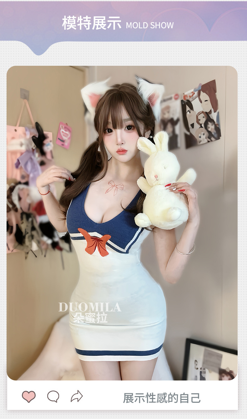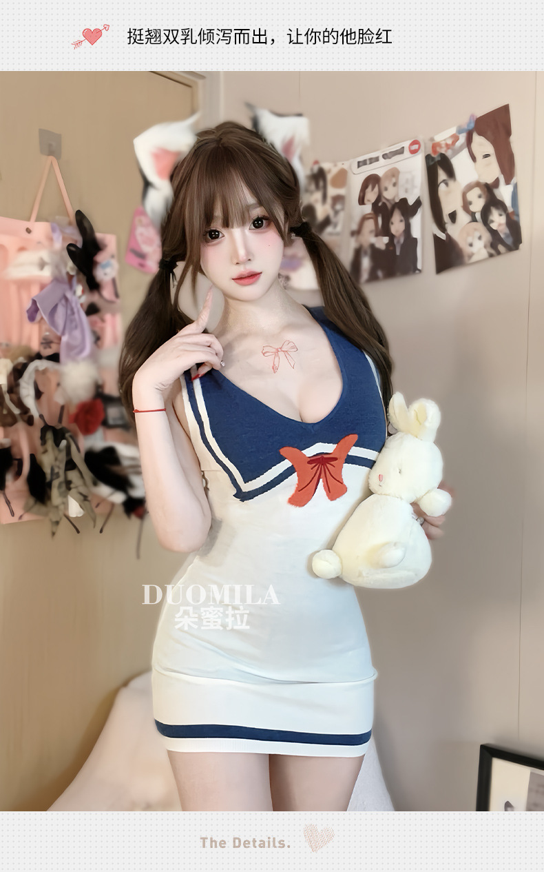 朵蜜拉纯欲甜美海军风低领深v印花针织修身显瘦情趣内衣连衣裙
