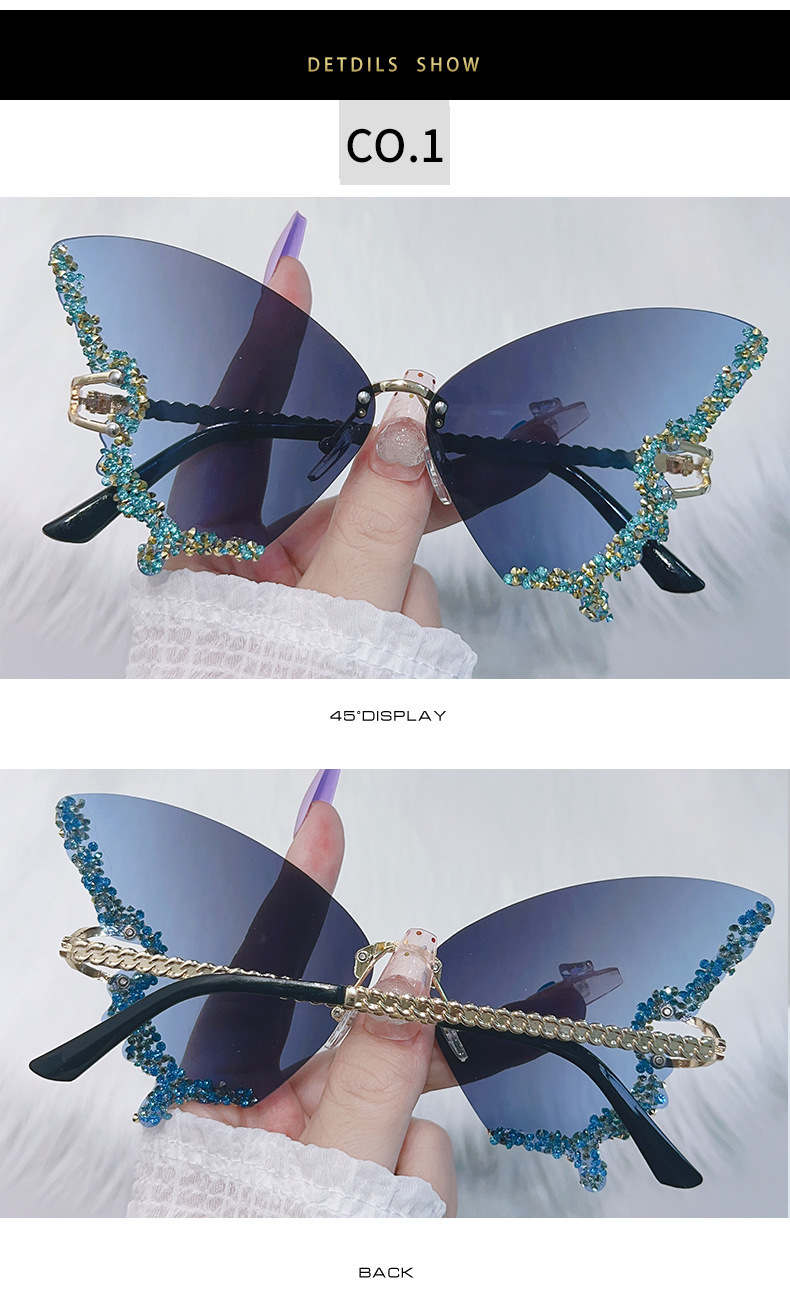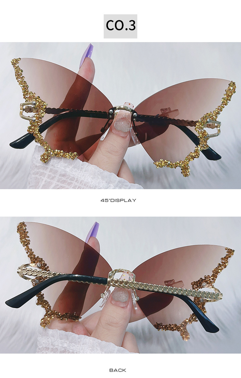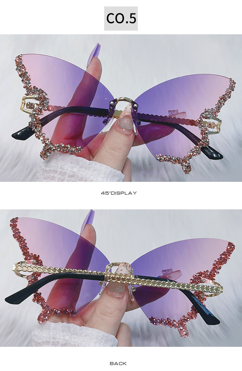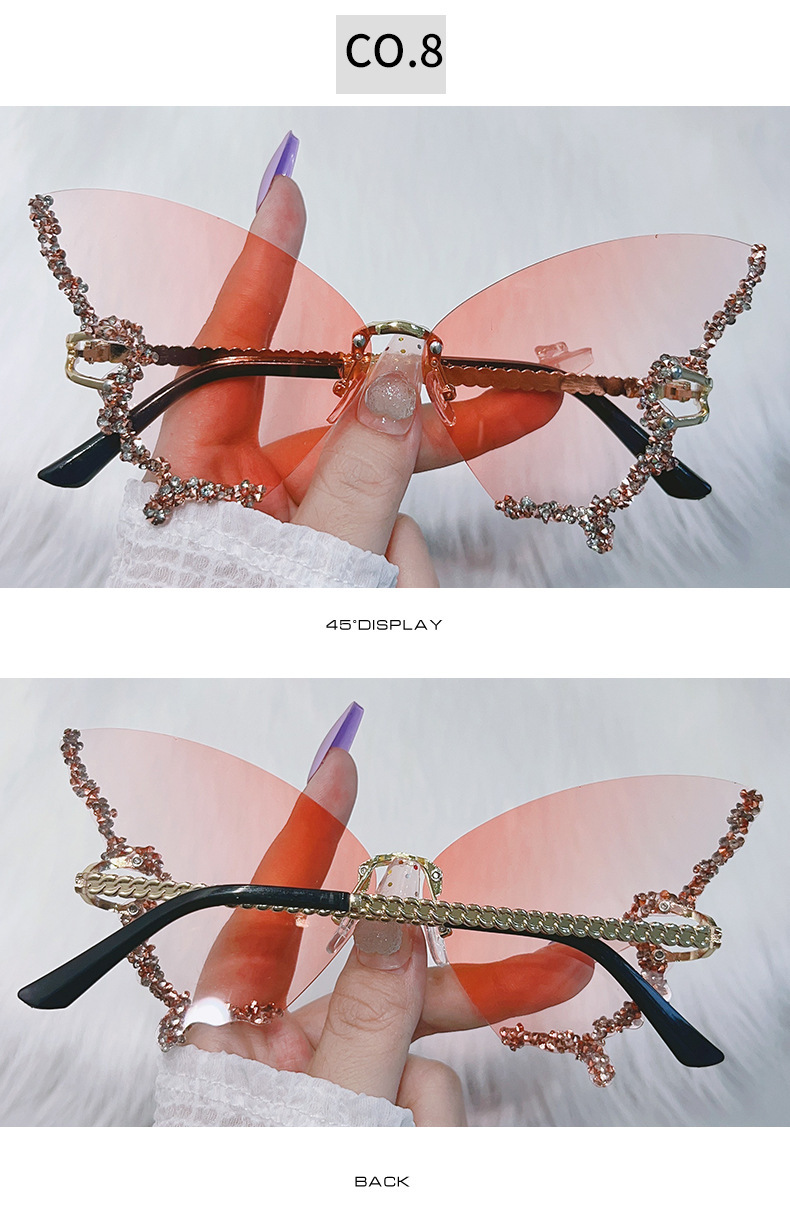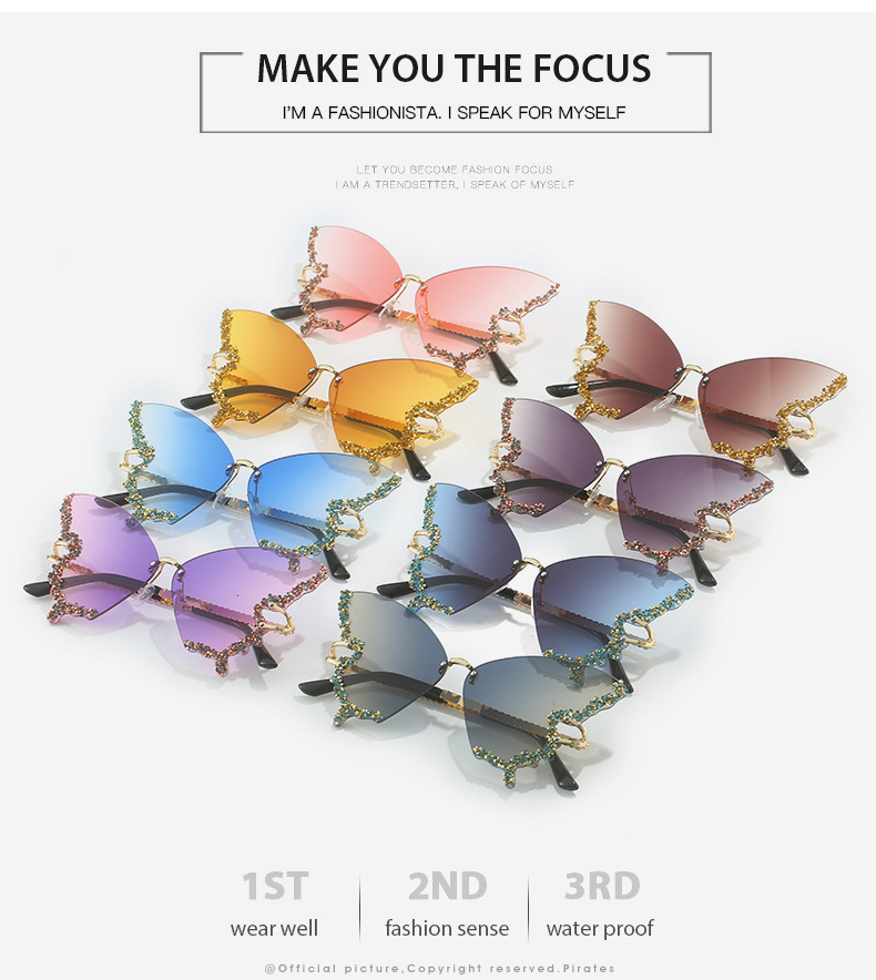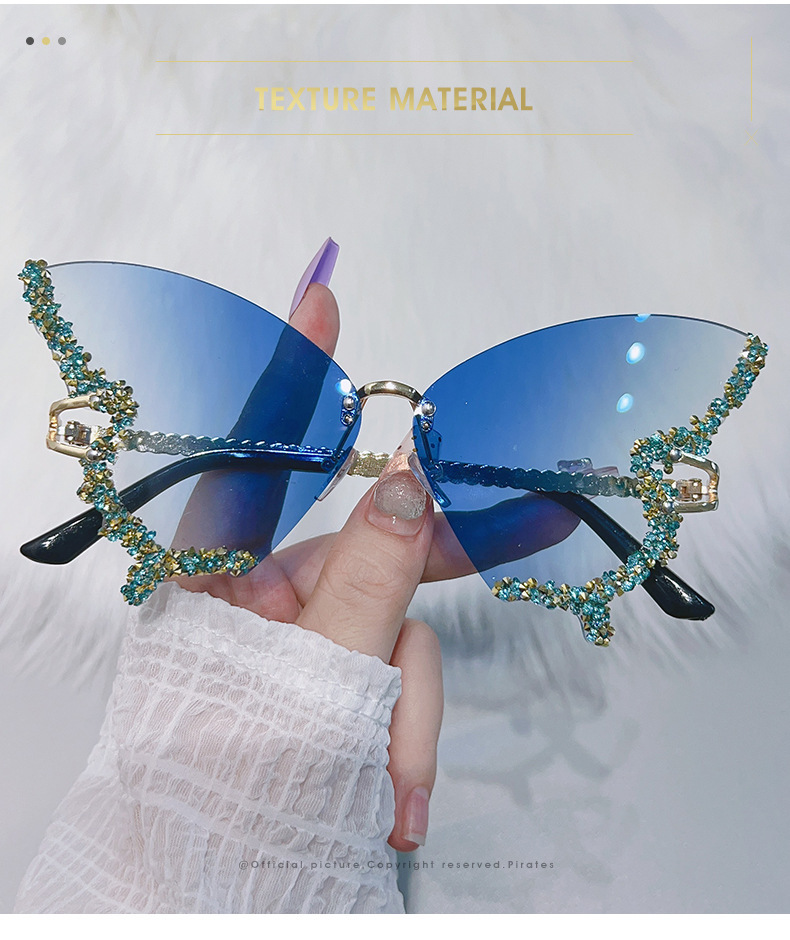跨境爆款蝴蝶造型镶钻无框太阳镜欧美个性风潮女士百搭墨镜批发