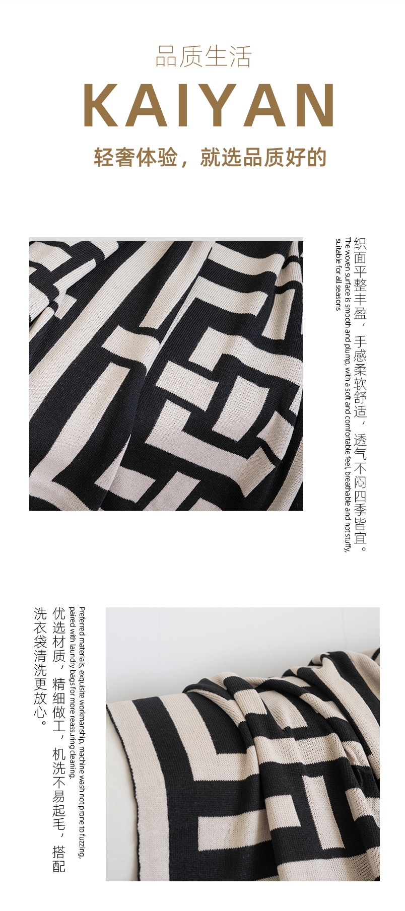 办公室毛线针织毯子沙发盖毯床尾巾搭毯样板房搭巾蓝色黑色回形纹