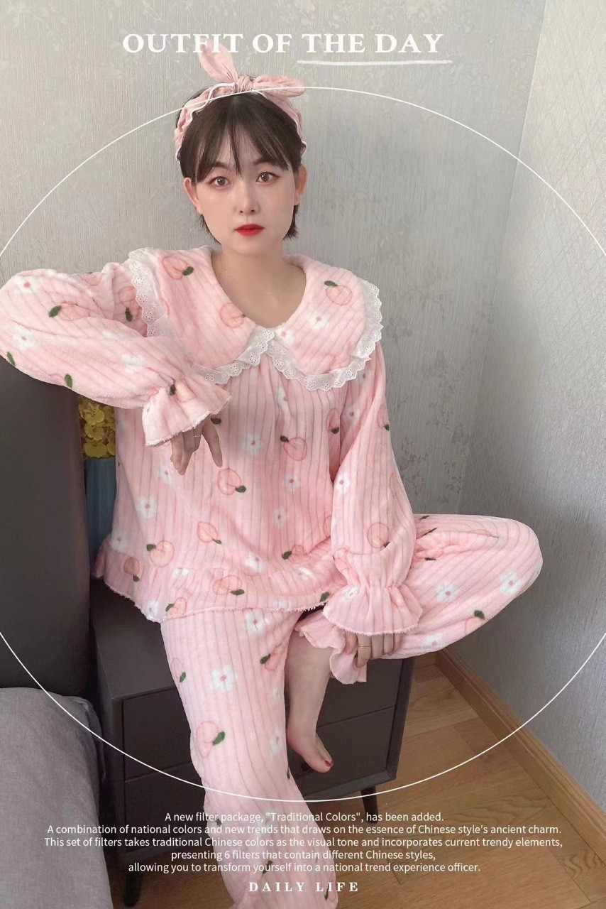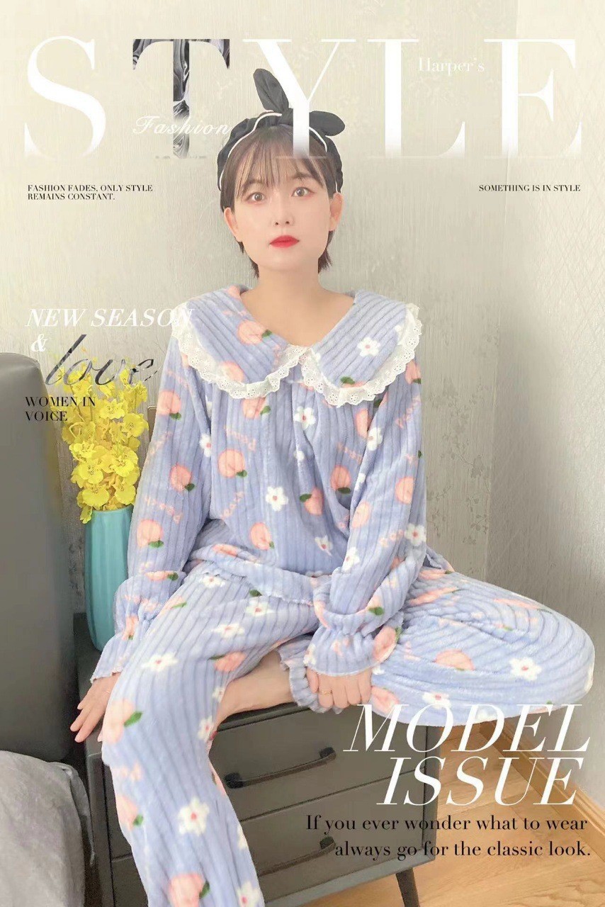 秋冬新款珊瑚绒法兰绒可爱时尚长款家居服睡衣长袖长裤套装女