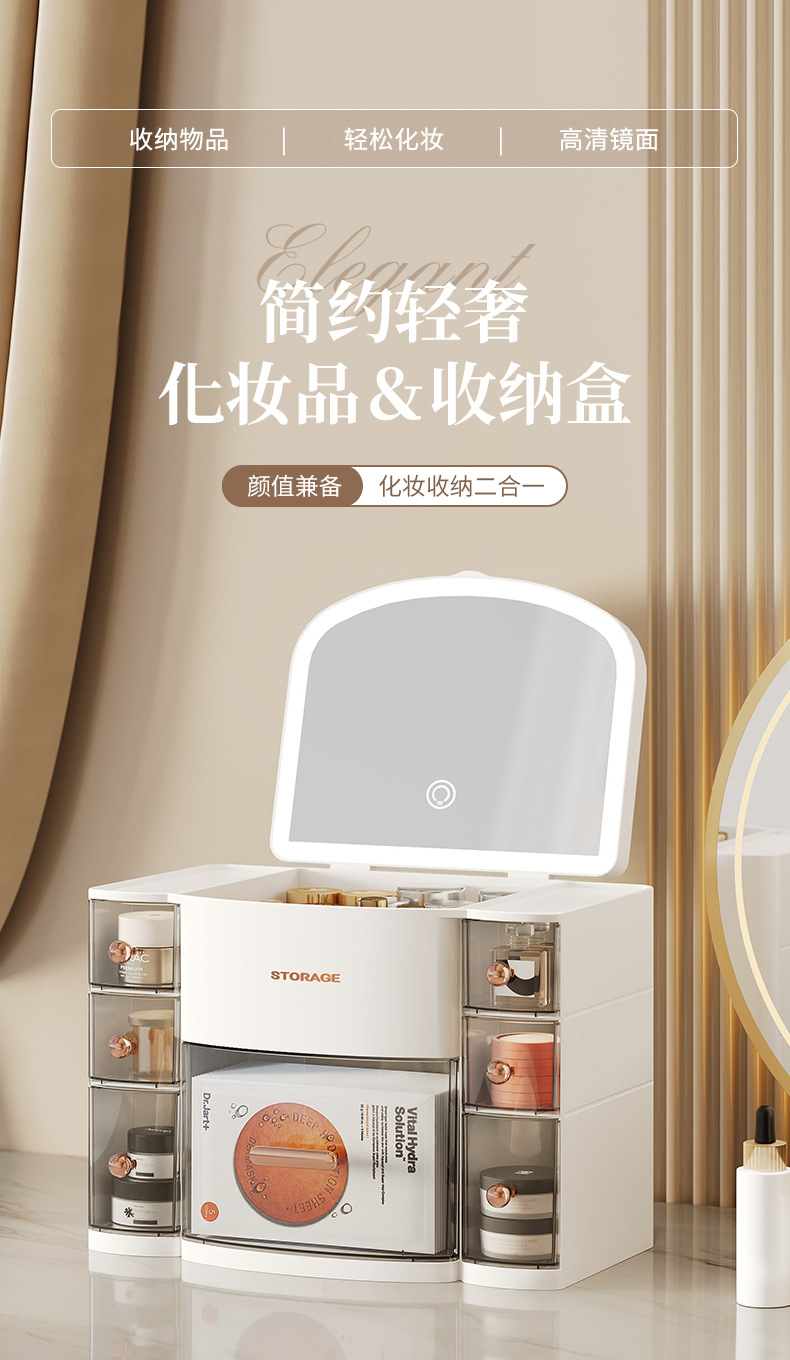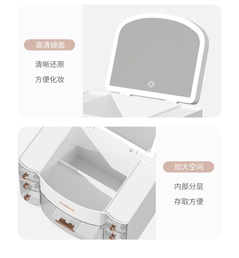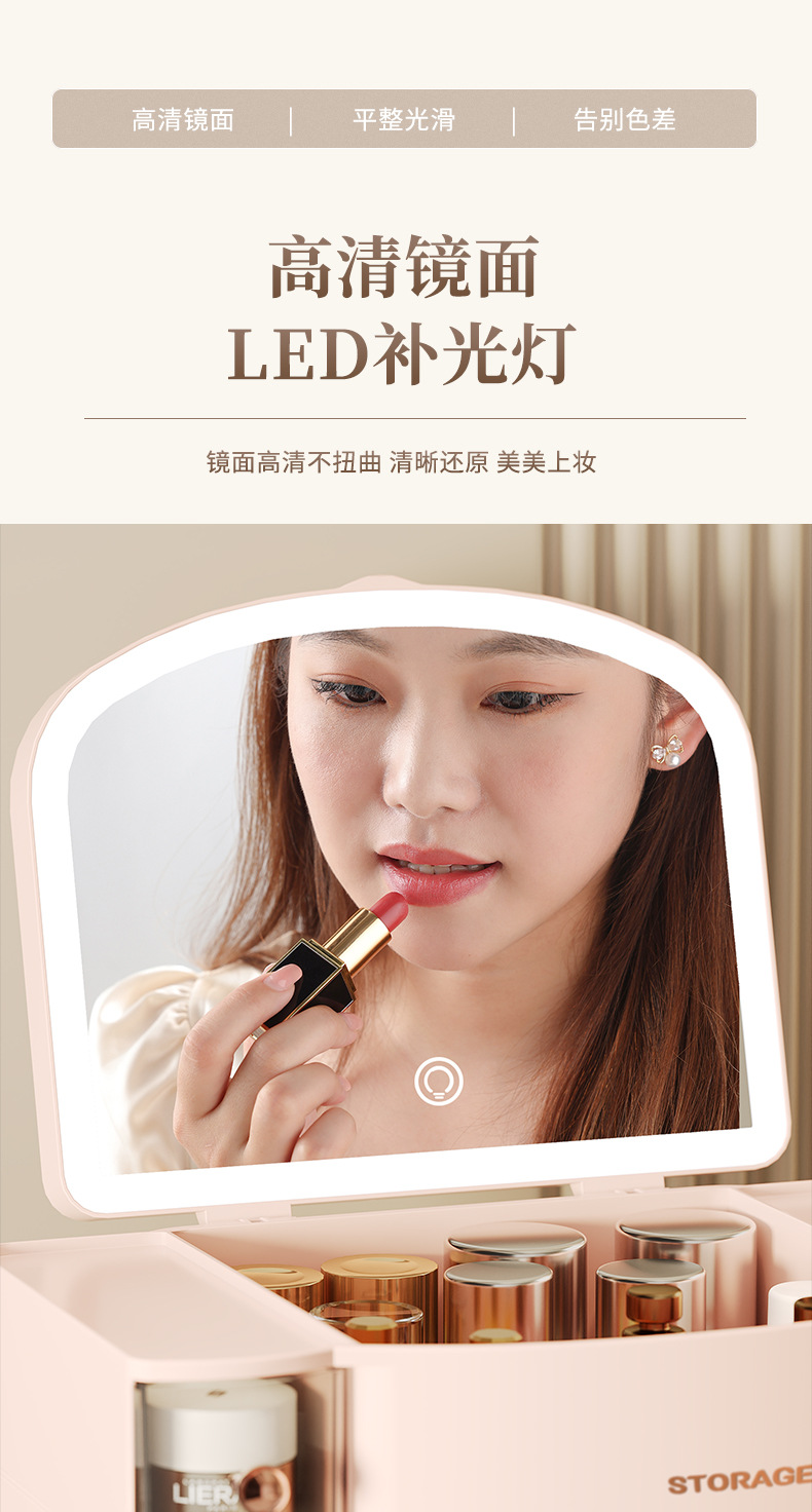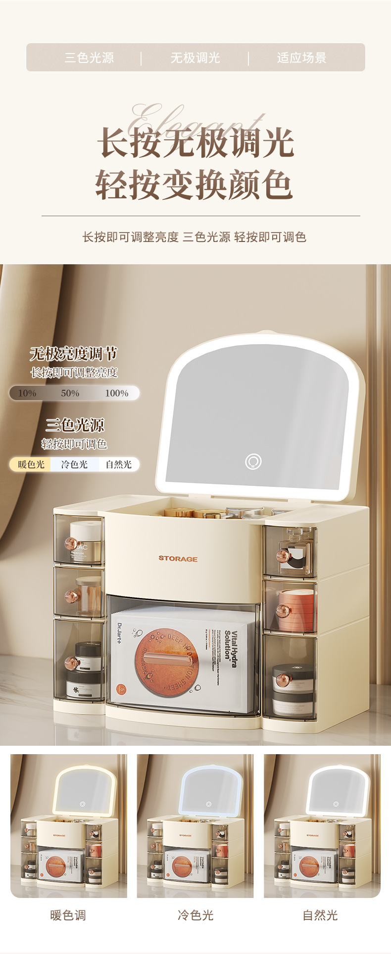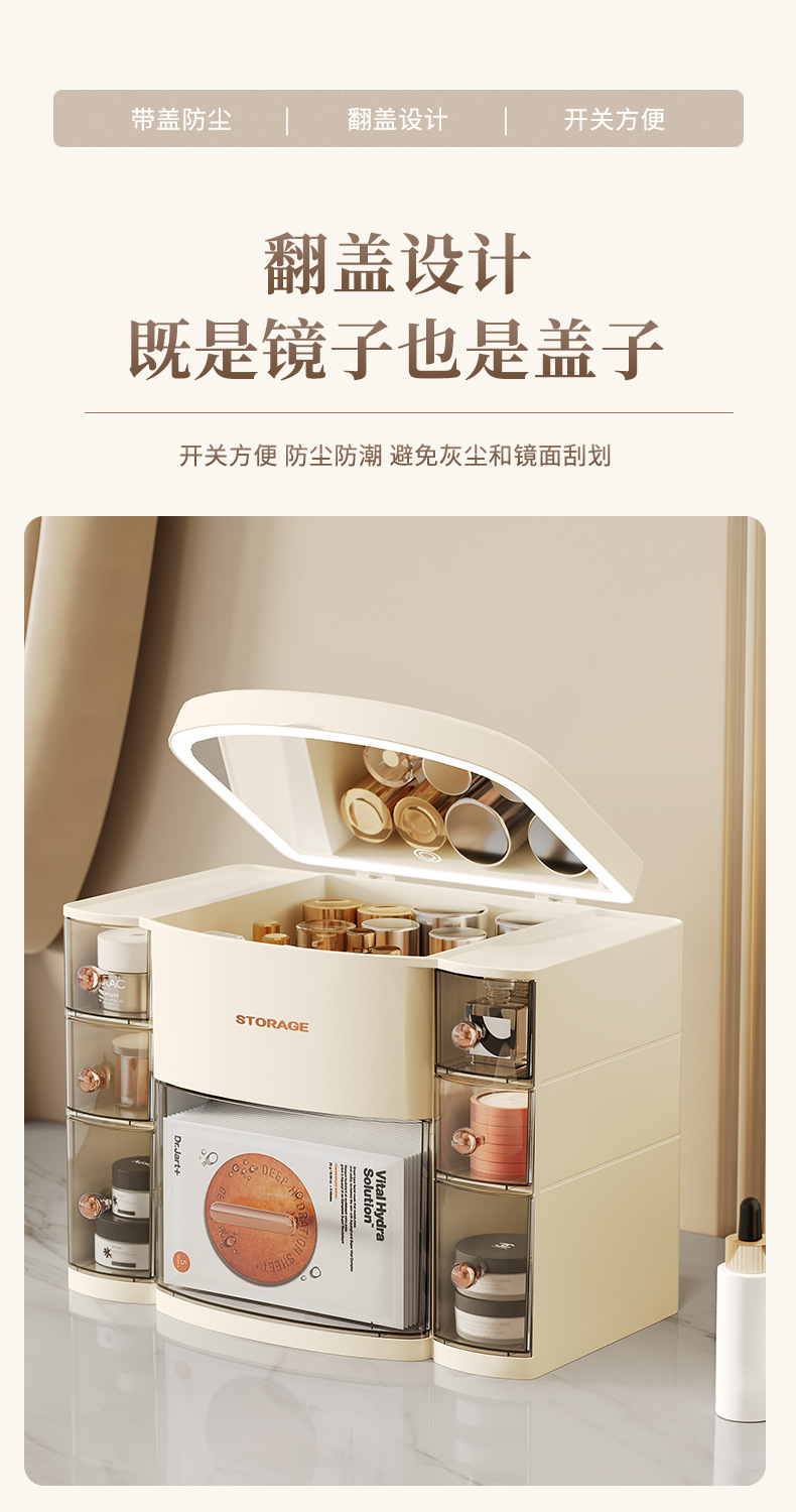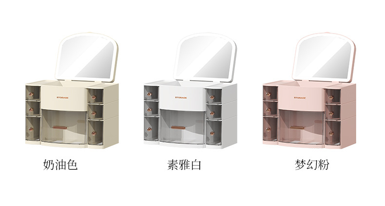 带镜子化妆品收纳盒三色带灯放护肤品化妆箱桌面抽屉式防尘置物架