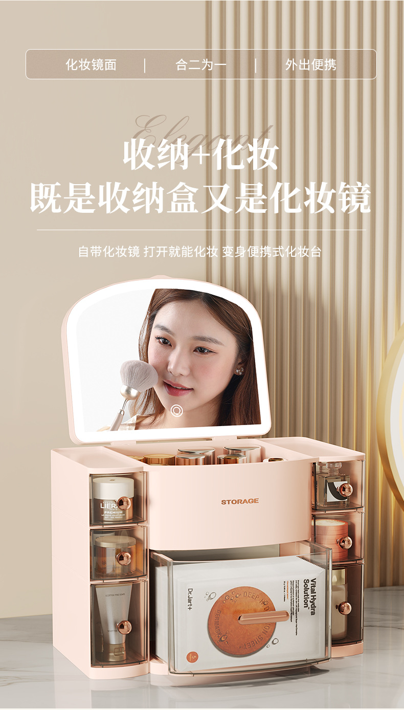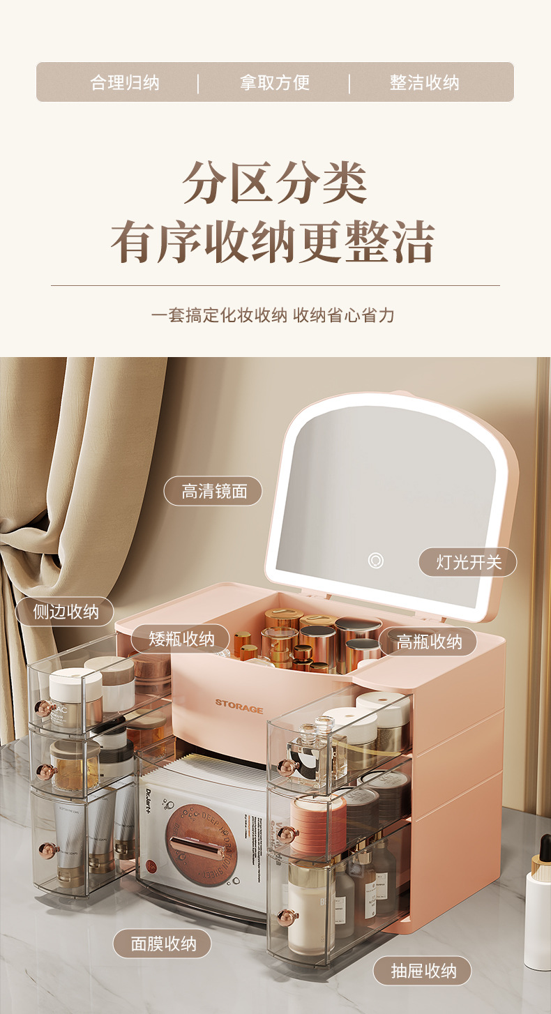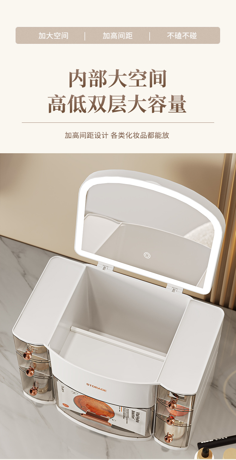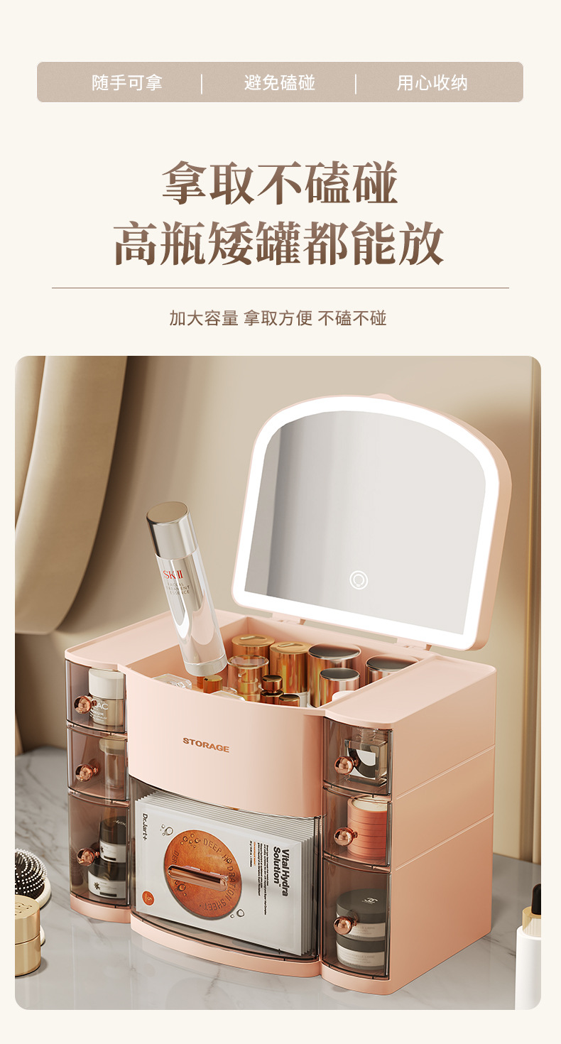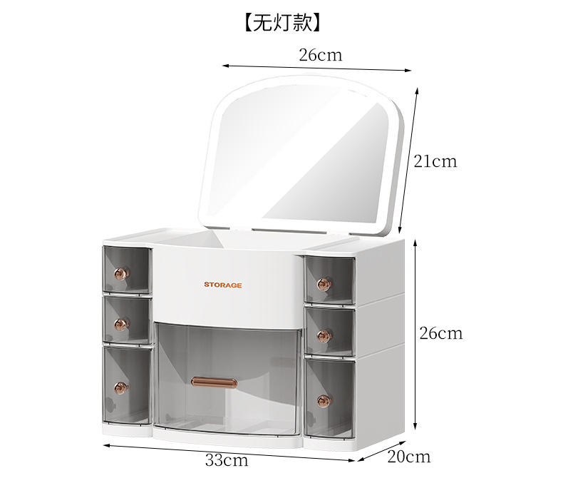 带镜子化妆品收纳盒三色带灯放护肤品化妆箱桌面抽屉式防尘置物架