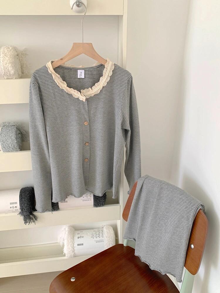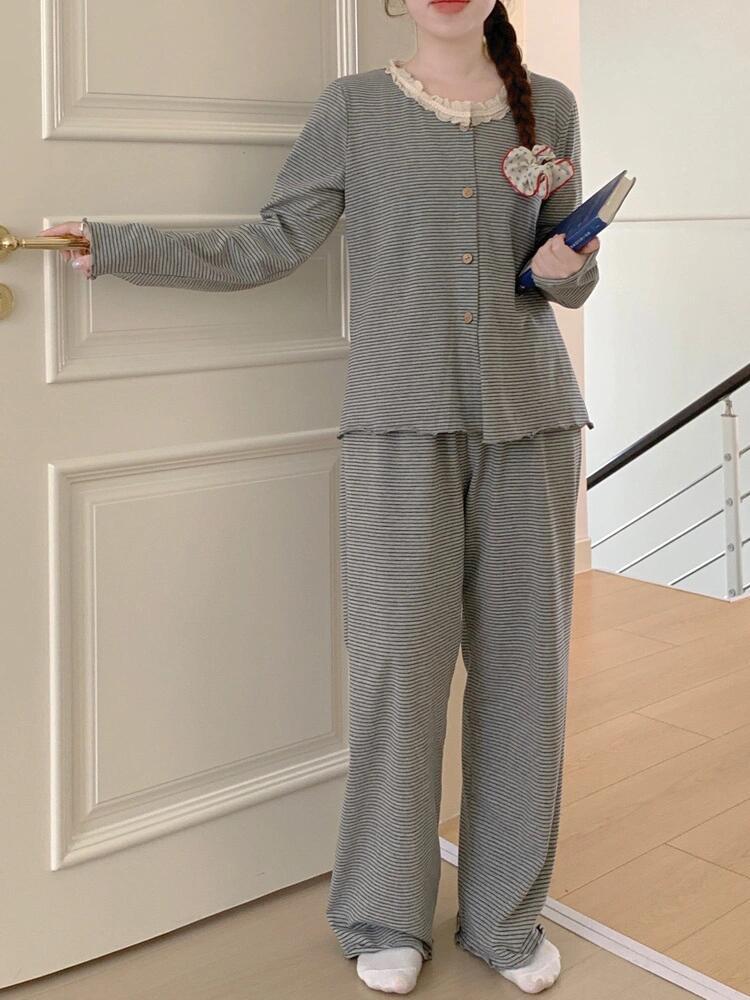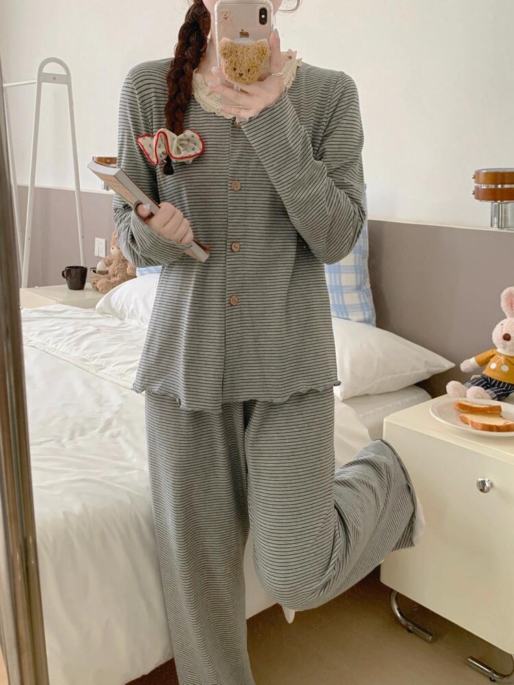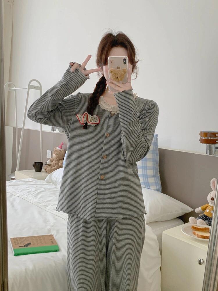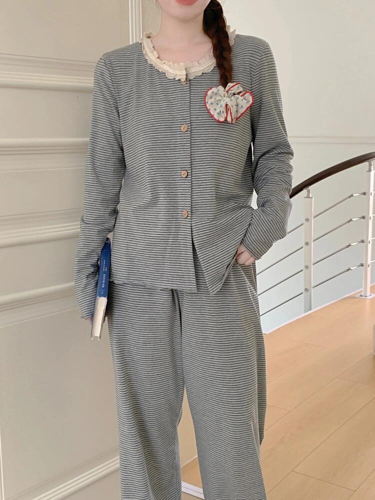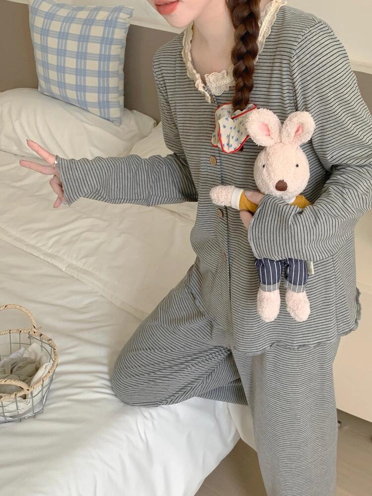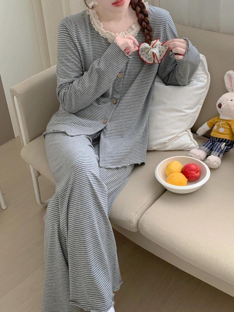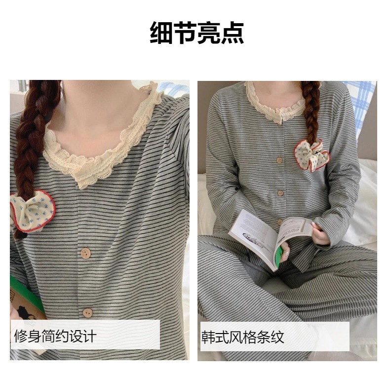 2024新款条纹花边简约风圆领睡衣女秋季小众长袖套装可外穿家居服