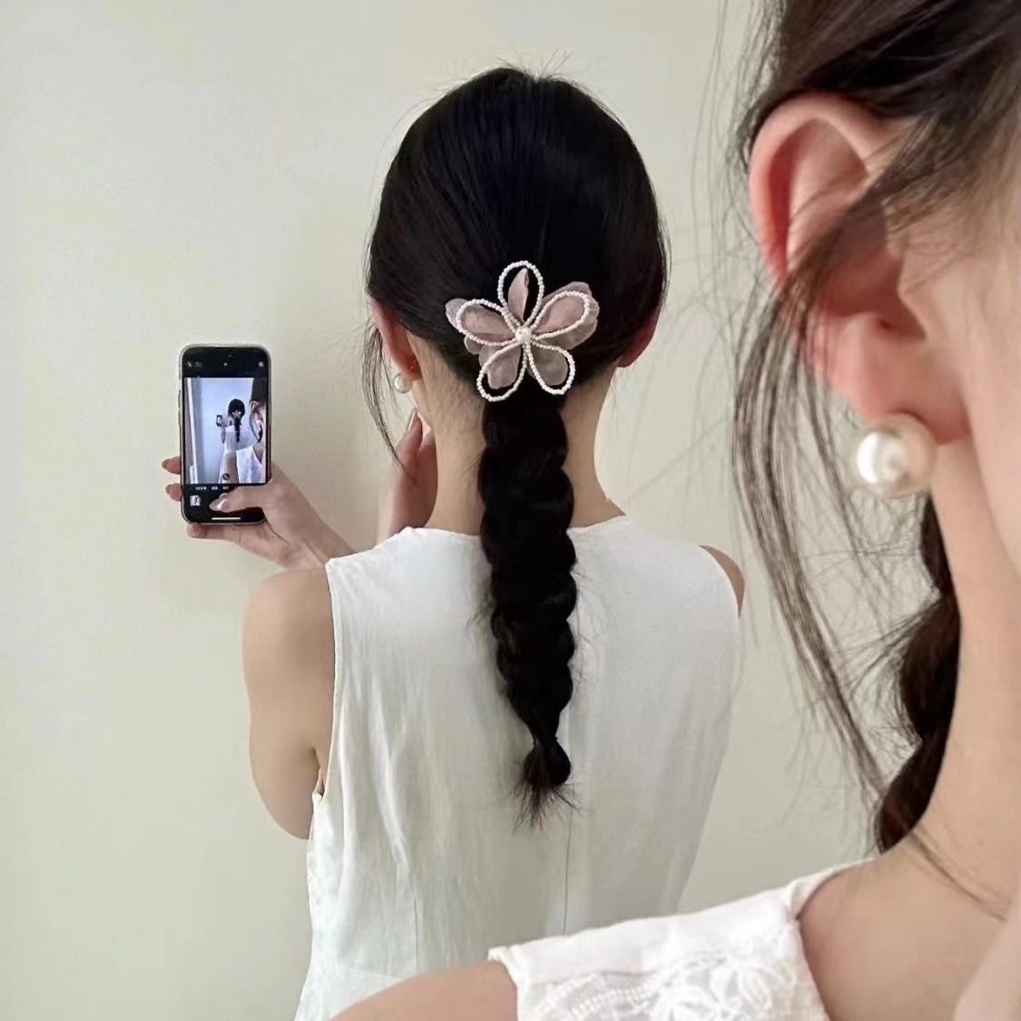 2024韩系新款温柔网纱花朵发夹甜美发卡珍珠发饰头饰鸭嘴夹侧边夹
