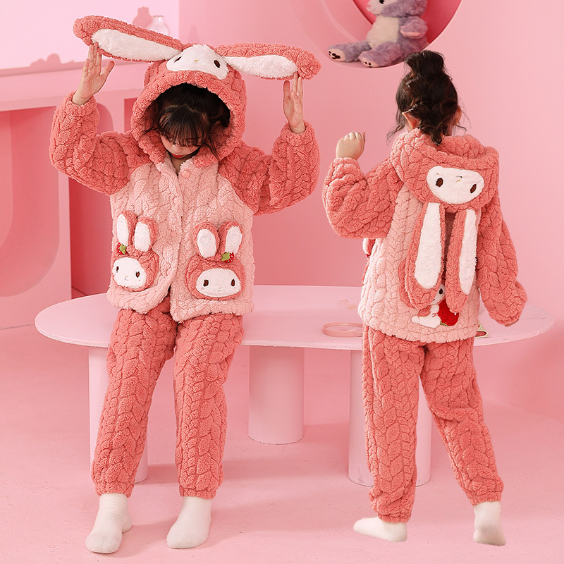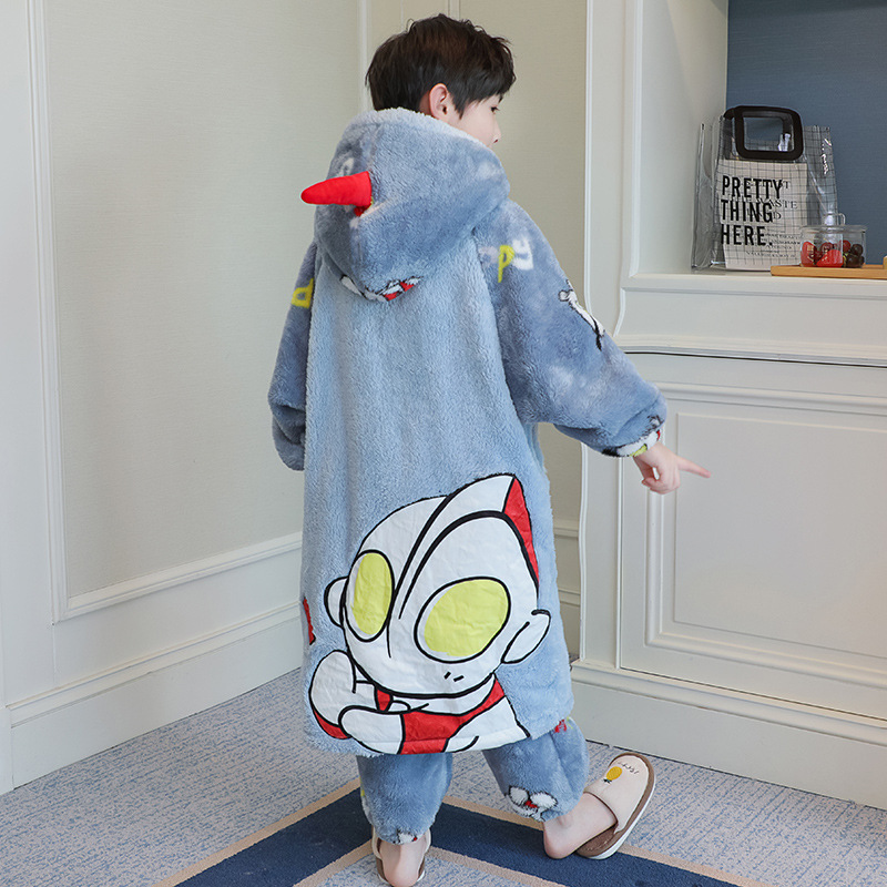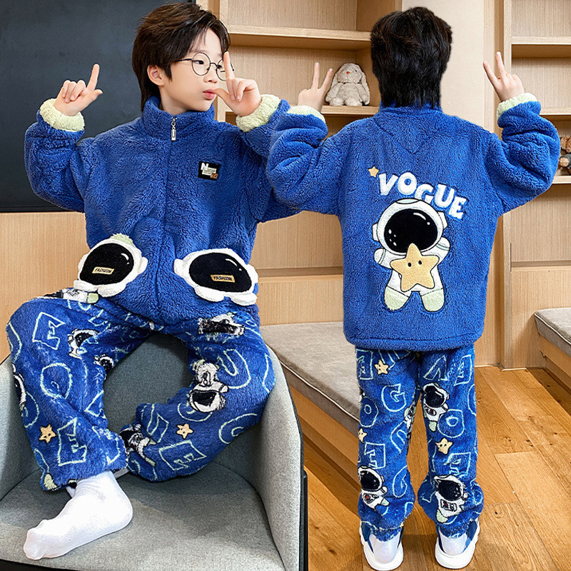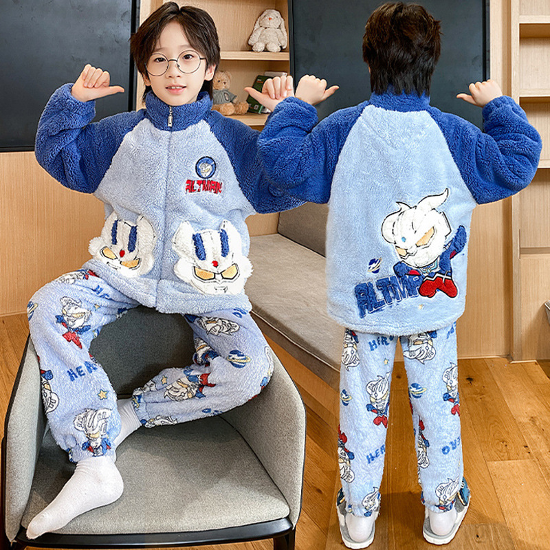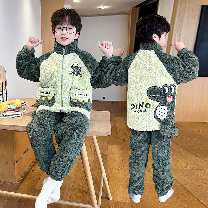 秋冬季儿童珊瑚绒睡衣男童宝宝加绒保暖卡通家居服女孩法兰绒套装