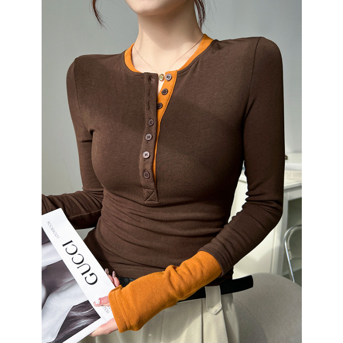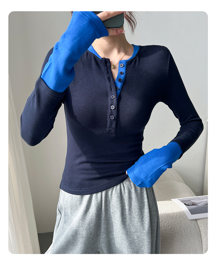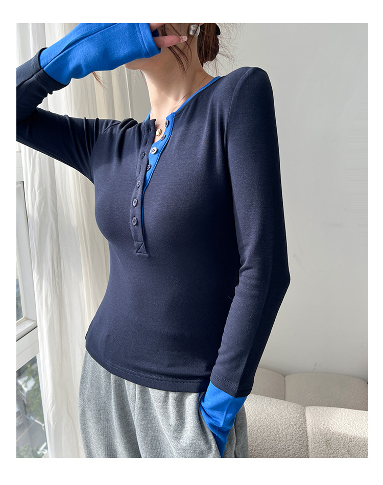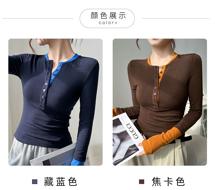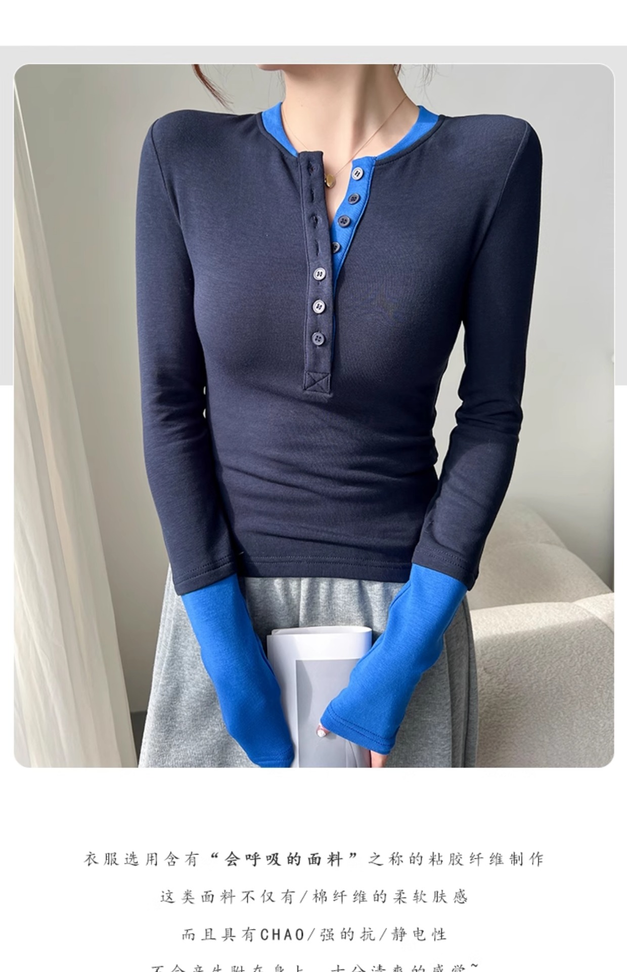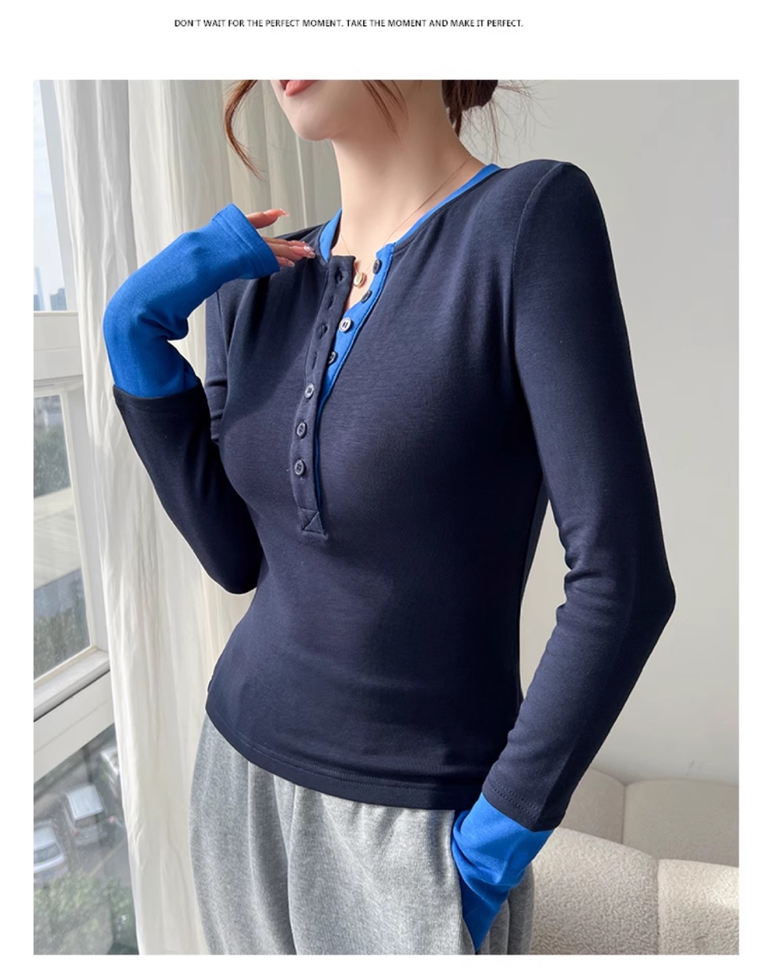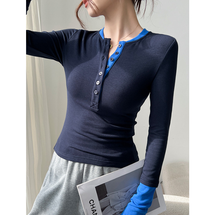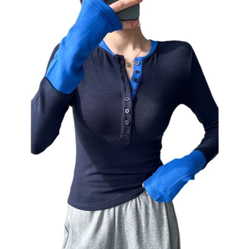 辣妹性感修身撞色拼接长袖t恤修身显瘦内搭打底衫设计感小众上衣