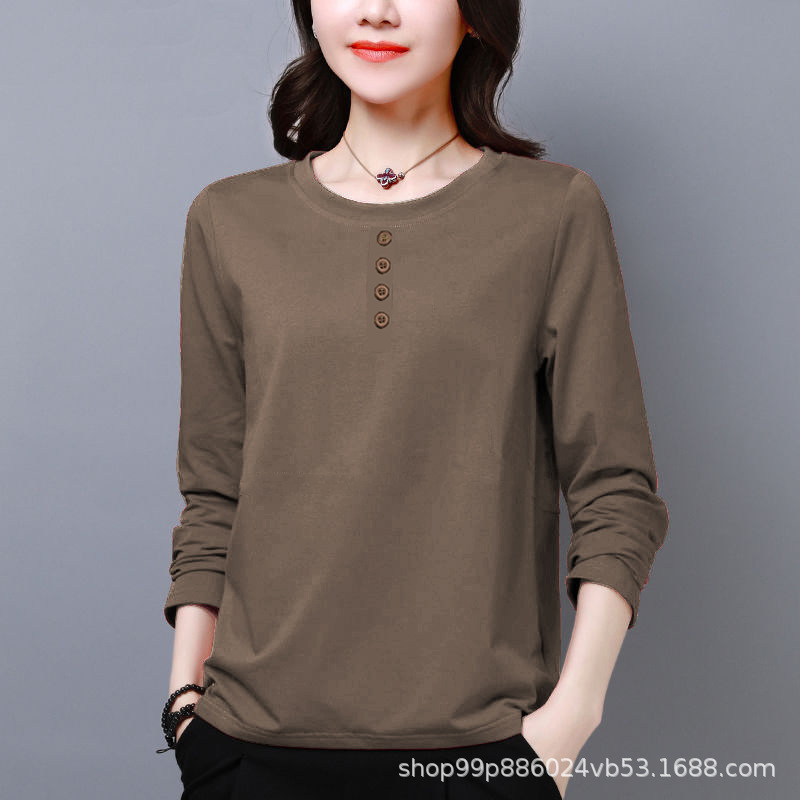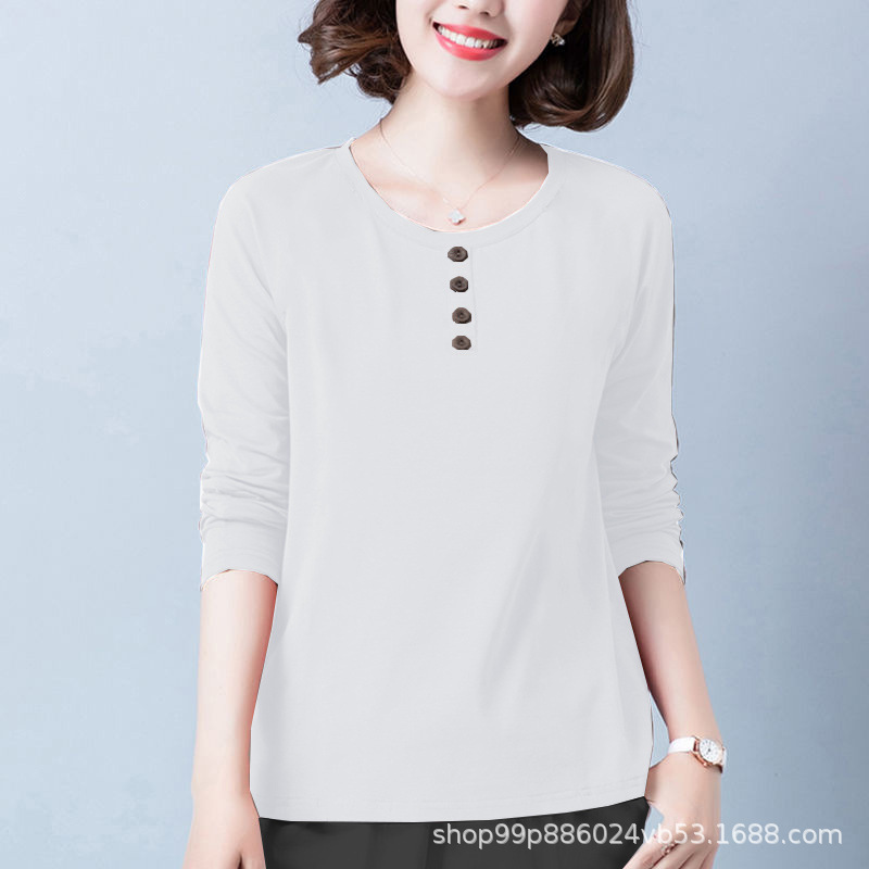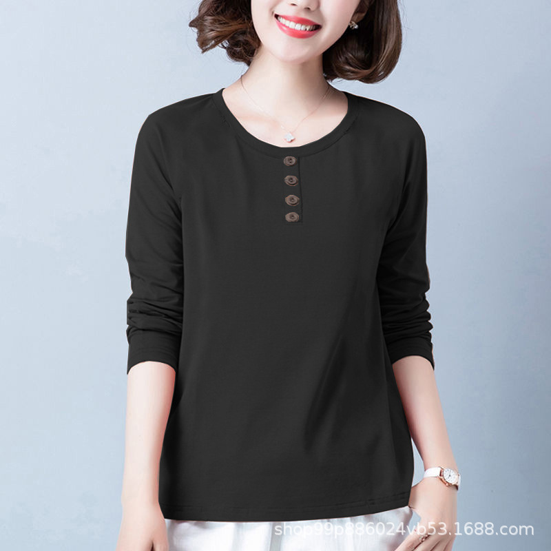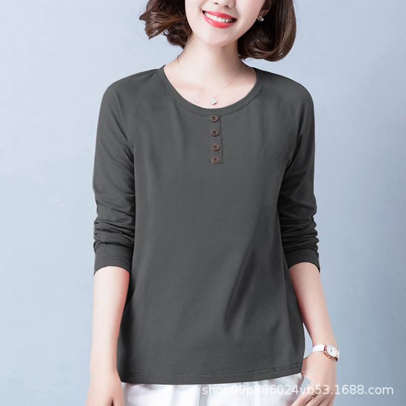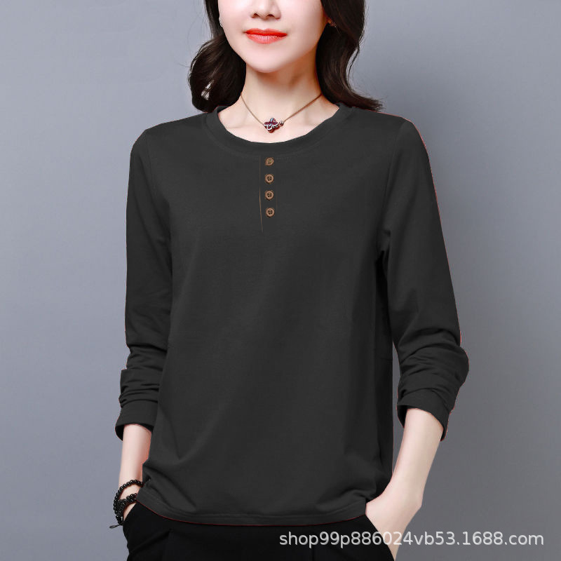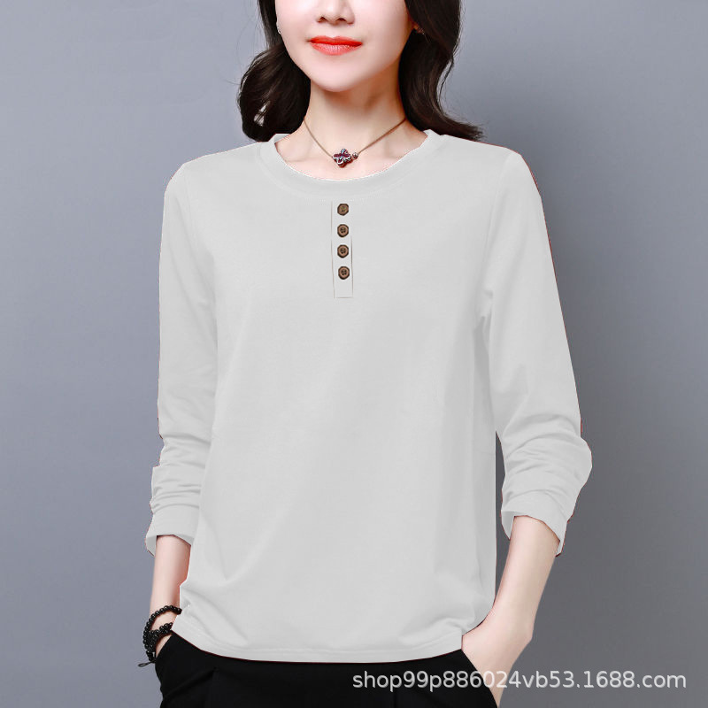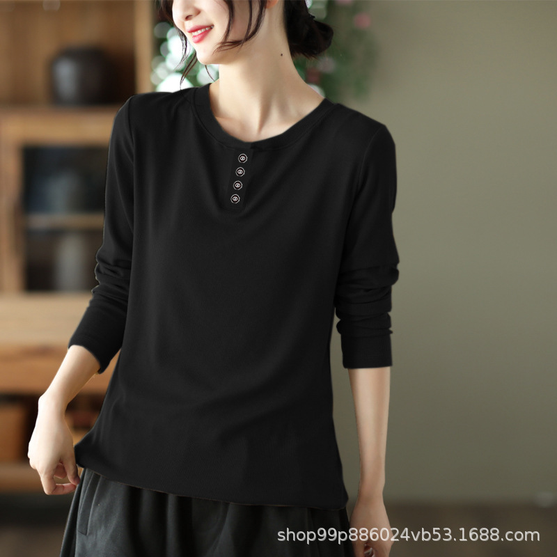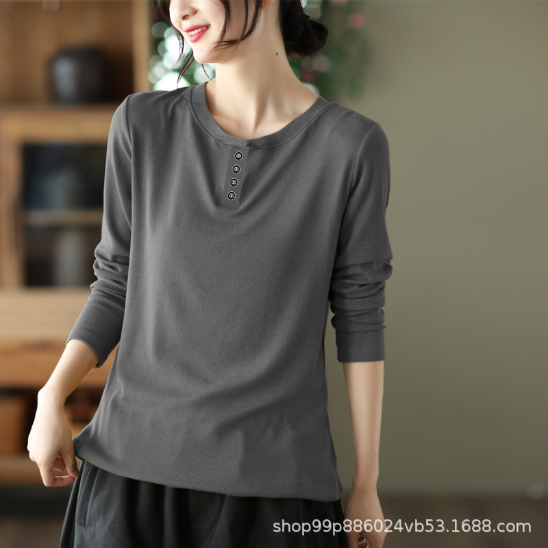 长袖t恤女2024春秋季新款纯色打底衫圆领纽扣百搭显瘦气质上衣