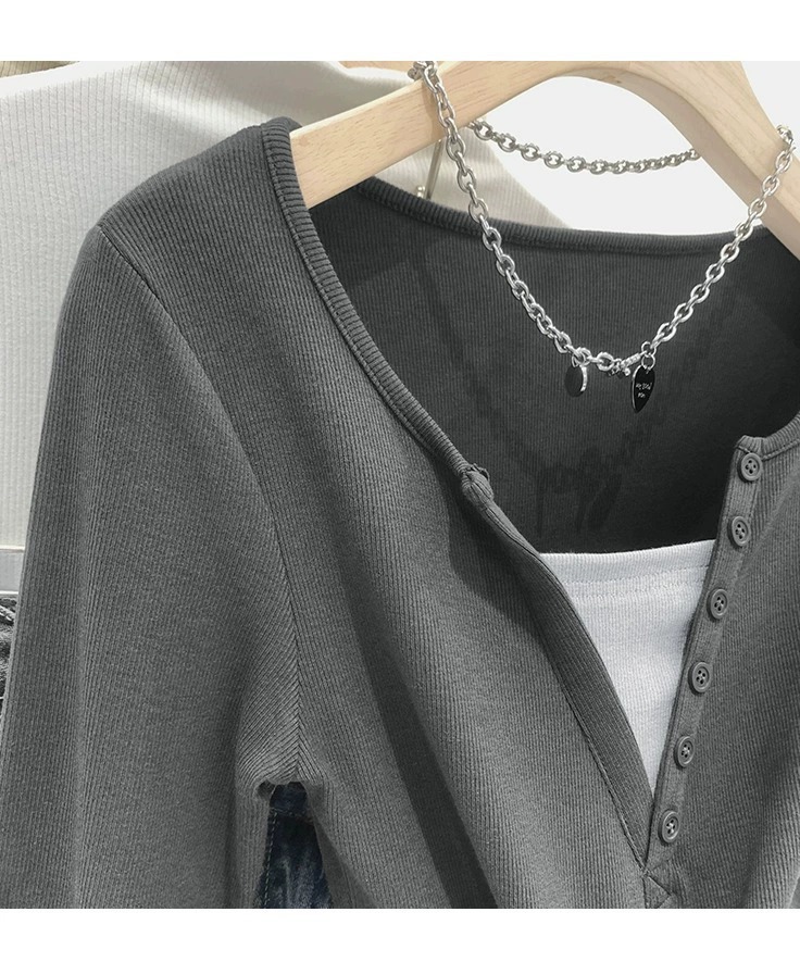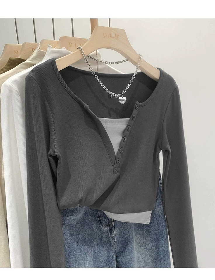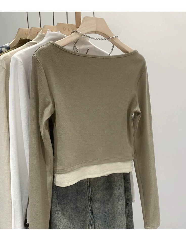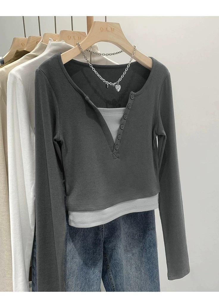 撞色假两件长袖T恤女秋季2024年新款设计感小众V领短款上衣打底衫