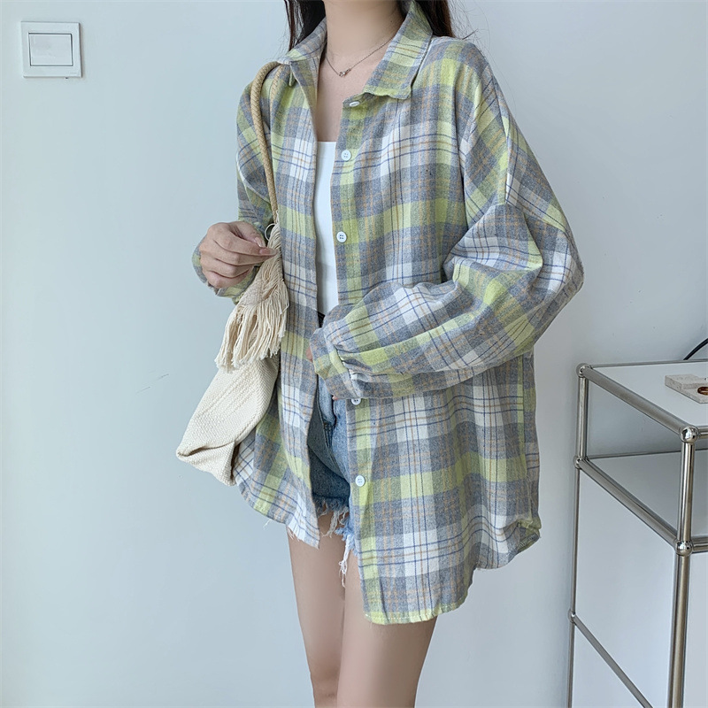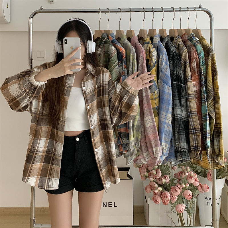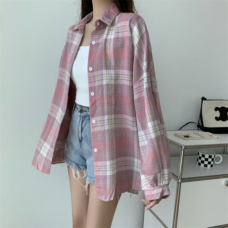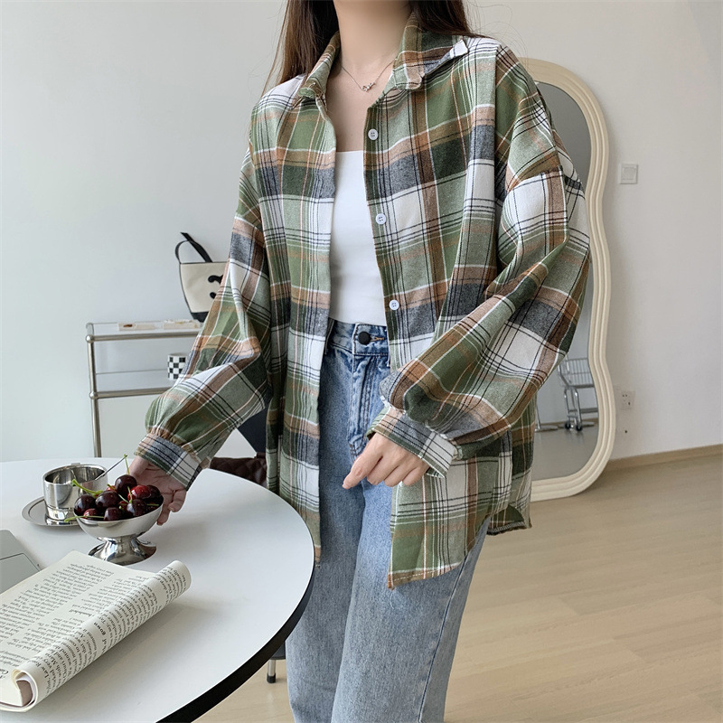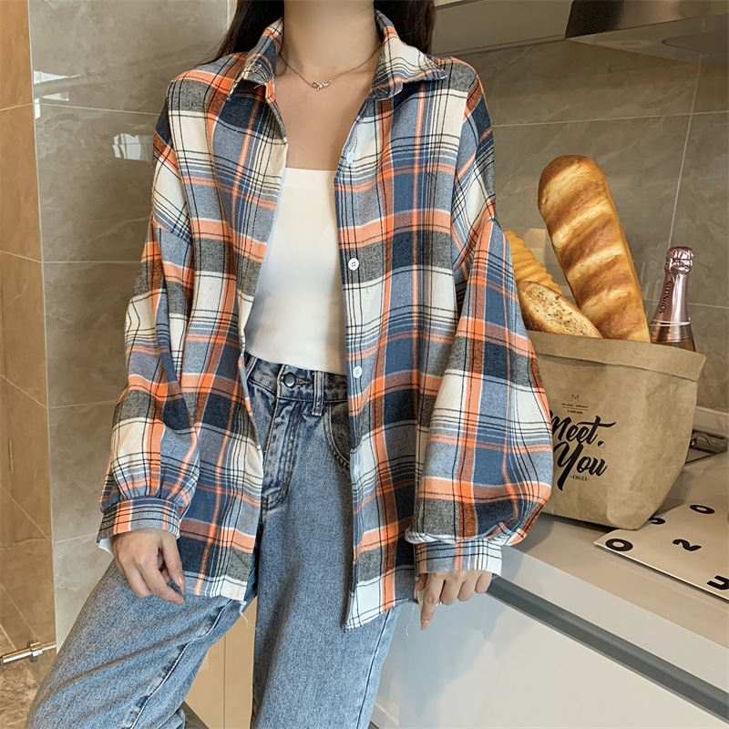 实拍实价韩系高级设计感小众衬衣女秋装复古港味百搭宽松格子衬衫