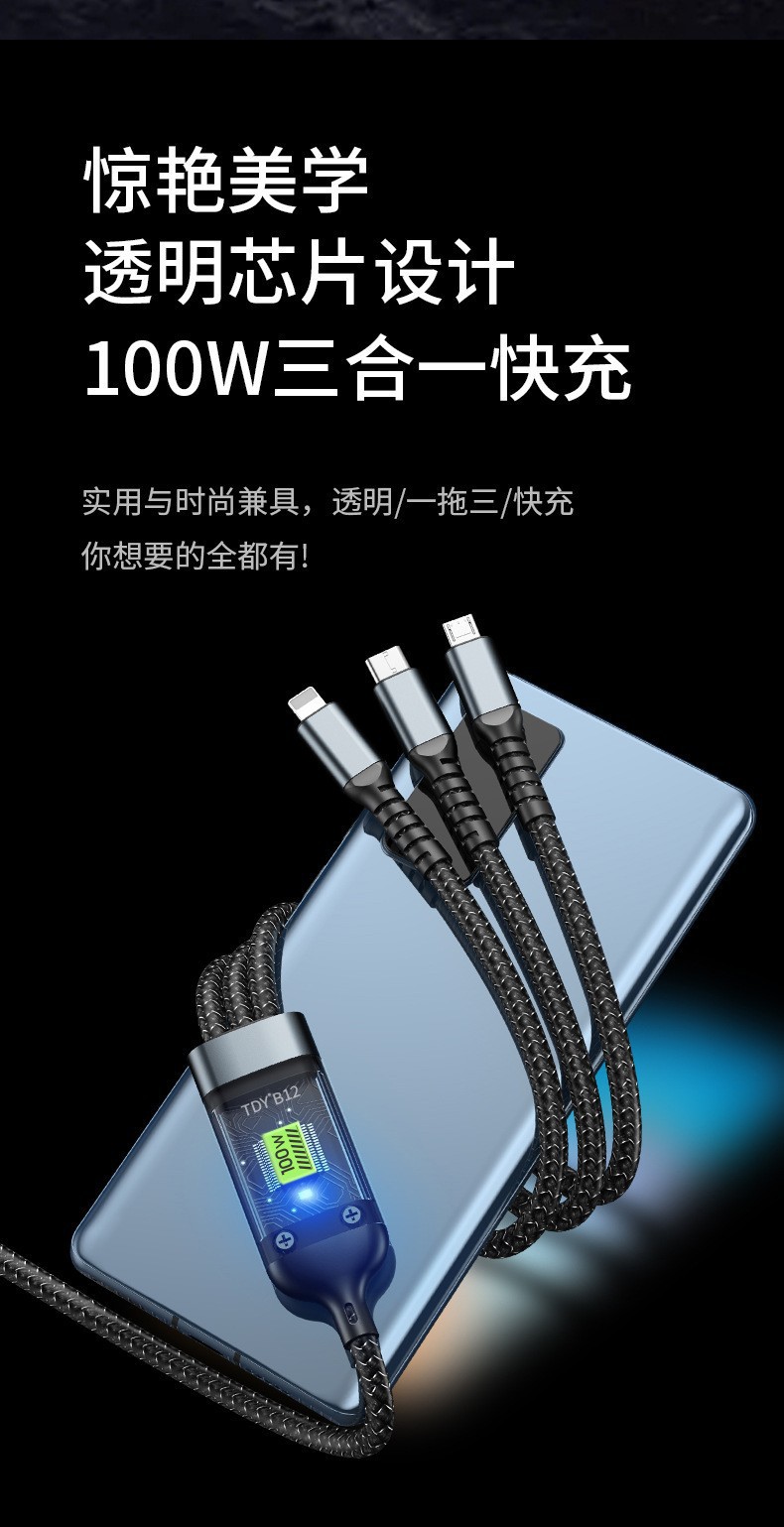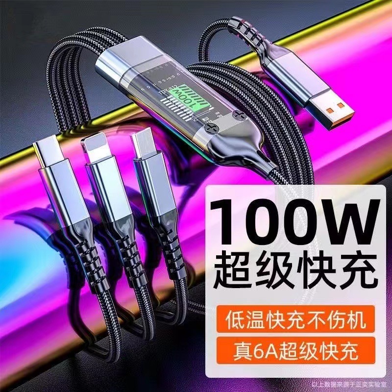 100W一拖三手机数据线数显适用华为Type-C小米苹果快充充电线编织