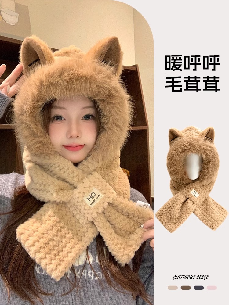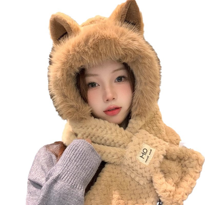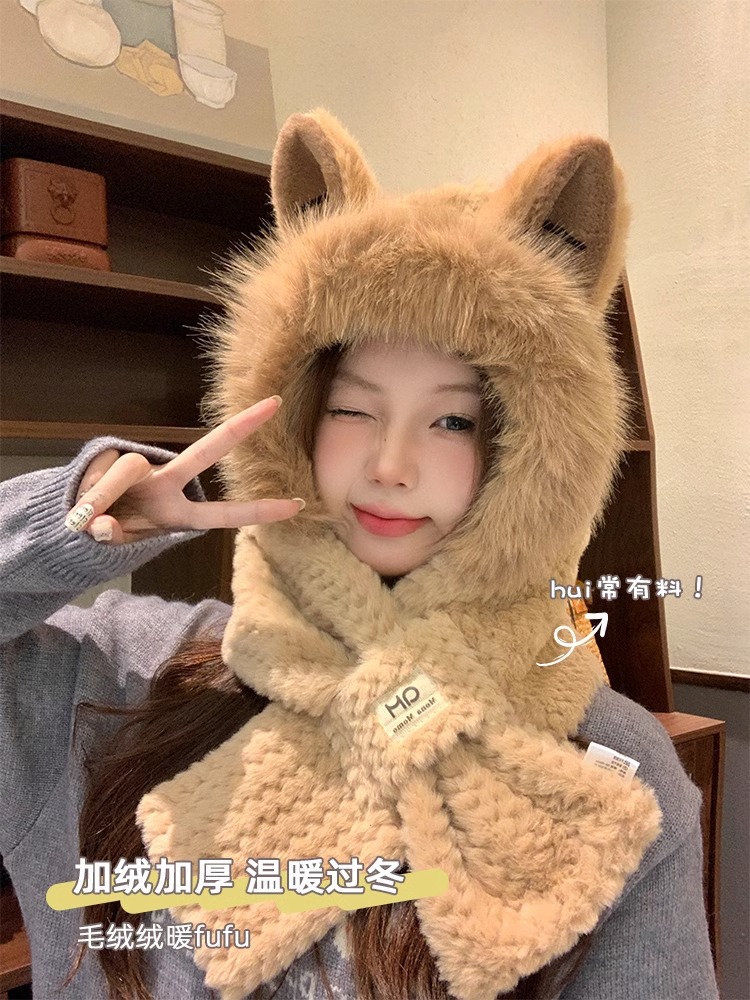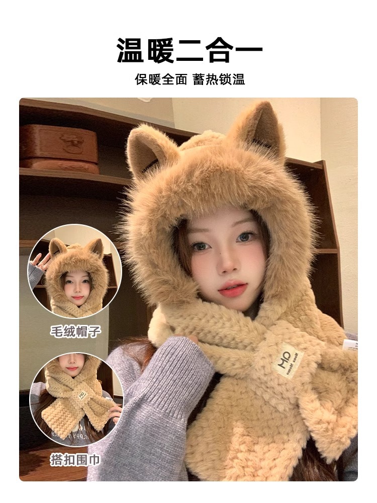 小狐狸耳朵毛绒帽子女冬季围巾一体保暖加绒加厚围脖防寒俩件套