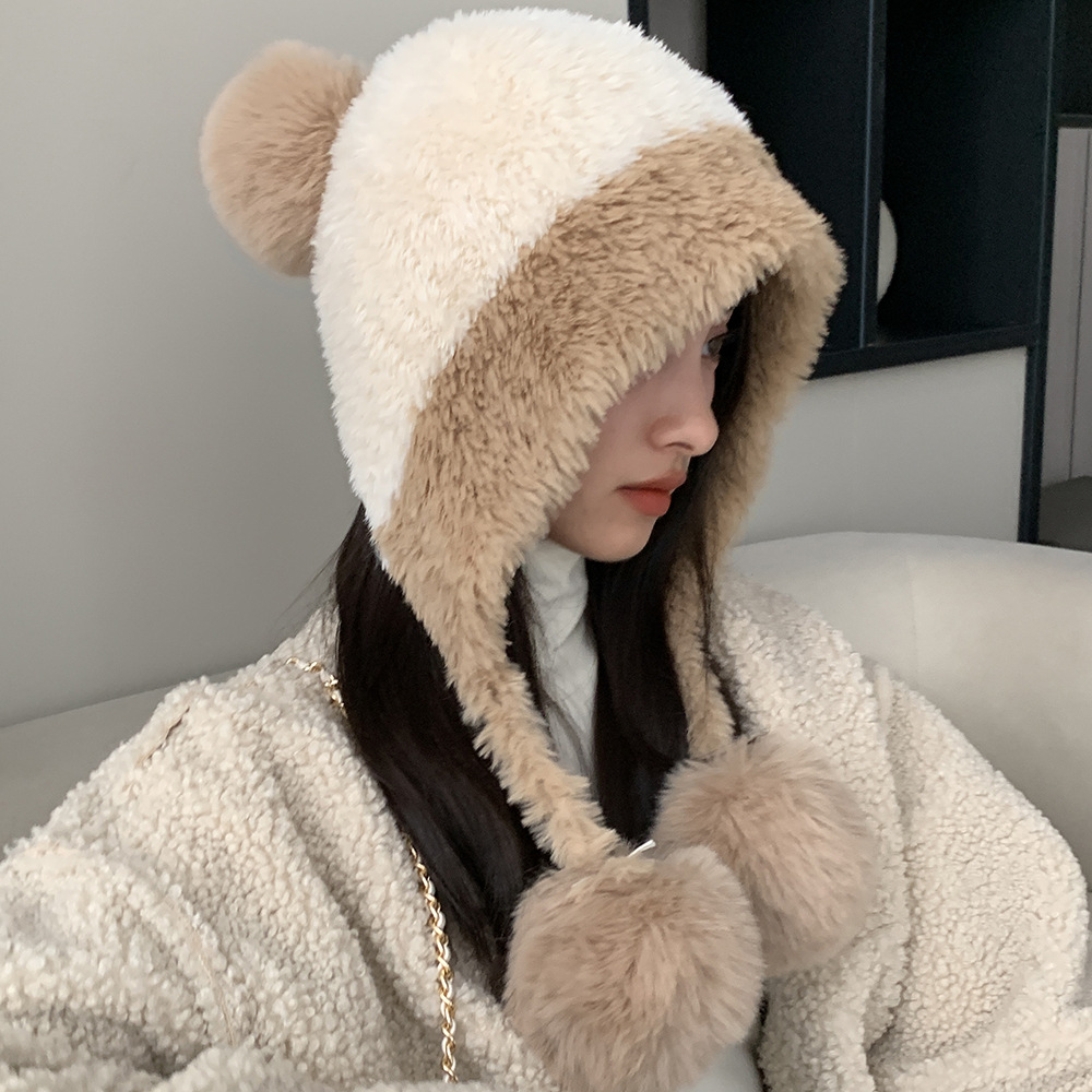 冬季防寒帽大头围毛绒挂球可爱护耳帽子女遮耳加绒加厚拼色针织帽