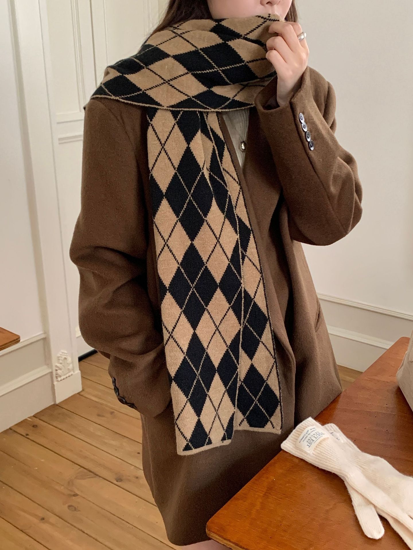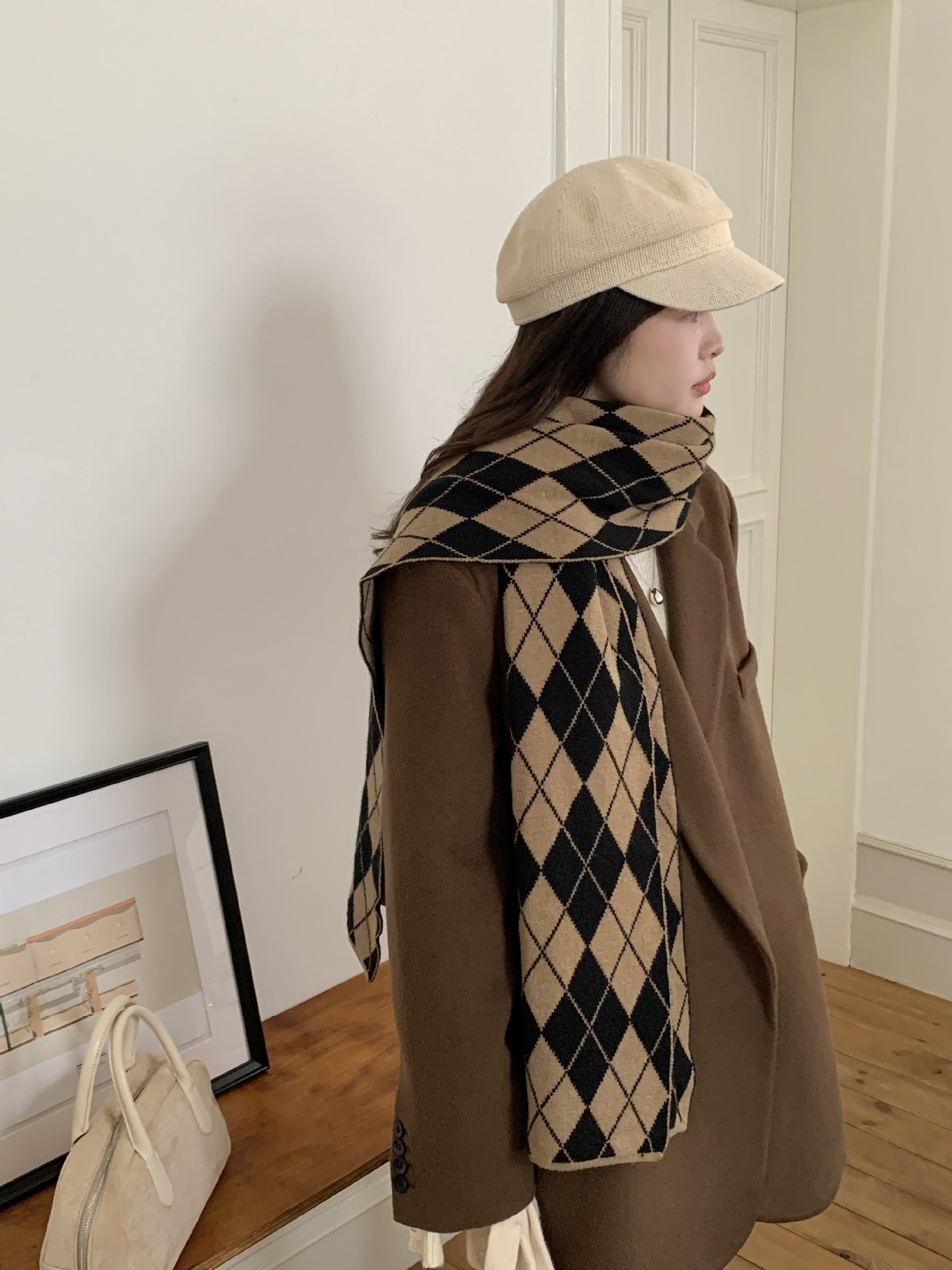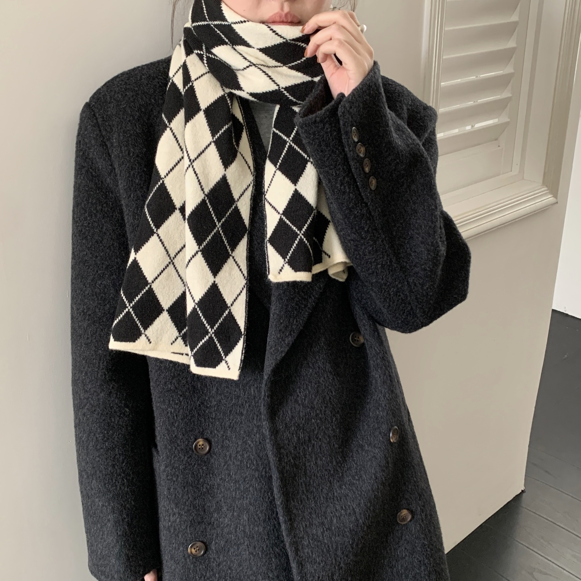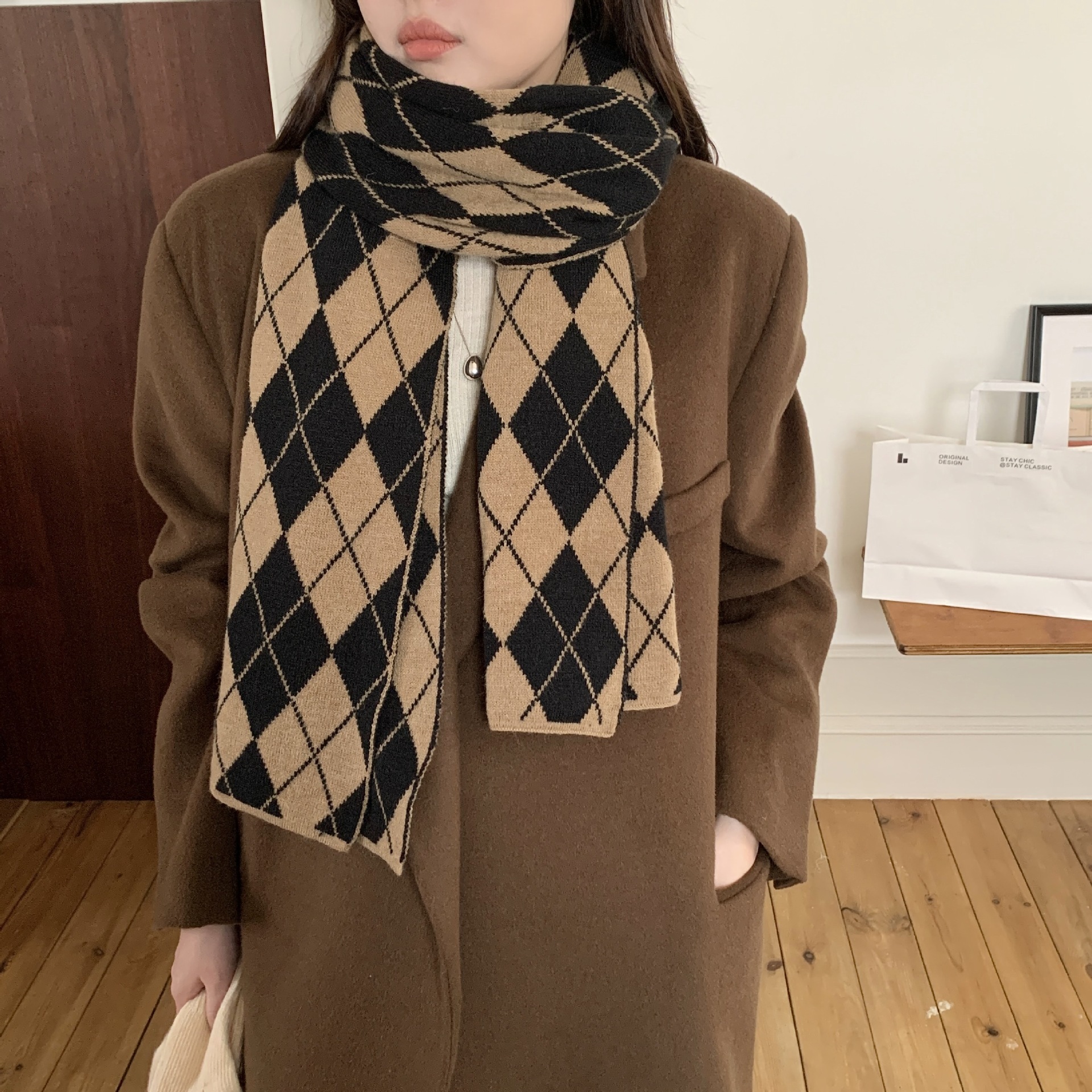 新款平价围巾女秋冬韩系复古大菱形双面撞色拼色格子百搭针织围脖