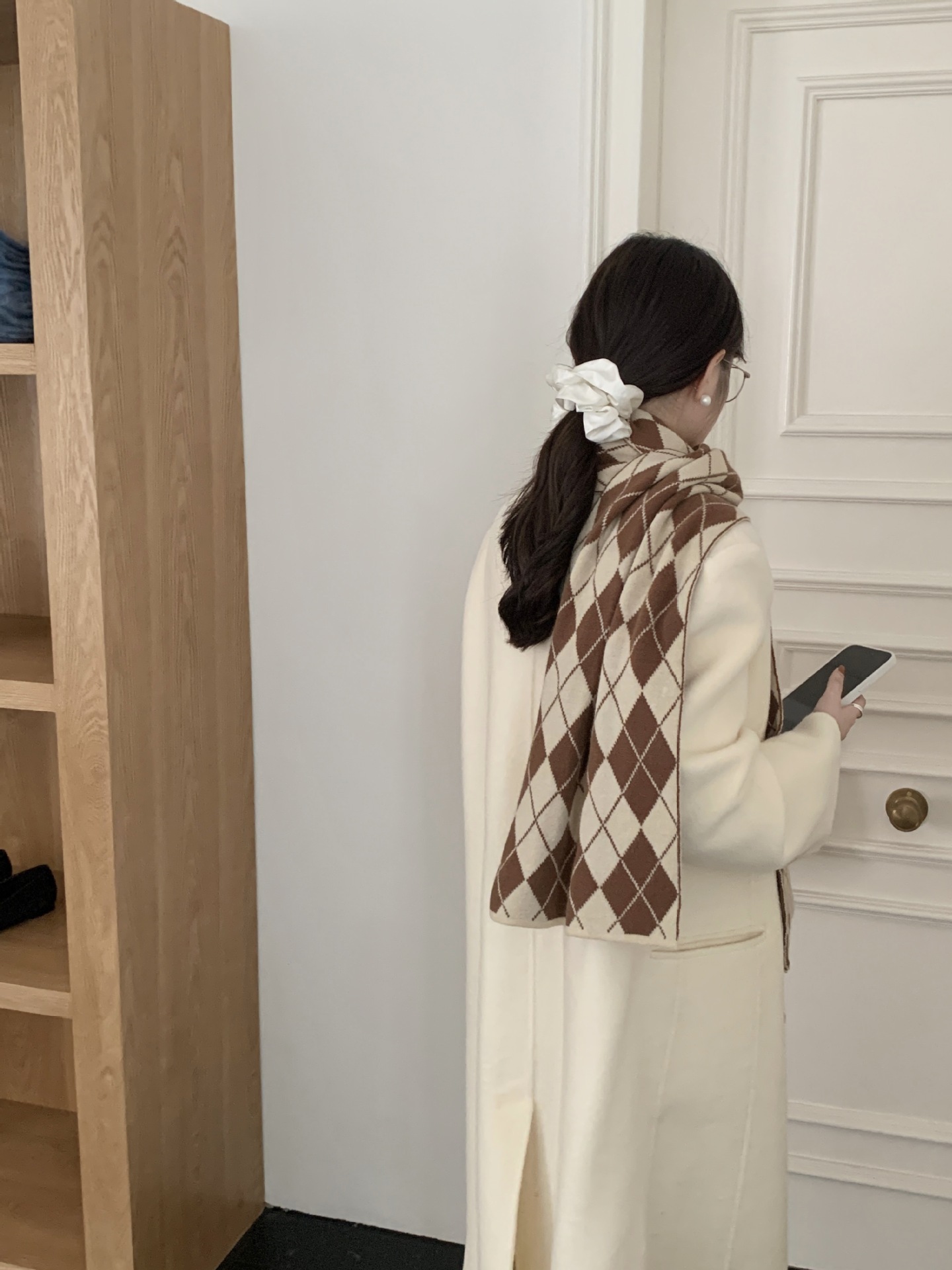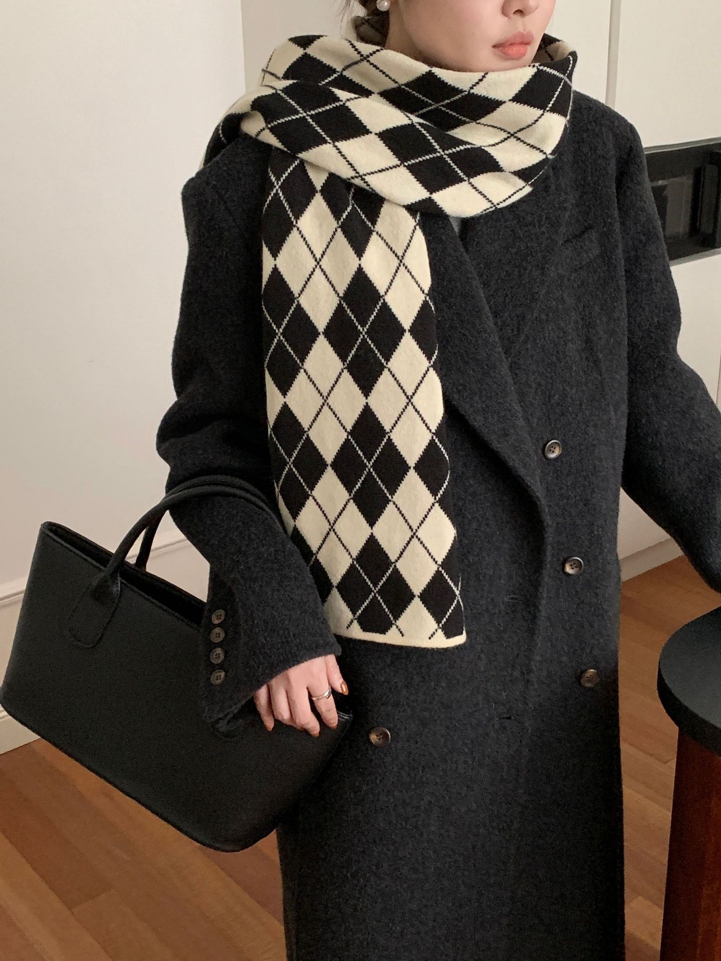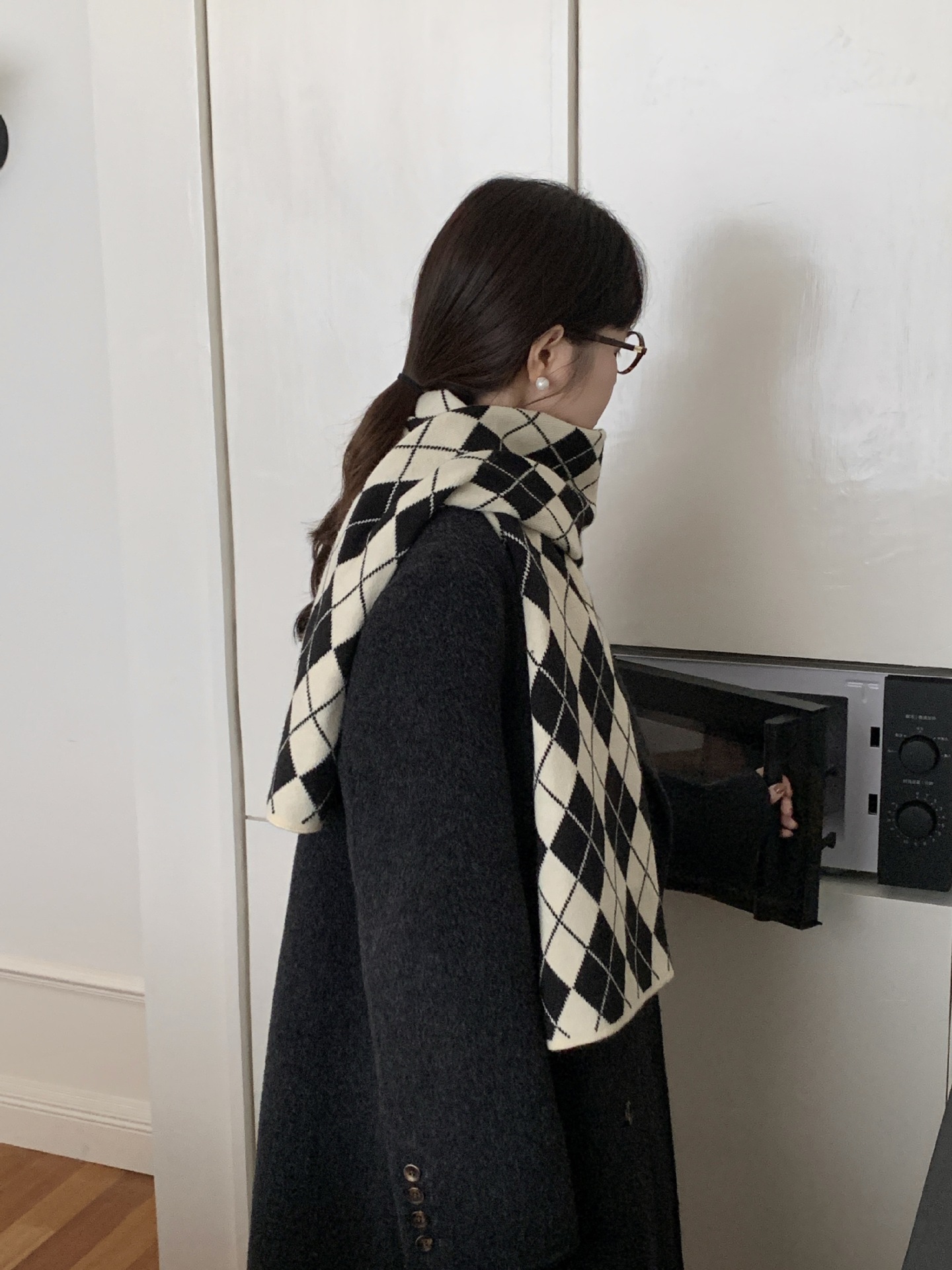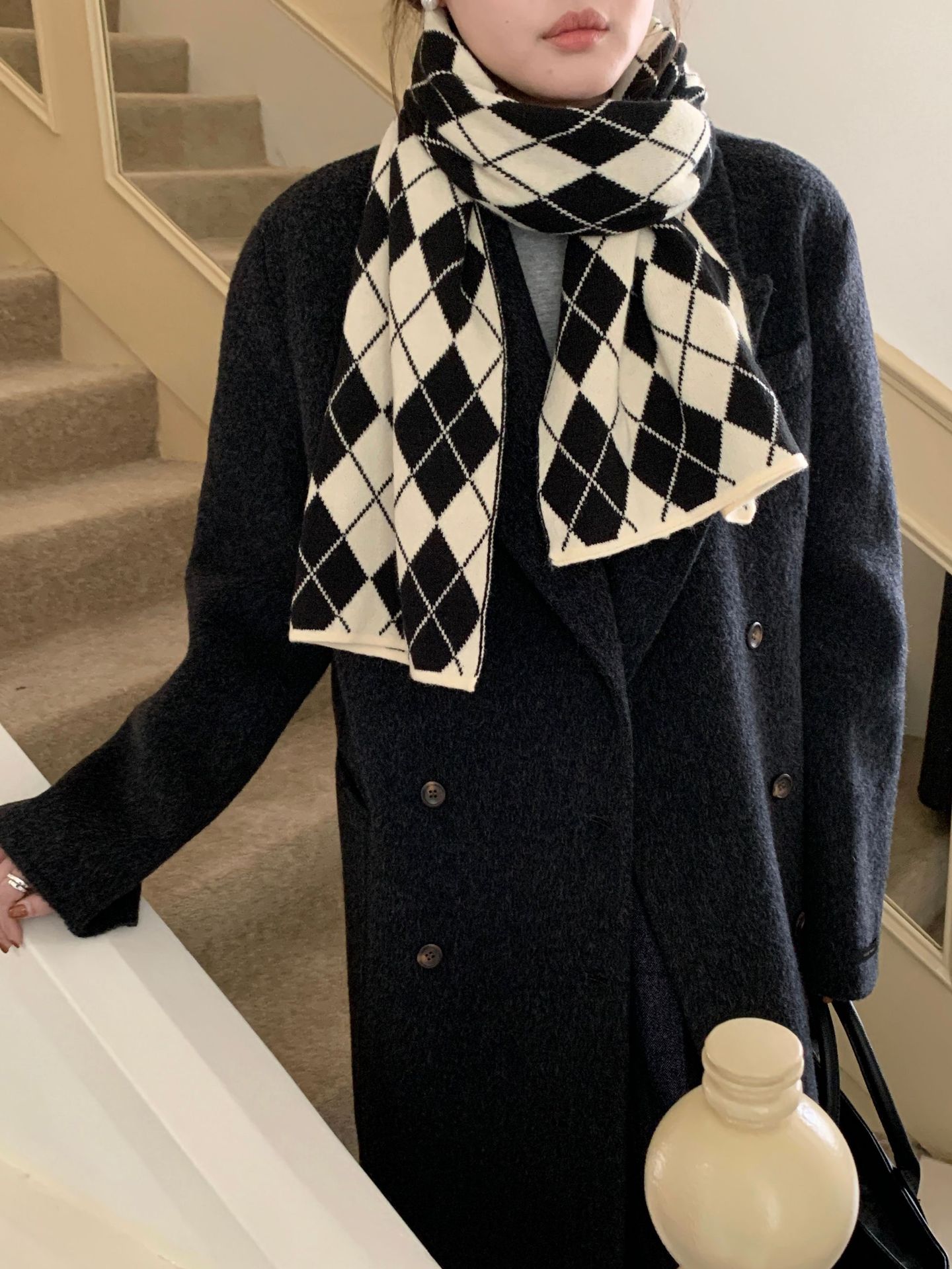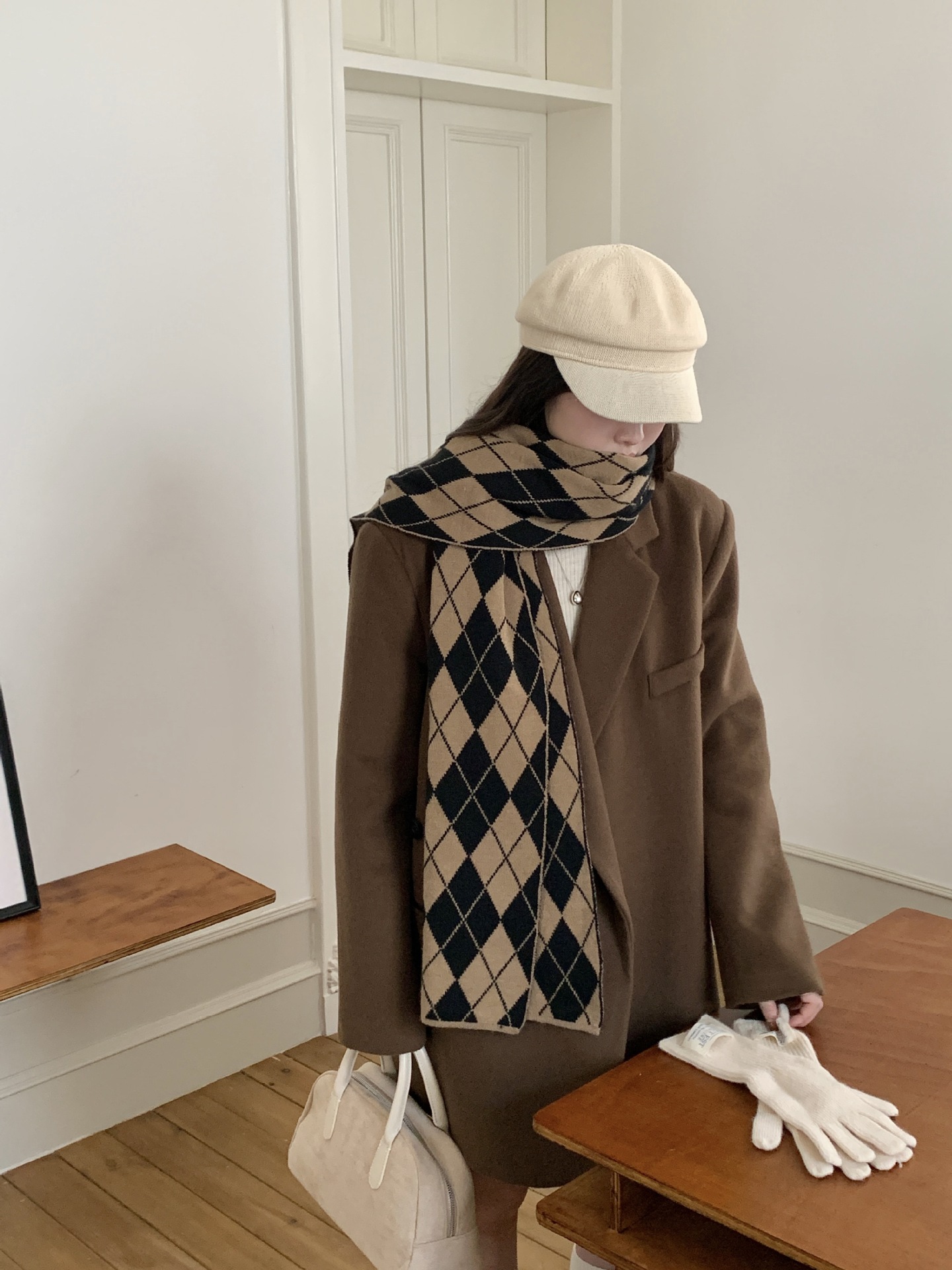 新款平价围巾女秋冬韩系复古大菱形双面撞色拼色格子百搭针织围脖