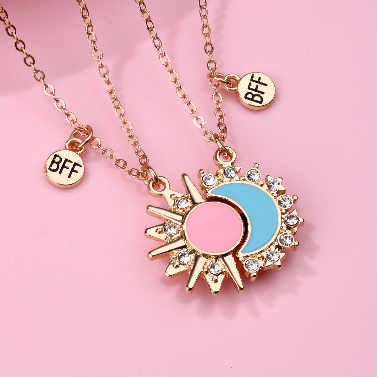 新款镶钻日月磁吸项链 简约ins风好朋友粉蓝合金滴油情侣吊坠批发