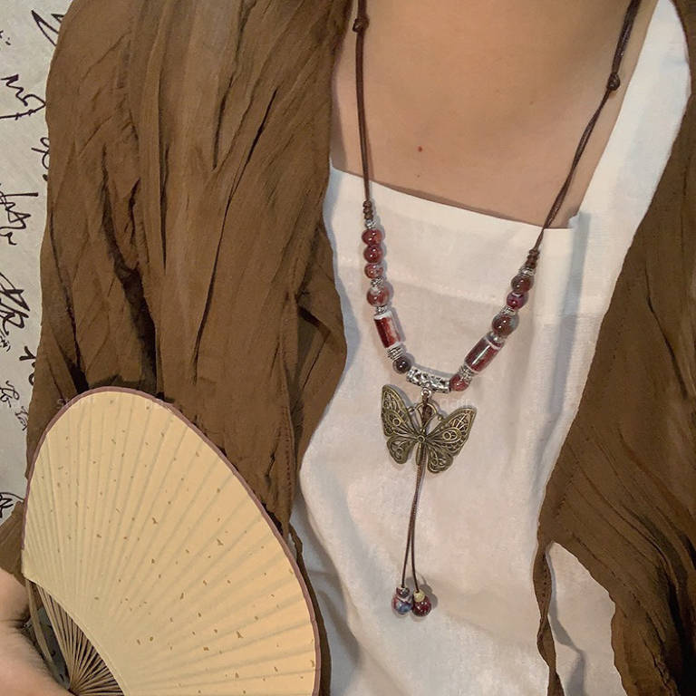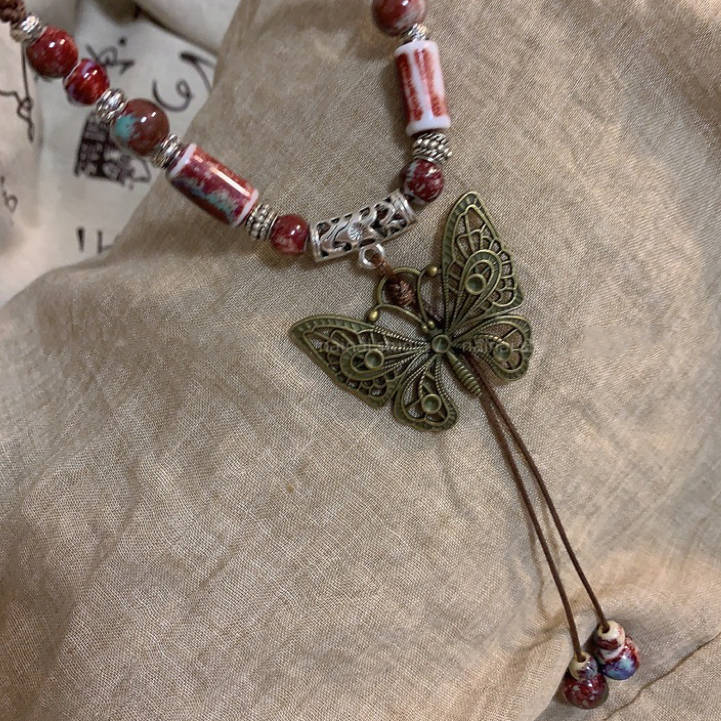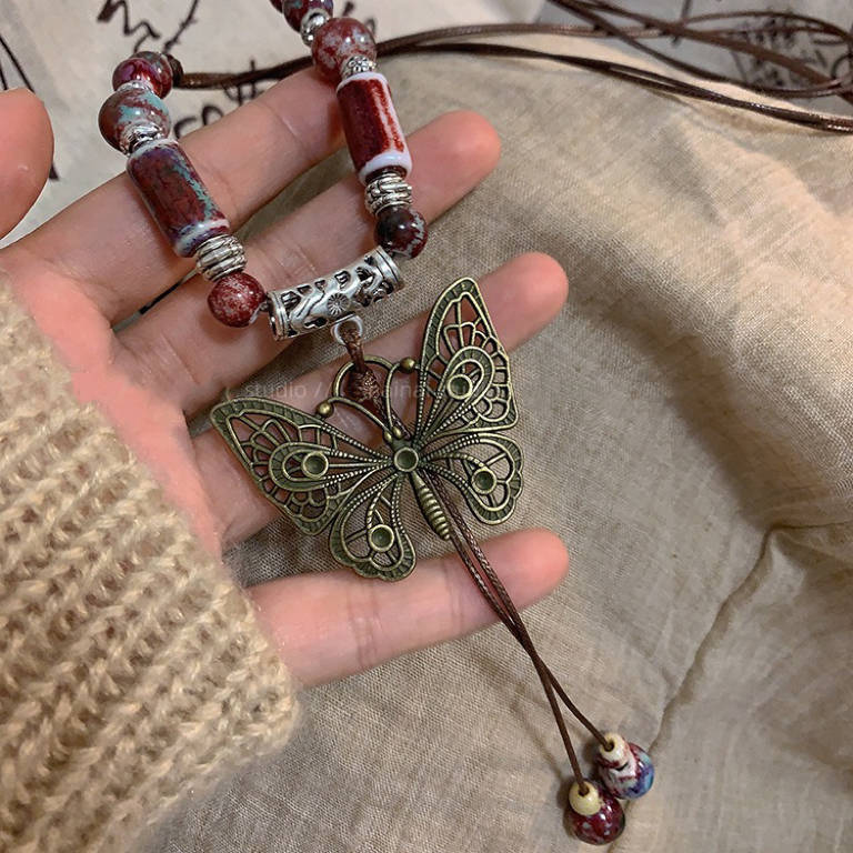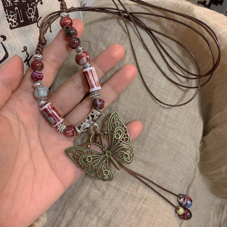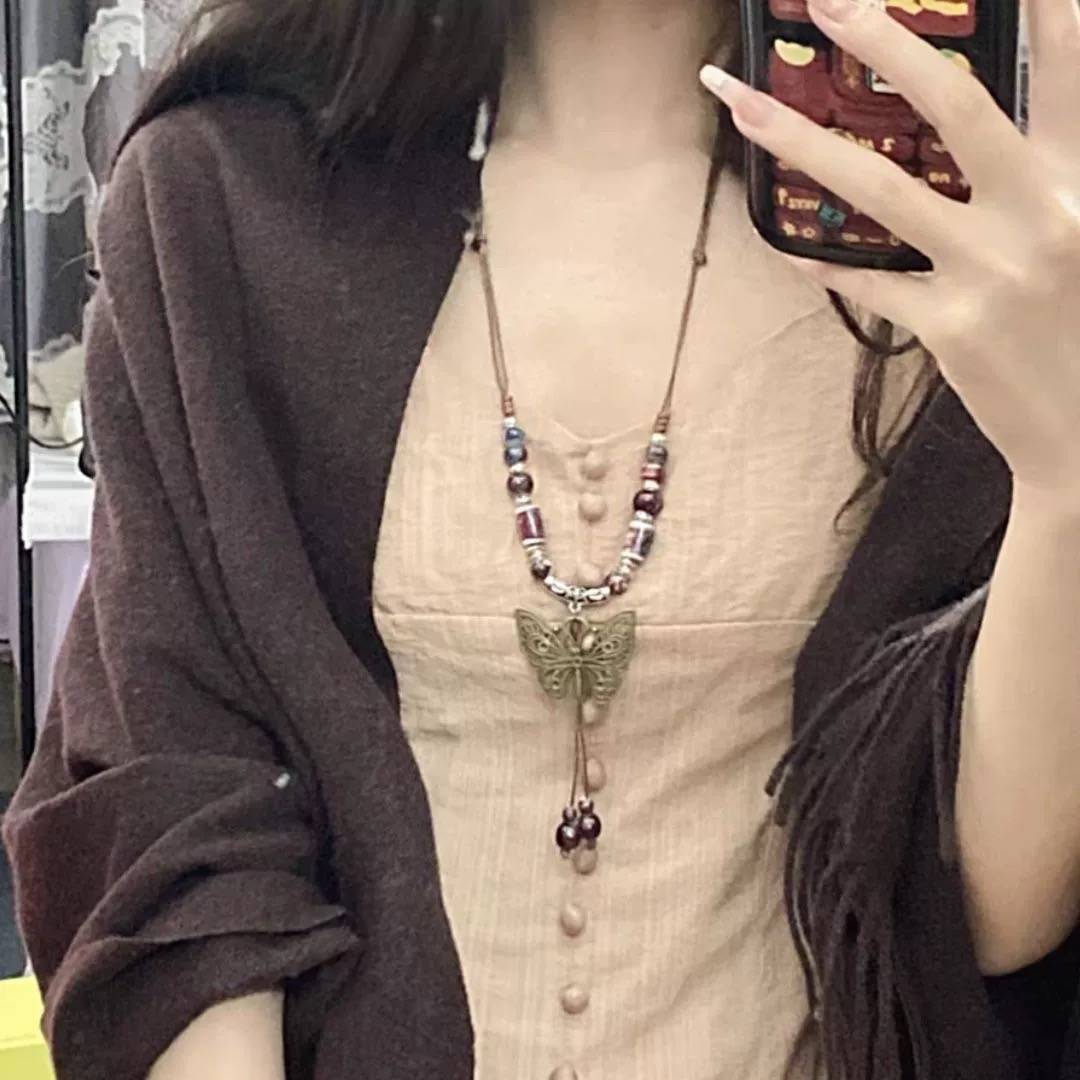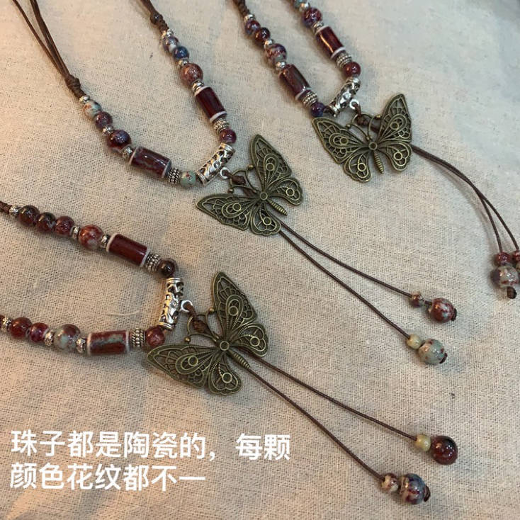 复古民族风陶瓷蝴蝶铃铛吊坠项链女2023年新款潮长款毛衣链配饰品