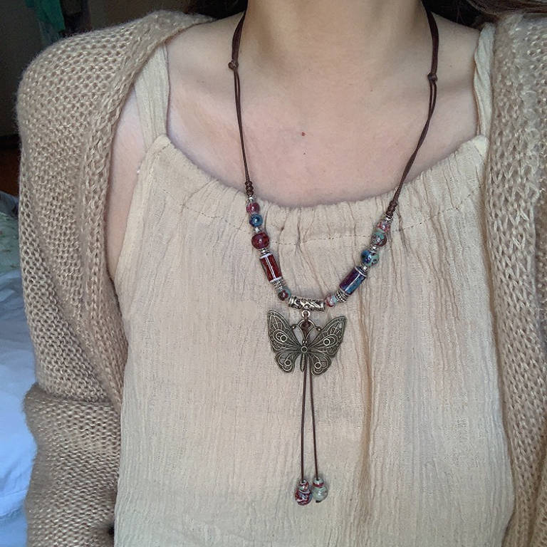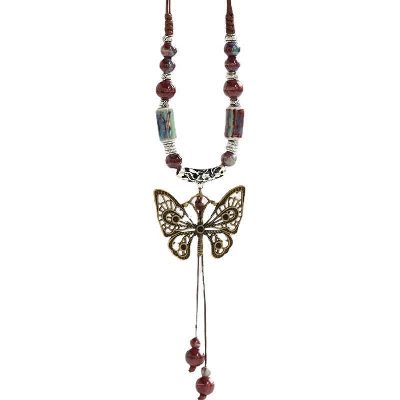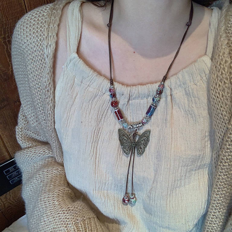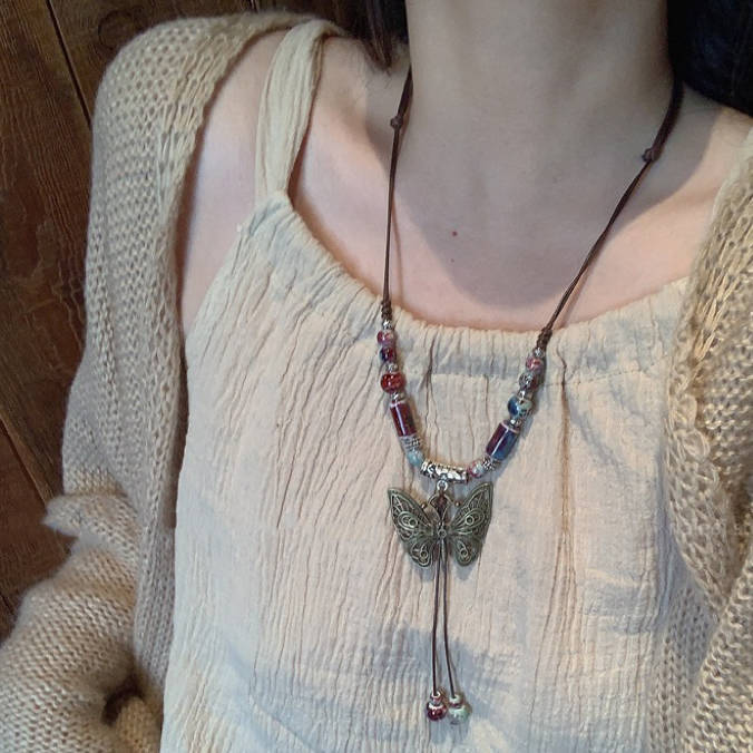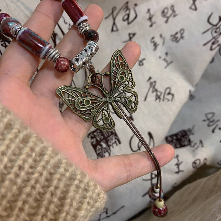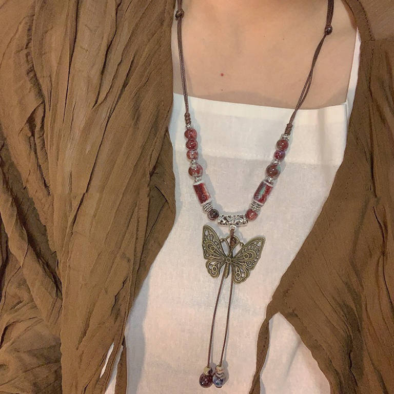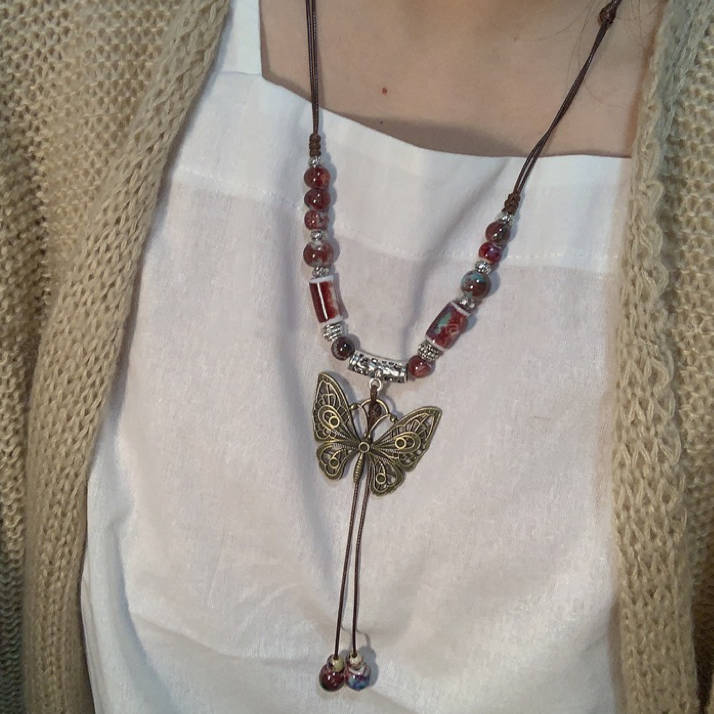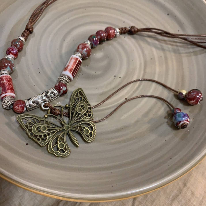 复古民族风陶瓷蝴蝶铃铛吊坠项链女2023年新款潮长款毛衣链配饰品