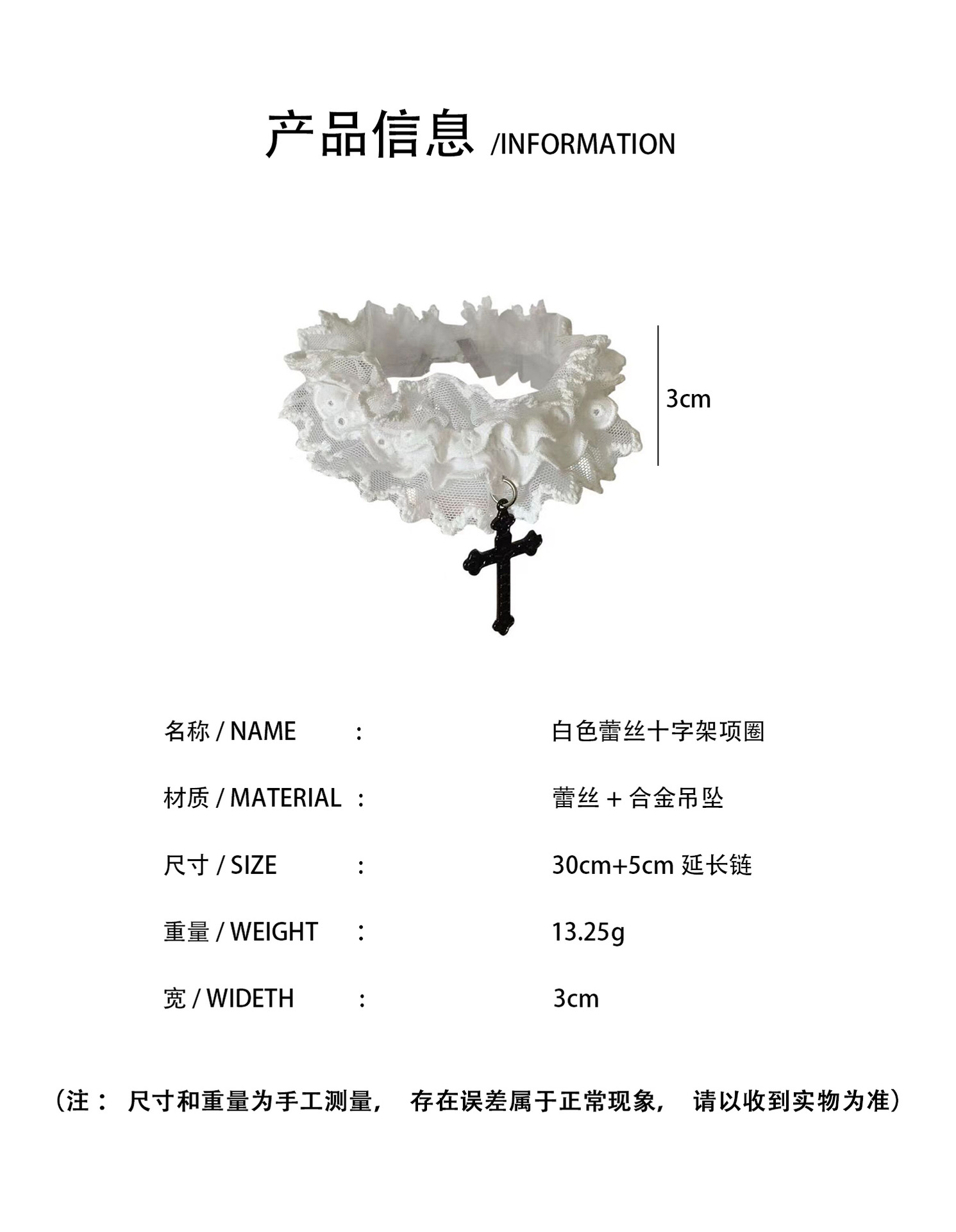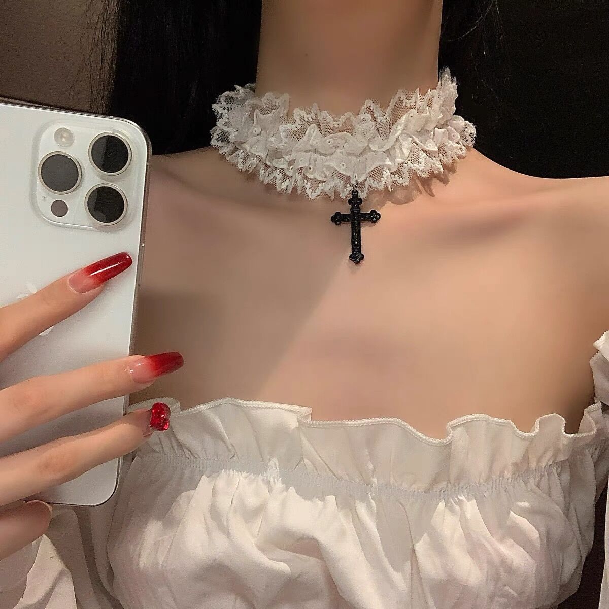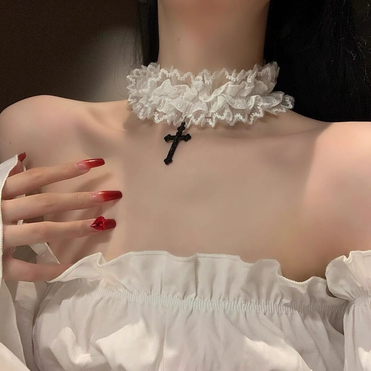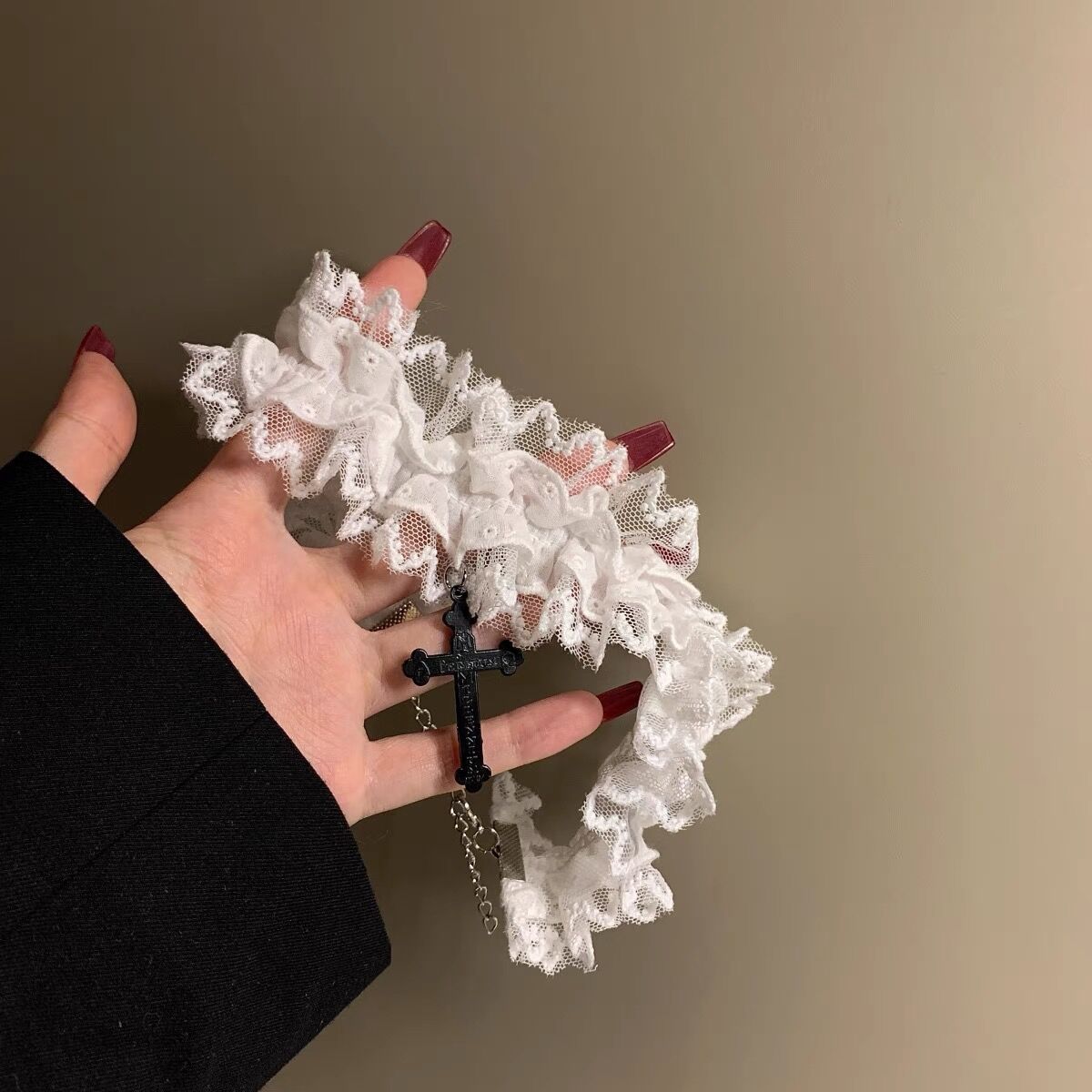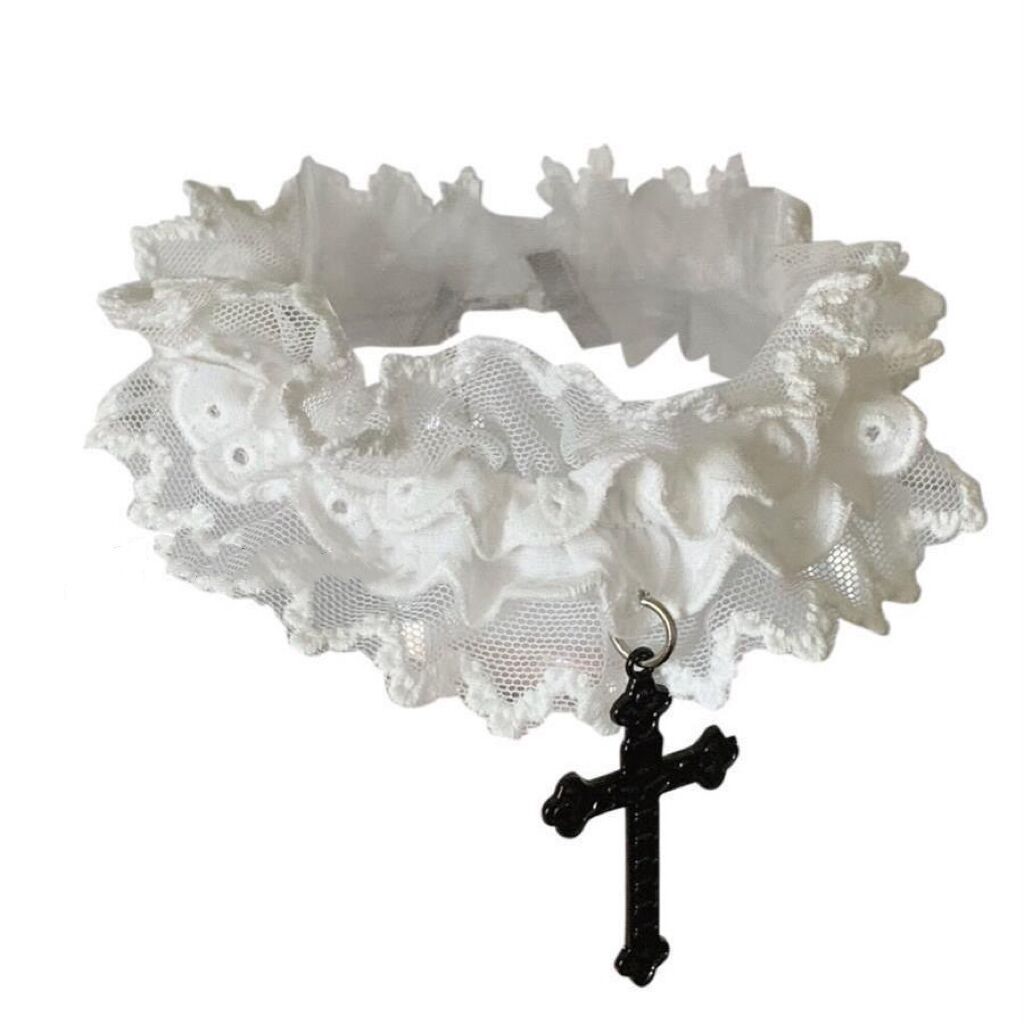双层蕾丝十字架松紧蕾丝花边腿环项链choker哥特古早味蕾丝颈带