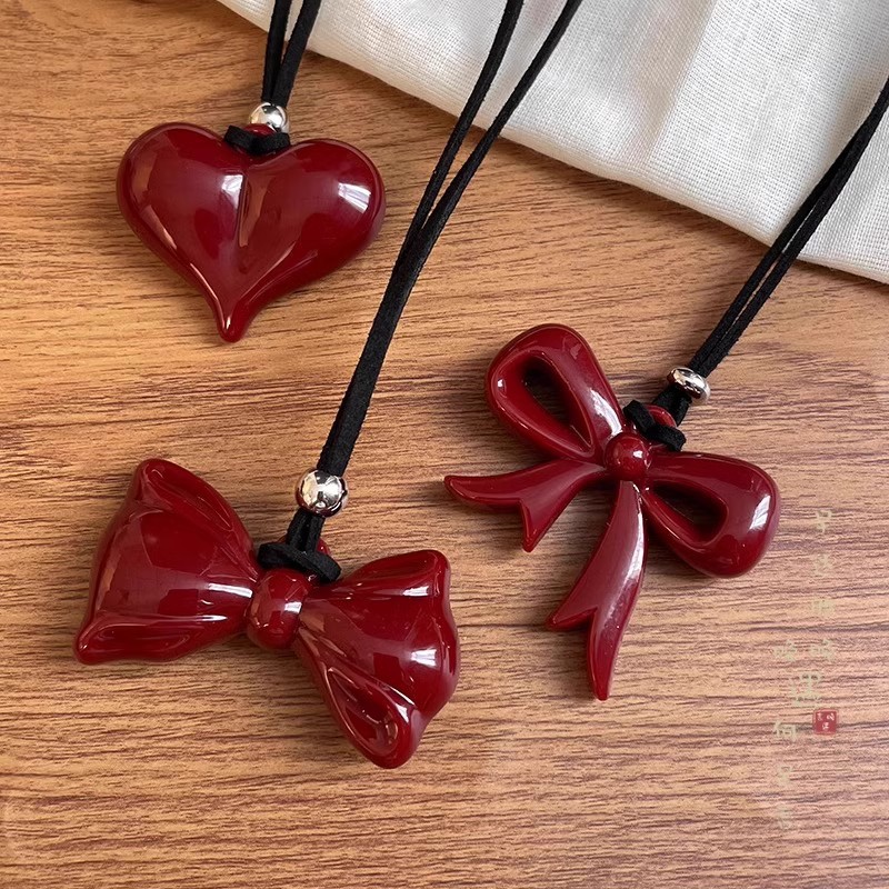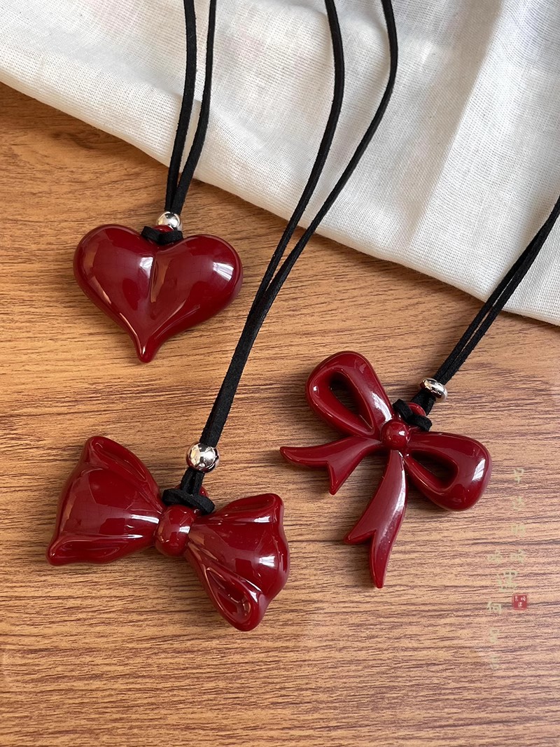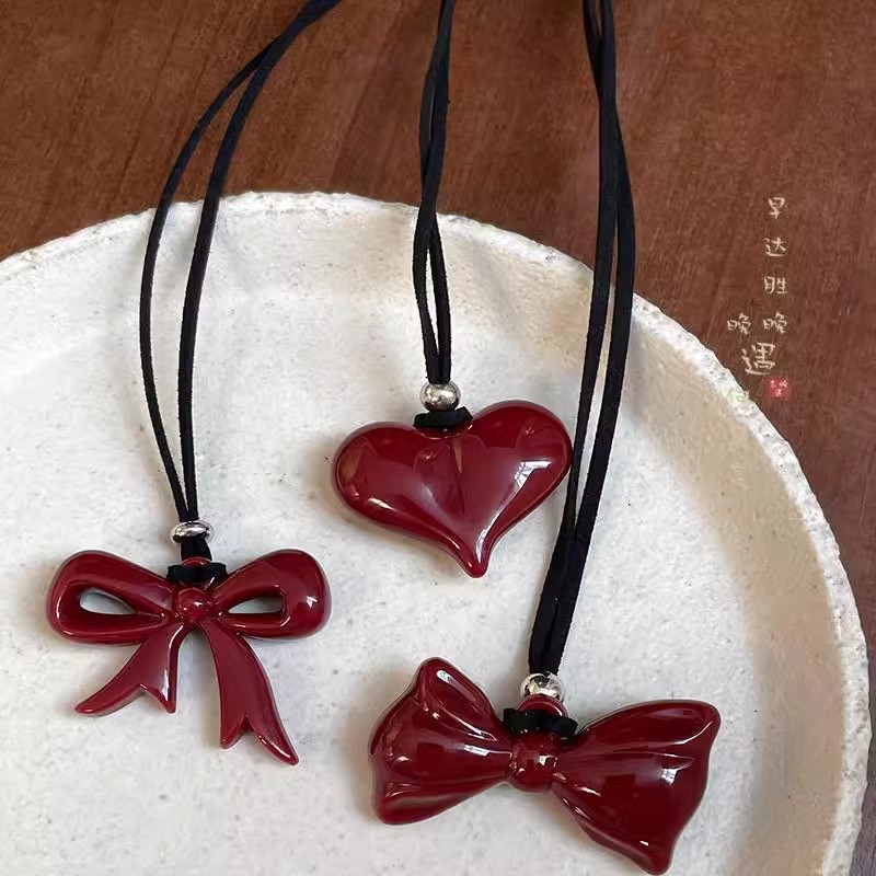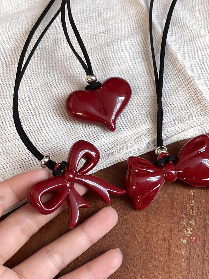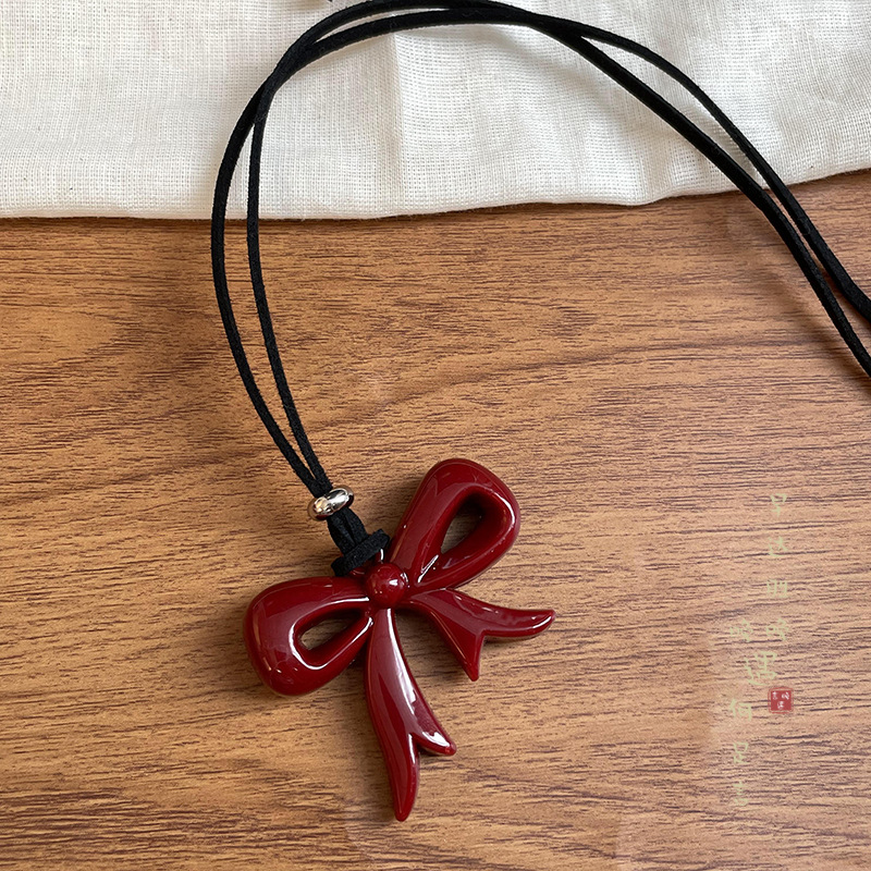 秋冬酒红色丝带蝴蝶结吊坠项链女爱心安可拉红长款毛衣链百搭配饰