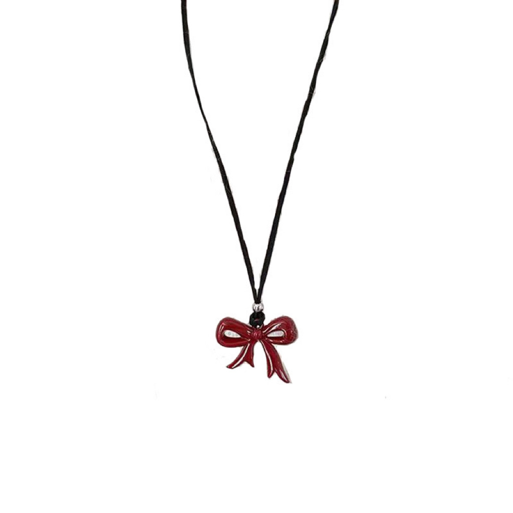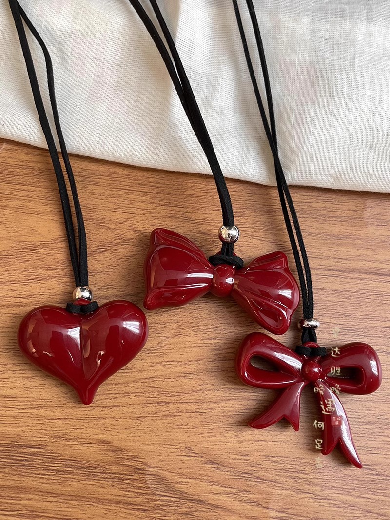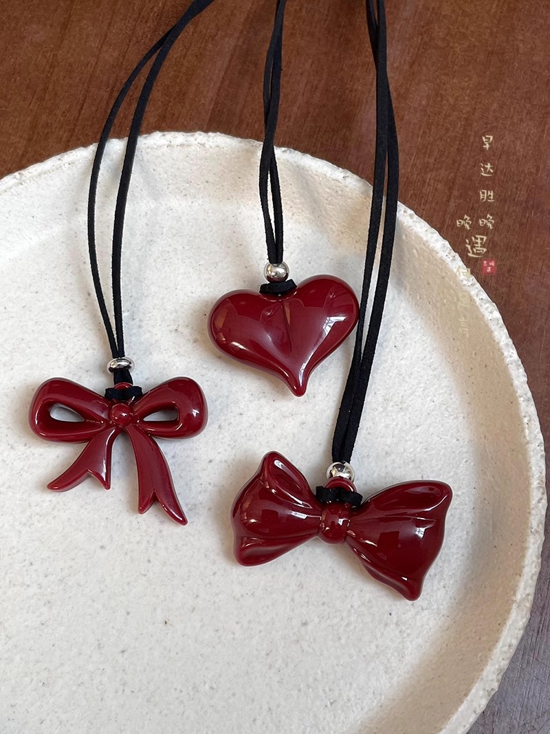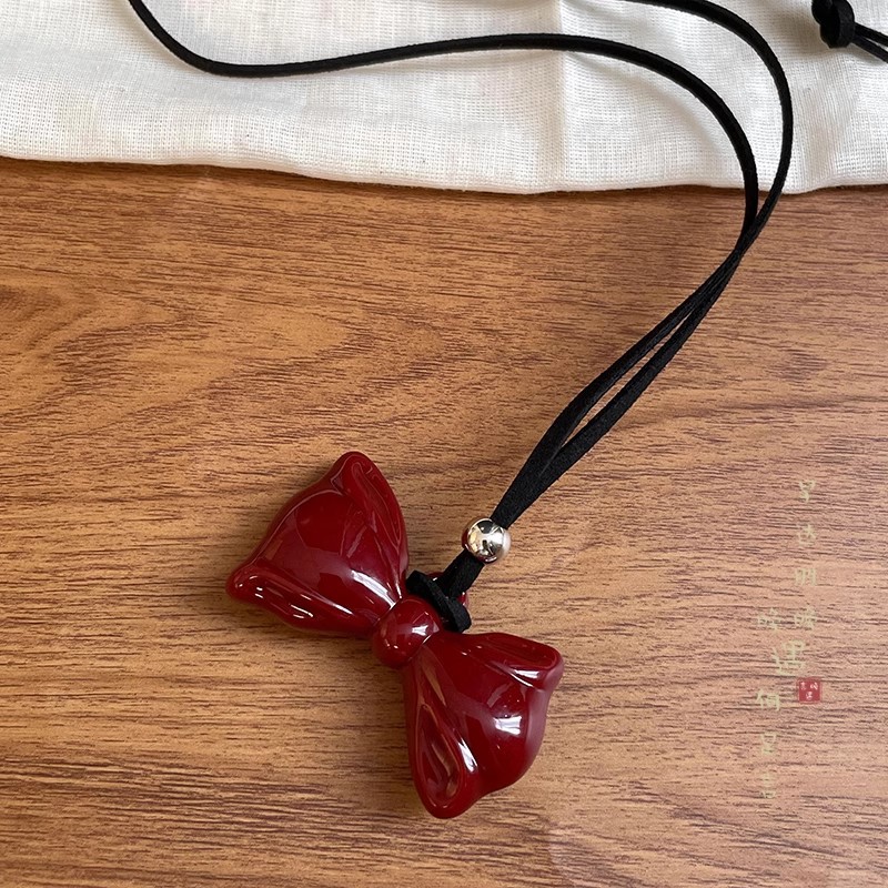 秋冬酒红色丝带蝴蝶结吊坠项链女爱心安可拉红长款毛衣链百搭配饰