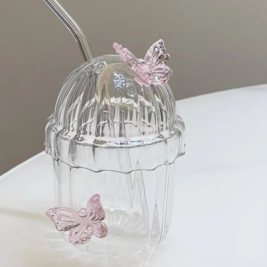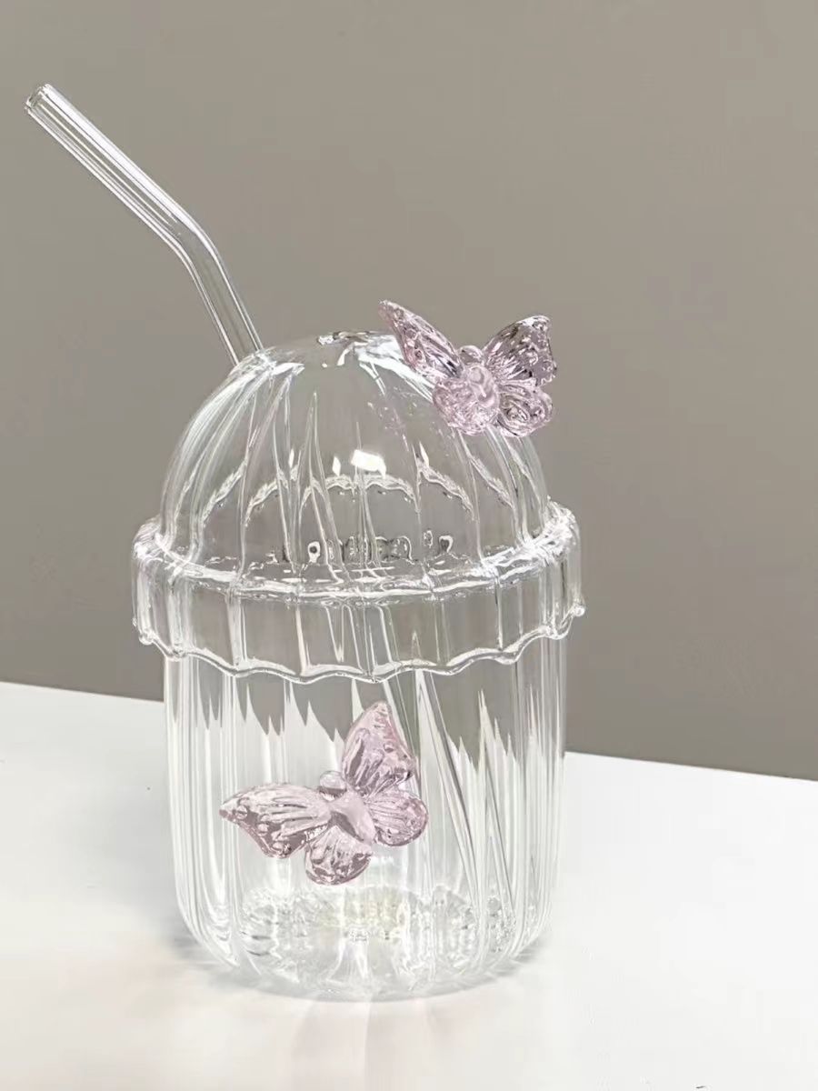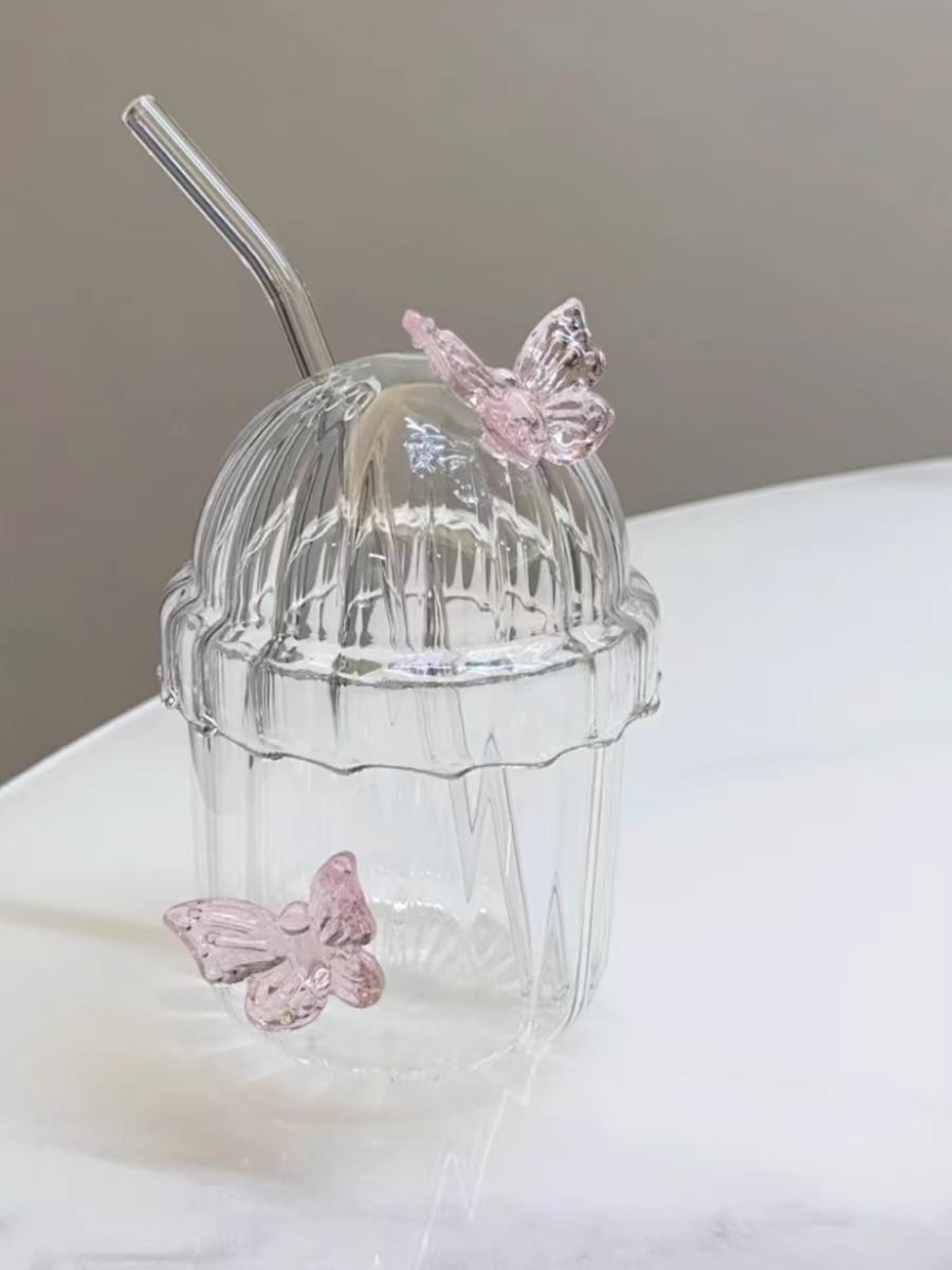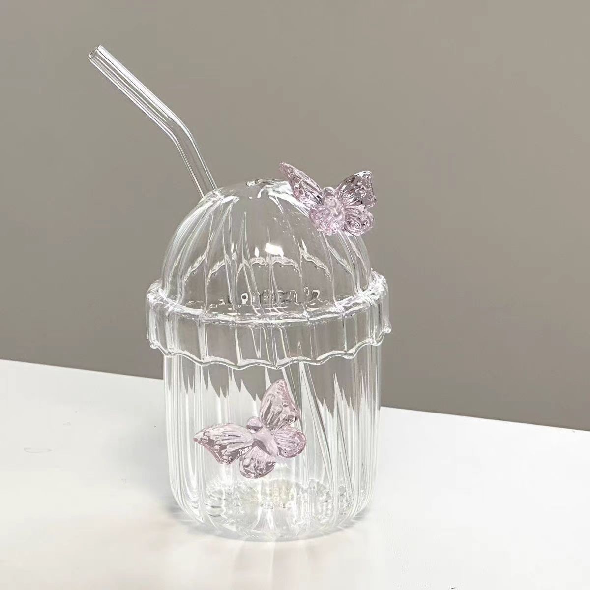 蝴蝶啵啵杯BOBO吸管杯带带盖高硼硅玻璃杯耐高温牛奶杯咖啡杯果汁