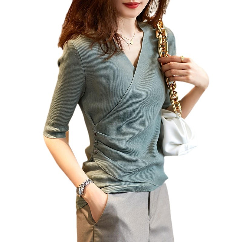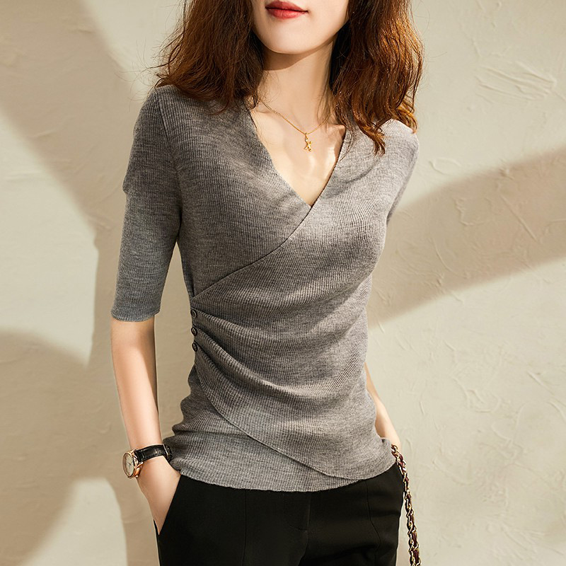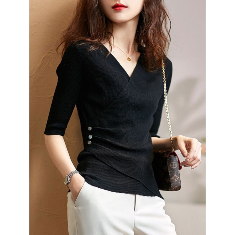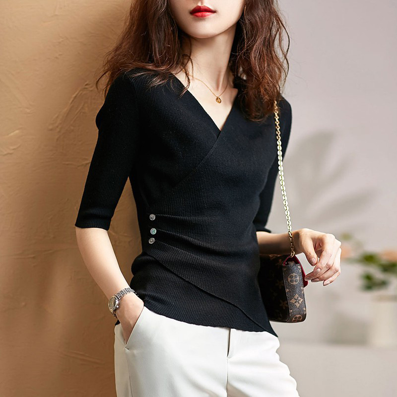 中袖温柔御姐轻熟风V领修身内搭系高级感上衣欧货时尚打底针织衫