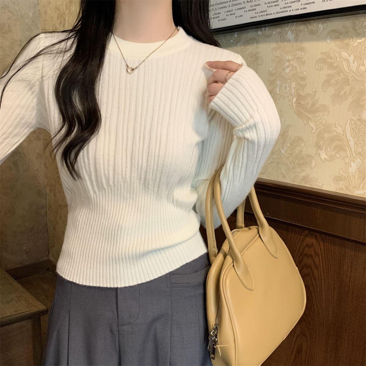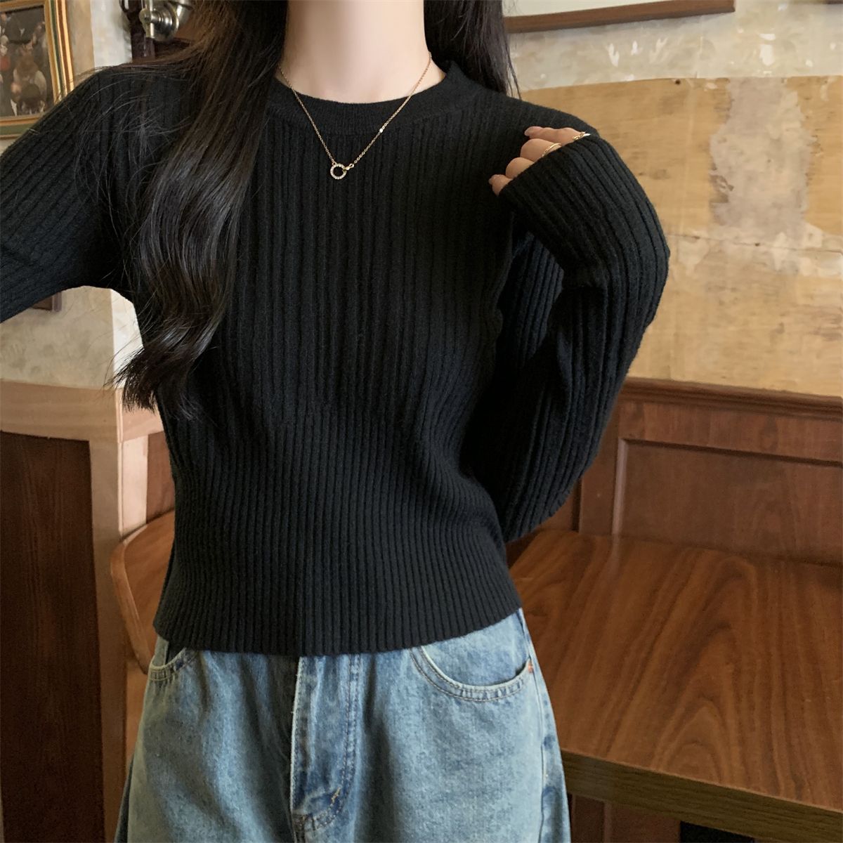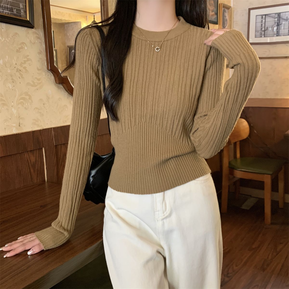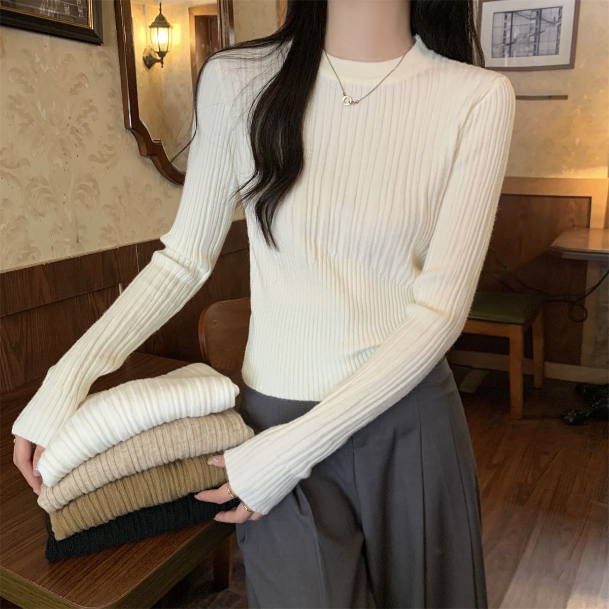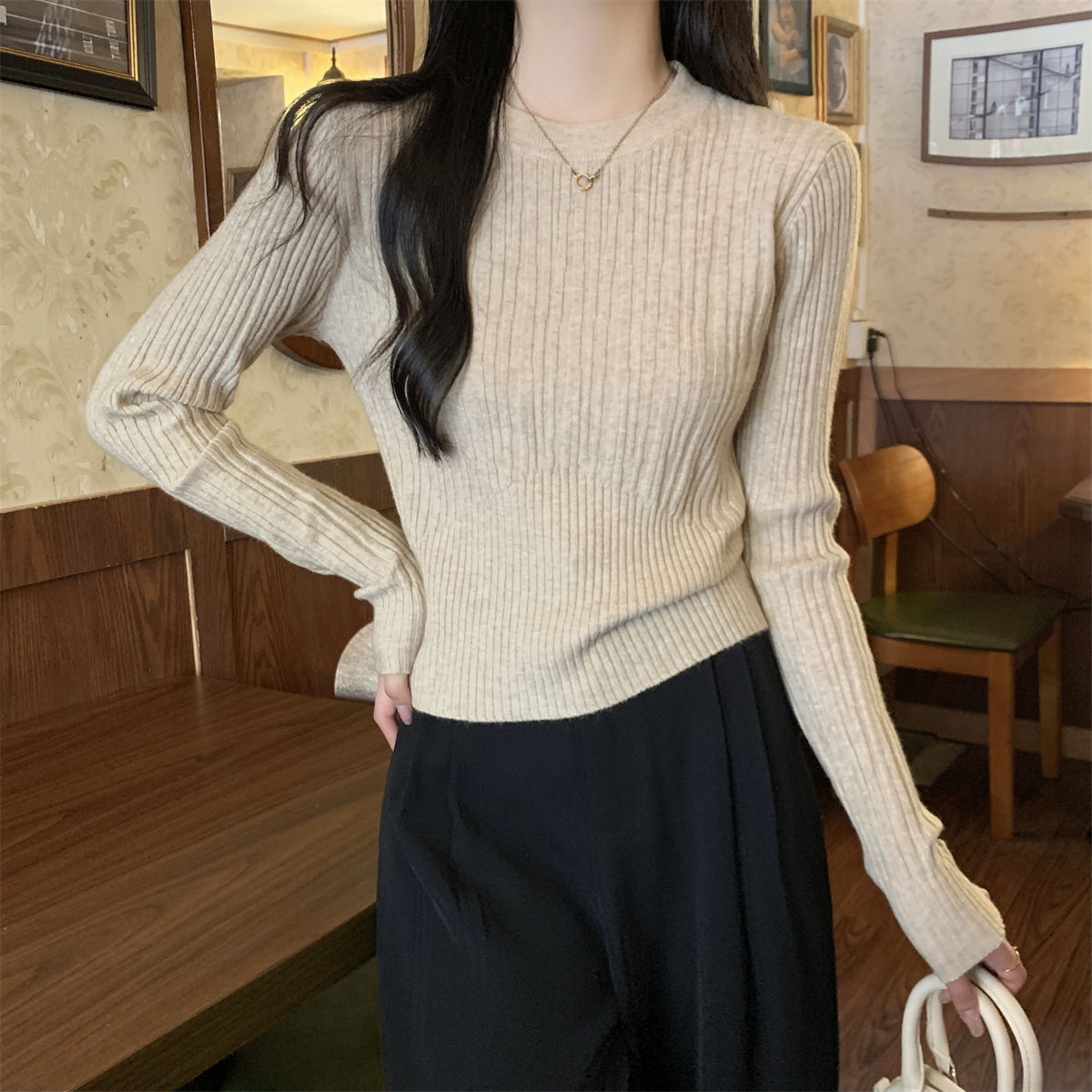 韩版坑条圆领长袖针织衫女春季新款小香风高腰修身百搭打底上衣潮