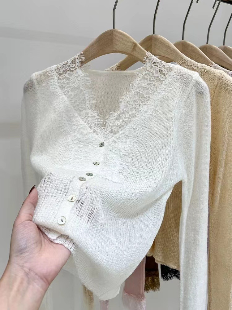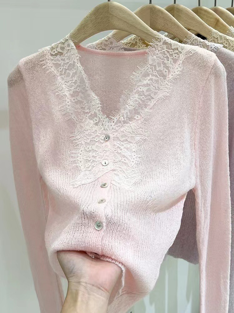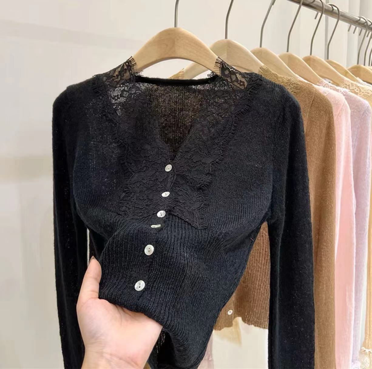 v领长袖针织衫女早秋2023新款蕾丝拼接设计感小众毛衣外套女开衫