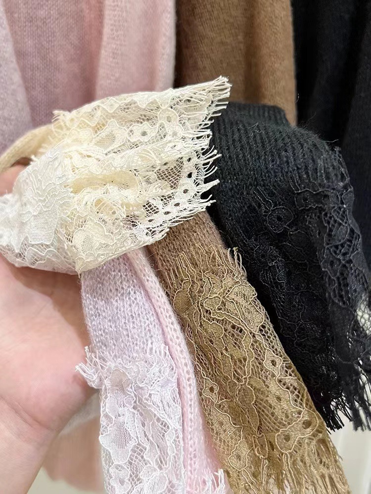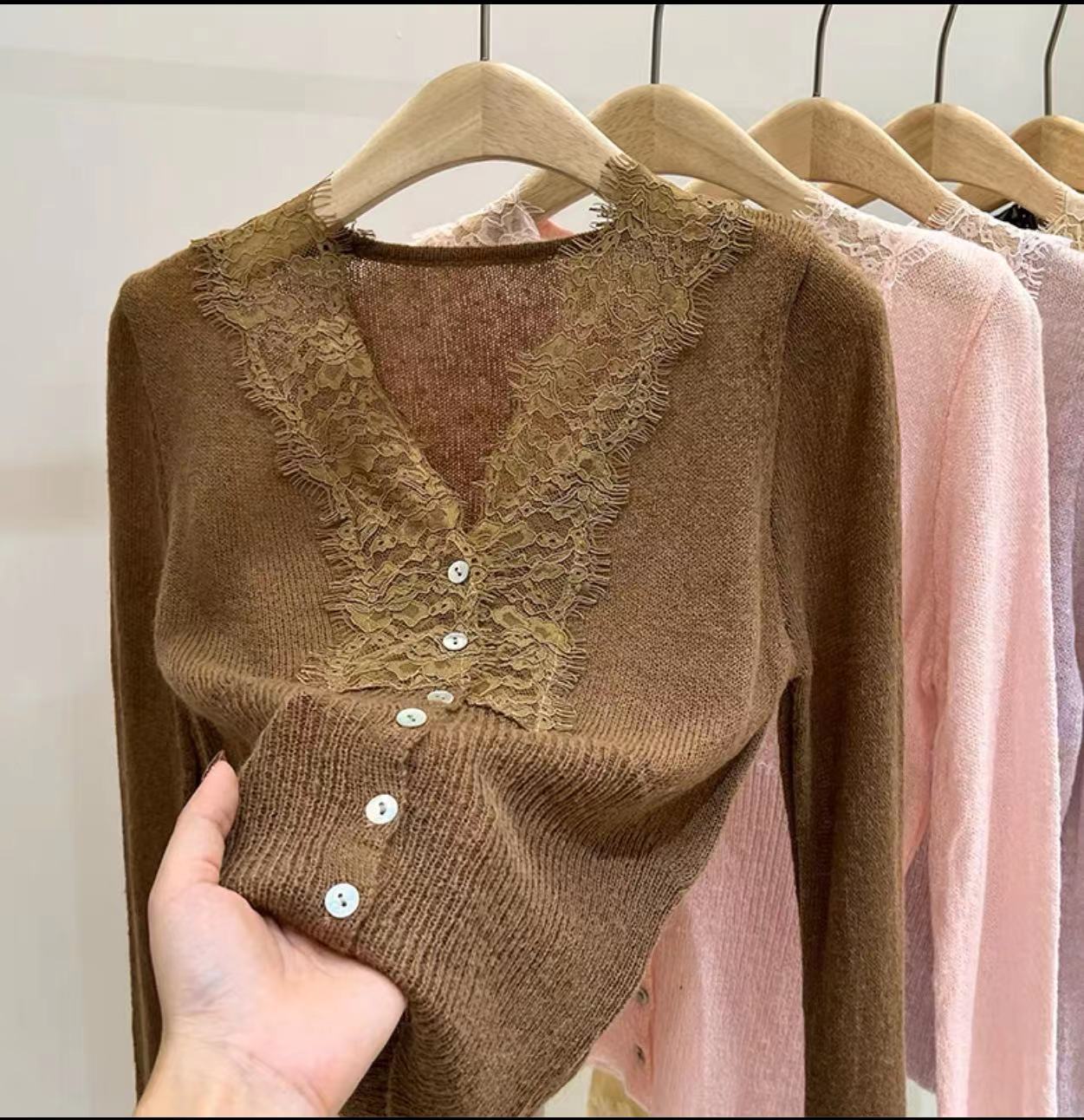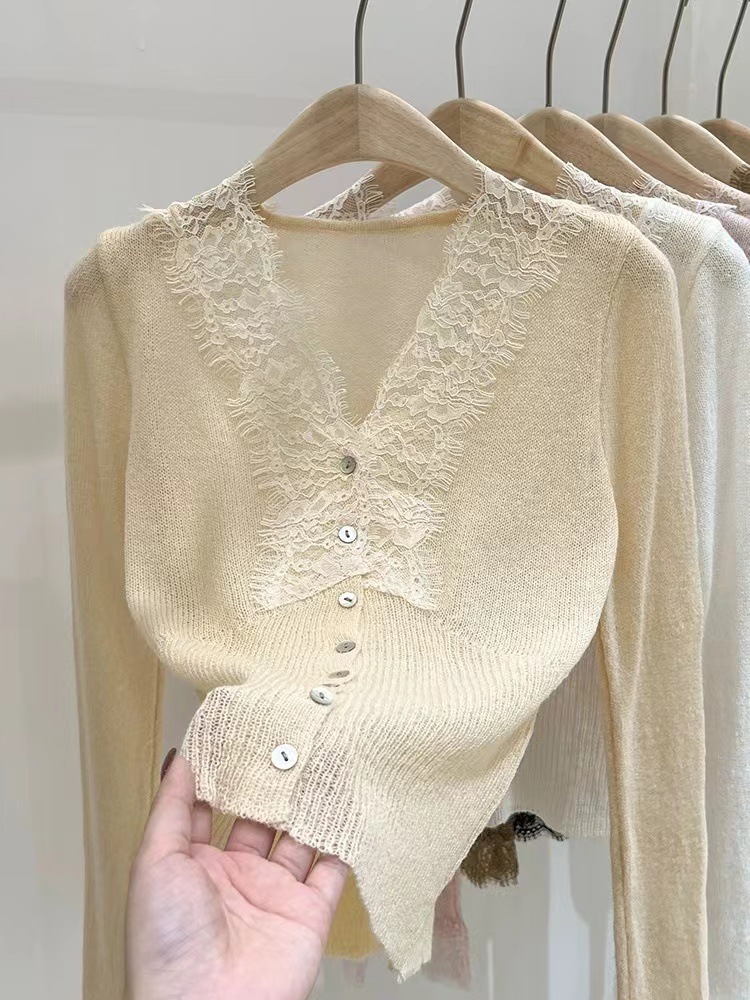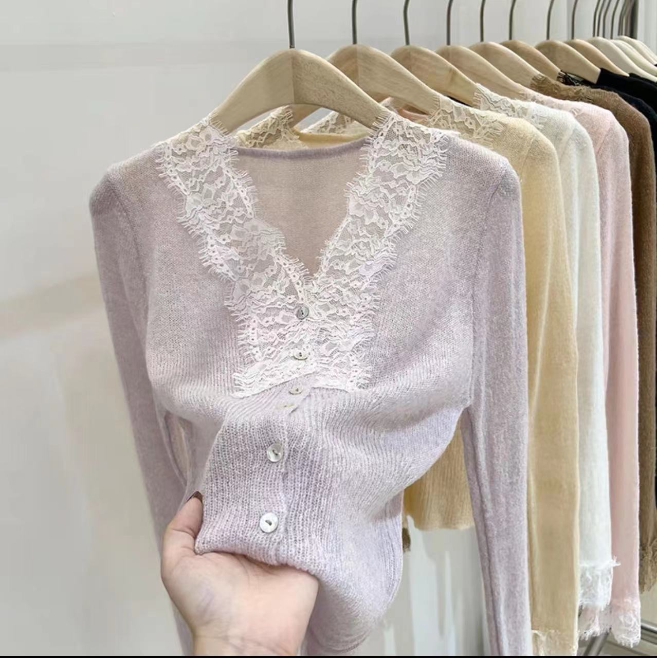 v领长袖针织衫女早秋2023新款蕾丝拼接设计感小众毛衣外套女开衫