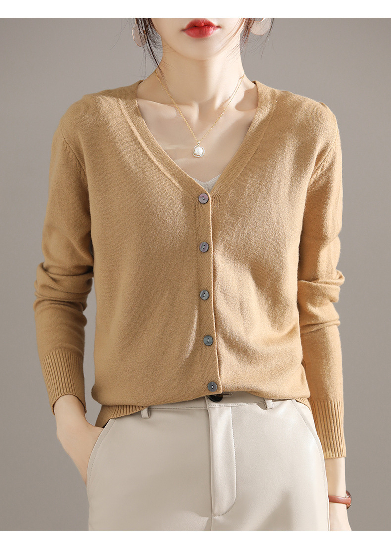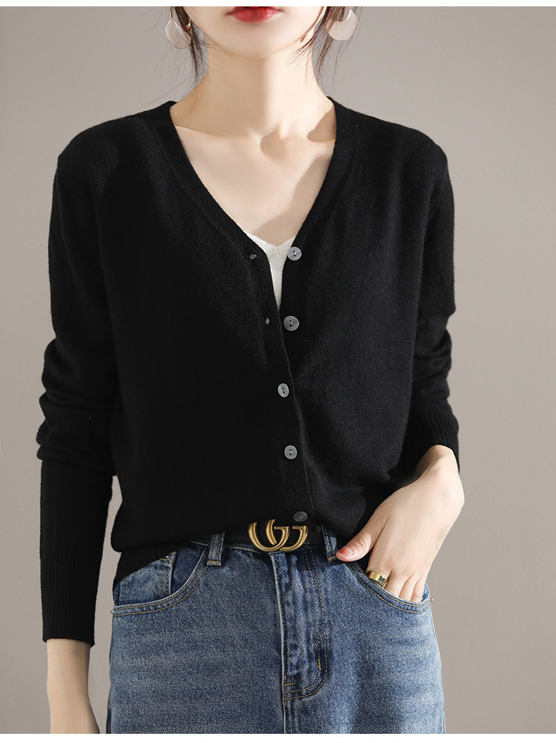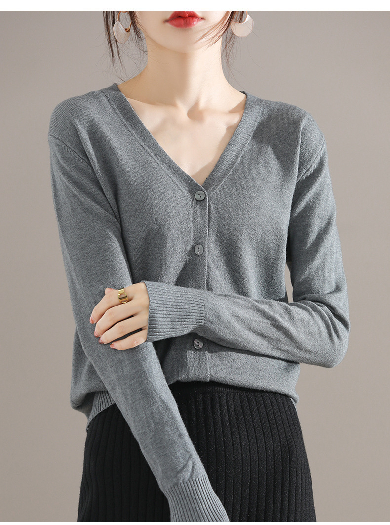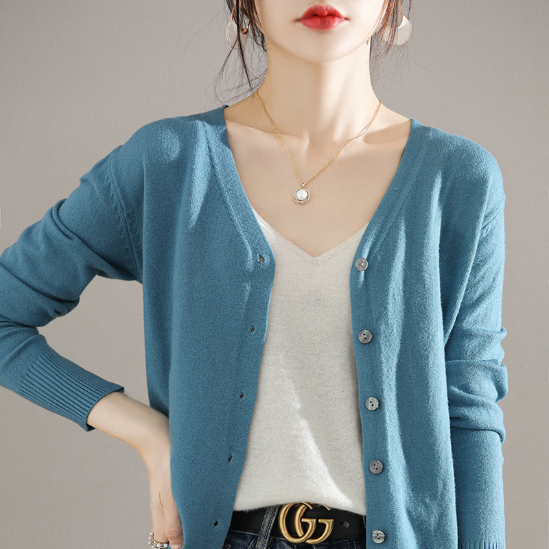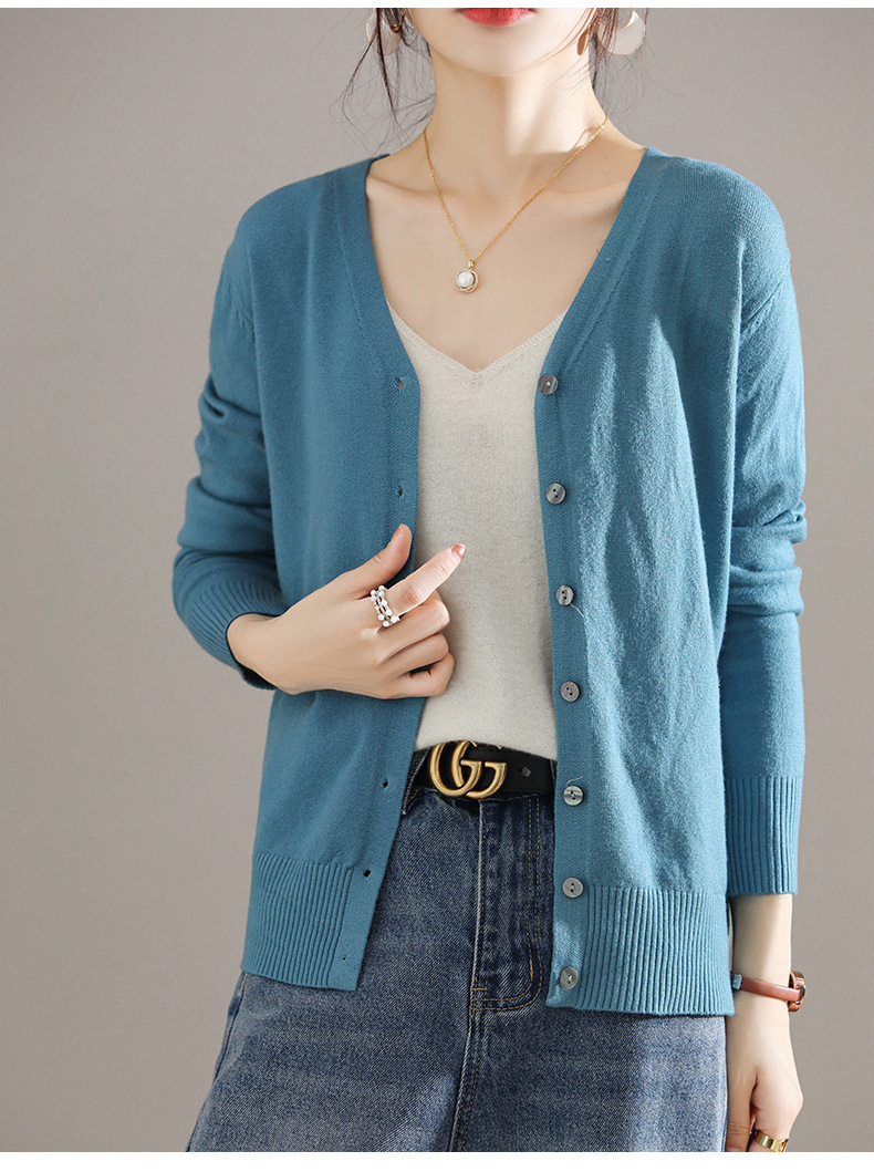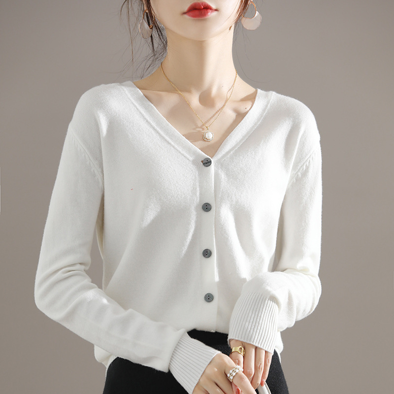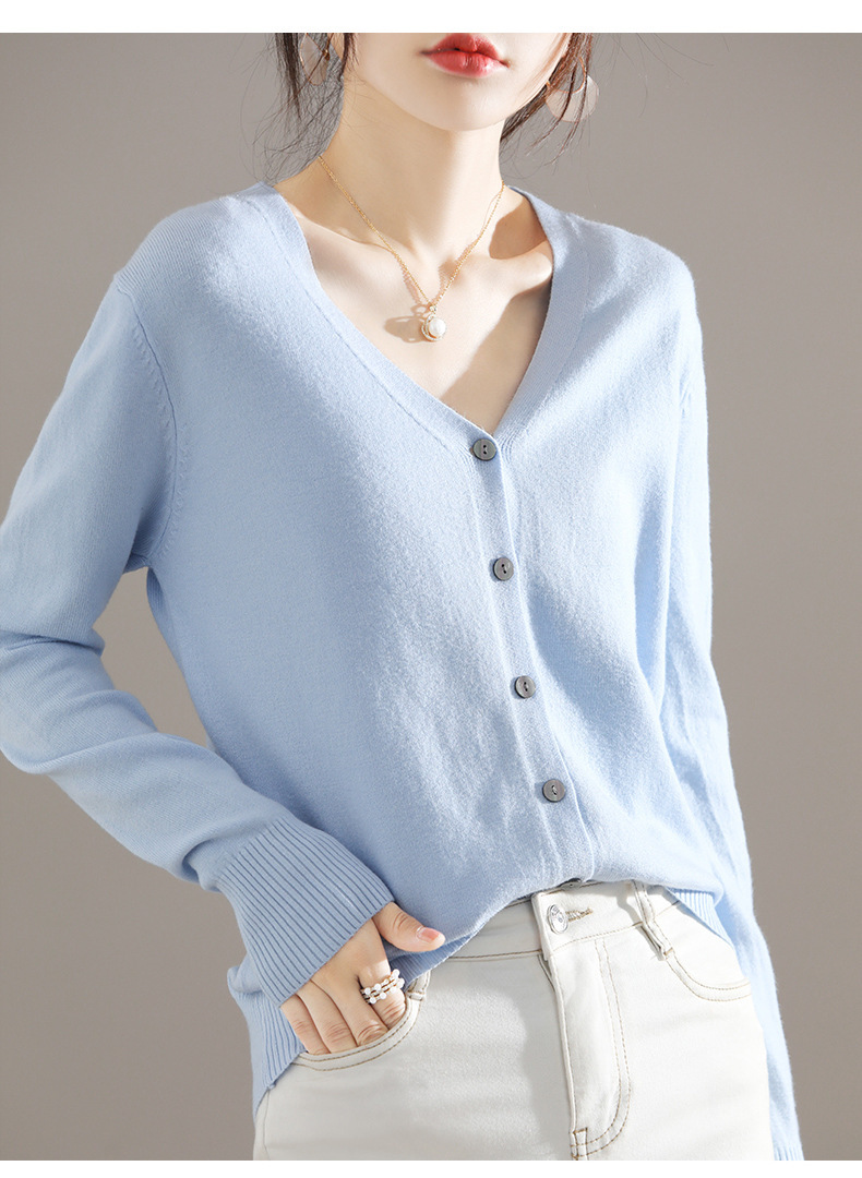 2024秋季薄款V领针织开衫女宽松休闲长袖毛衣小外套百搭打底上衣