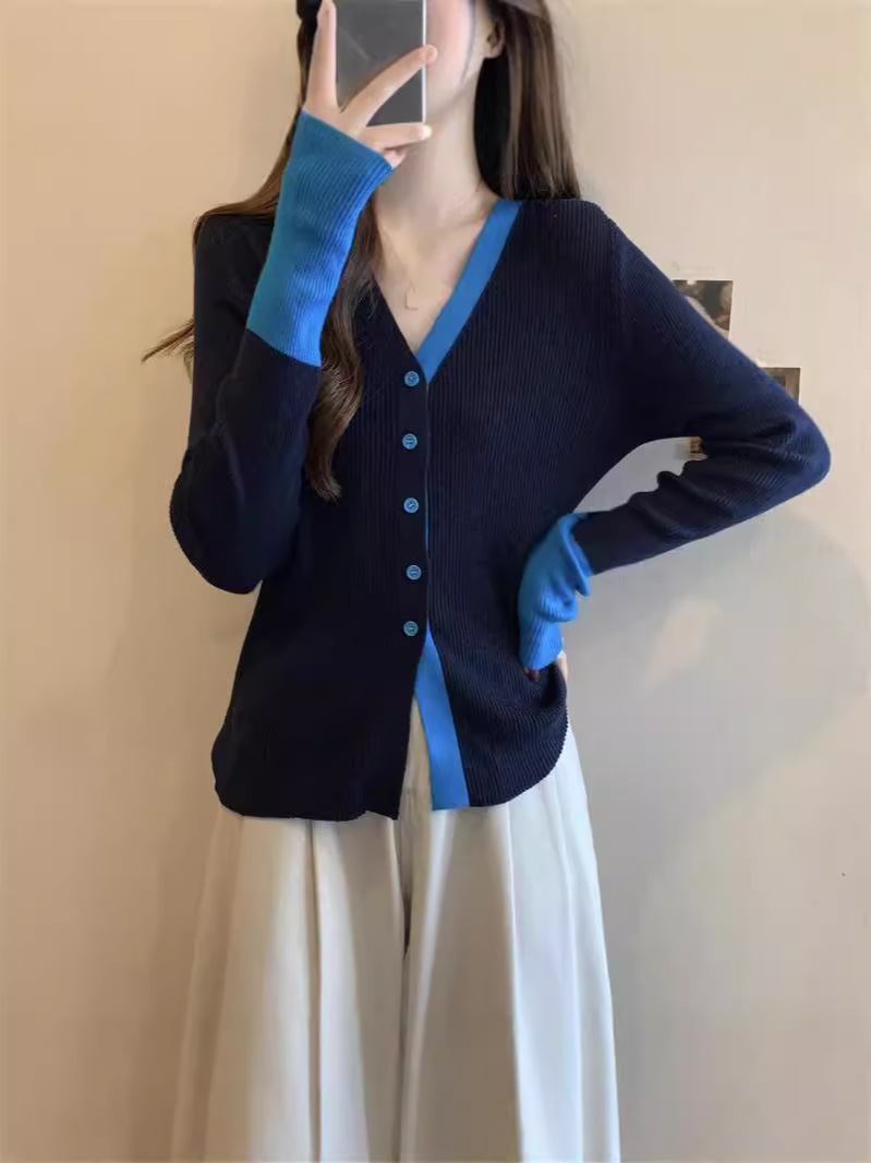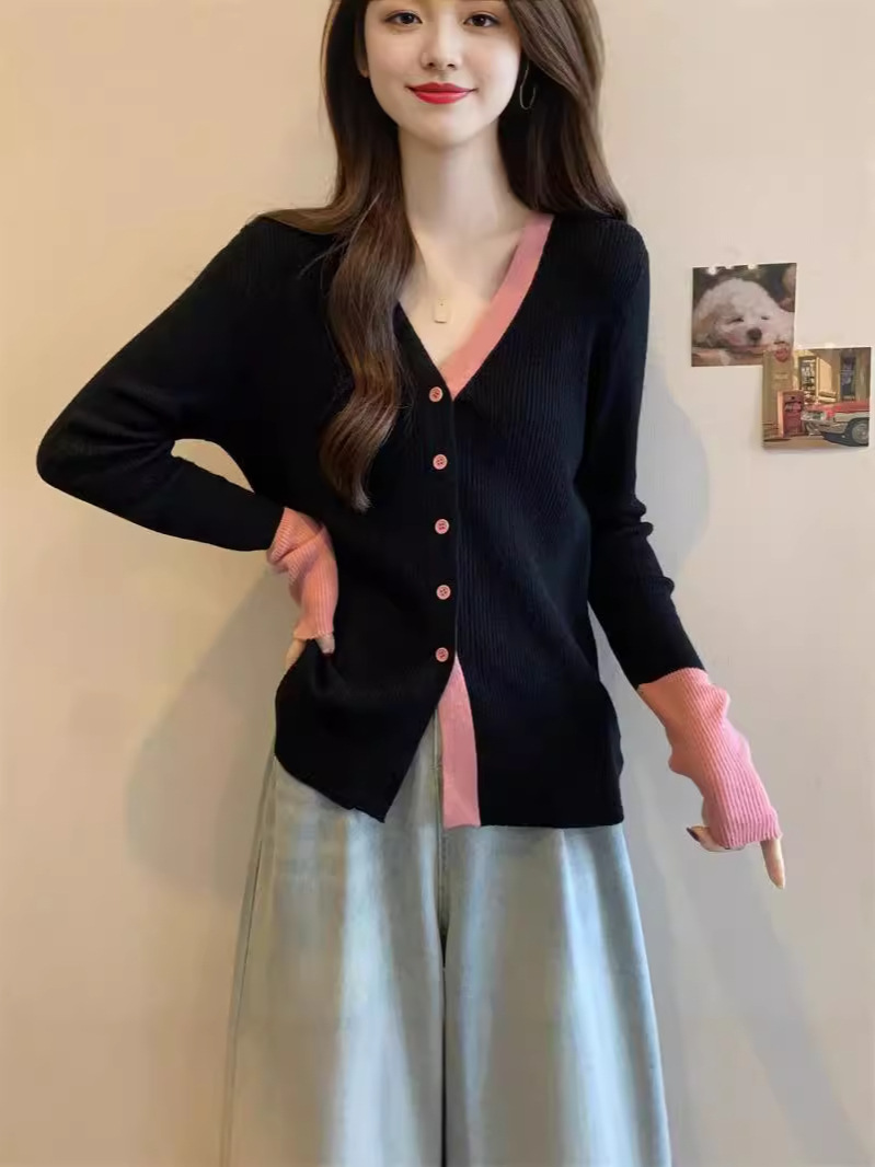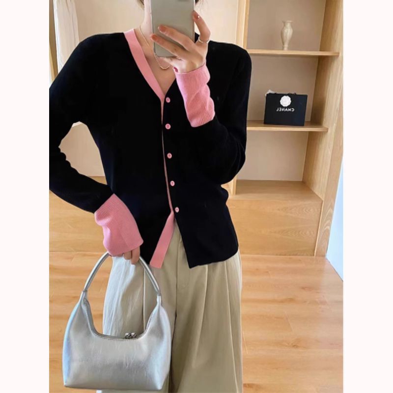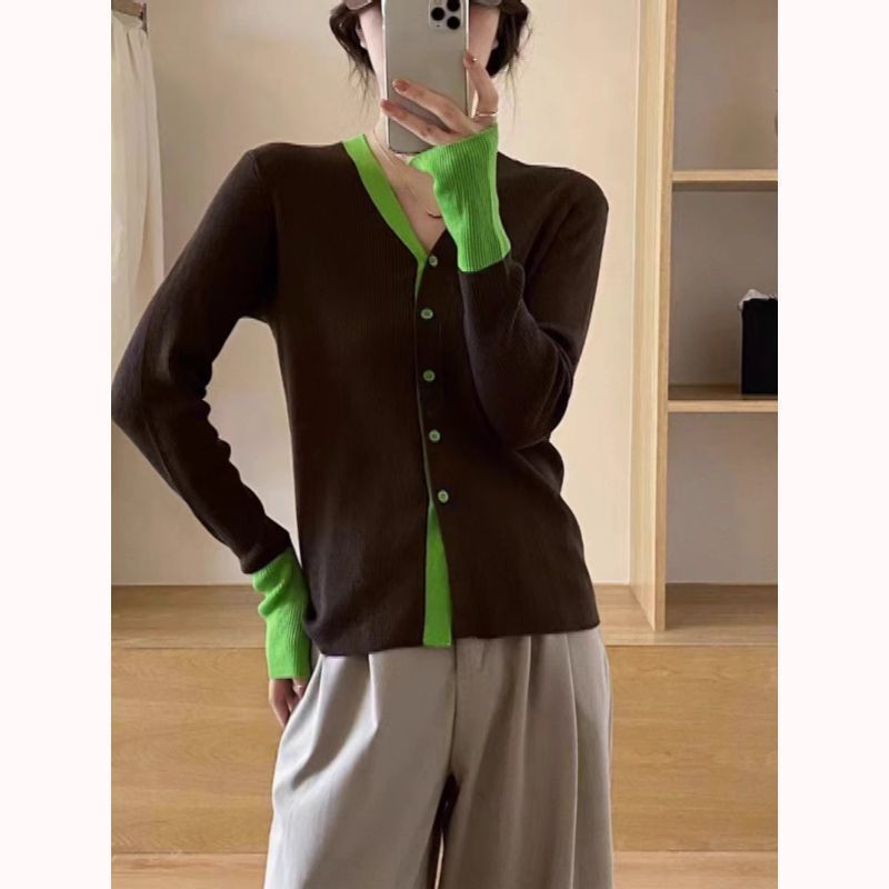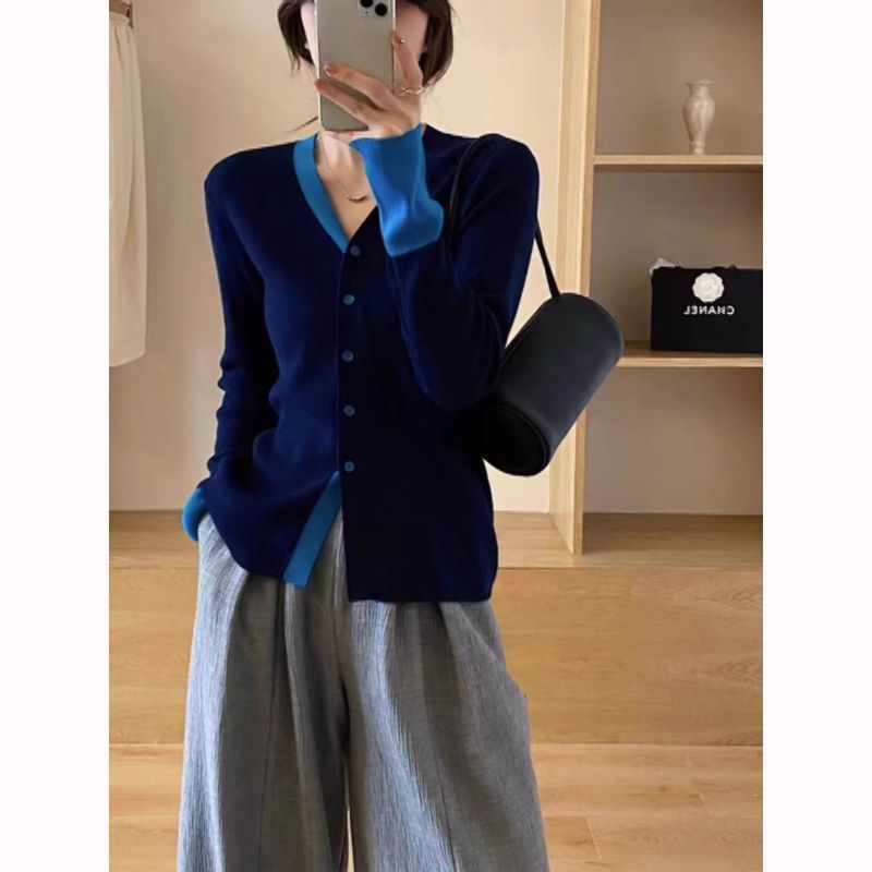 2024春秋新款时尚撞色修身显瘦单排扣针织衫长袖毛衣开衫上衣女厚