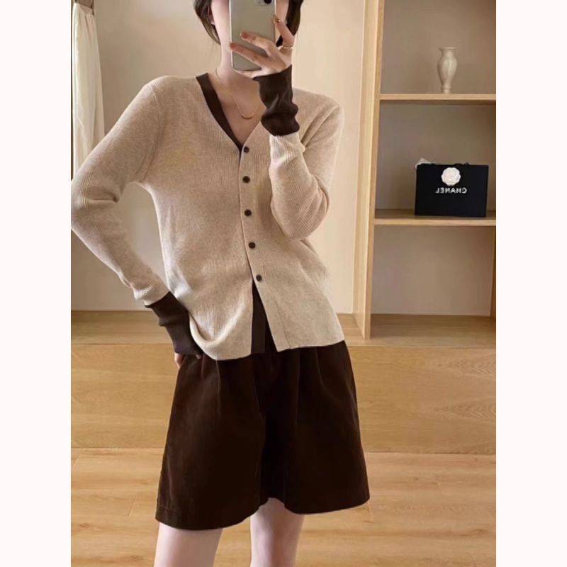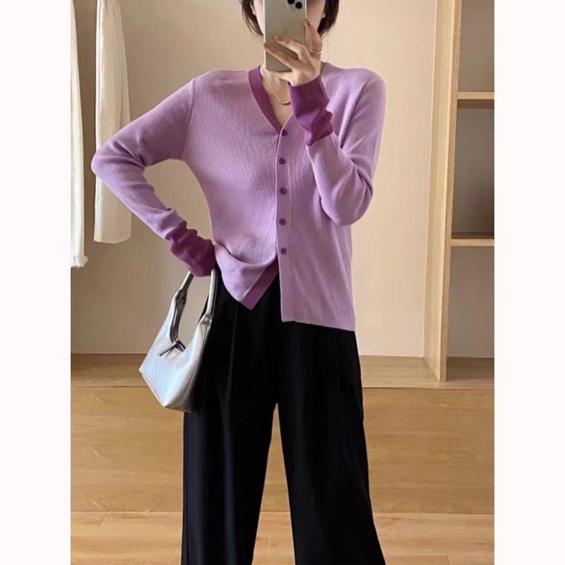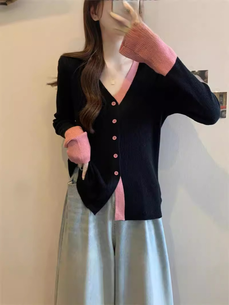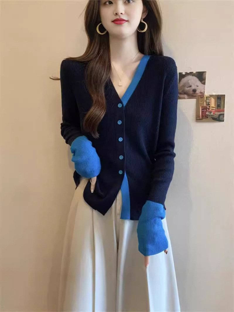 2024春秋新款时尚撞色修身显瘦单排扣针织衫长袖毛衣开衫上衣女厚