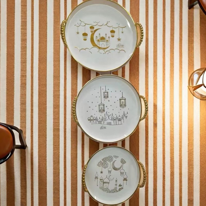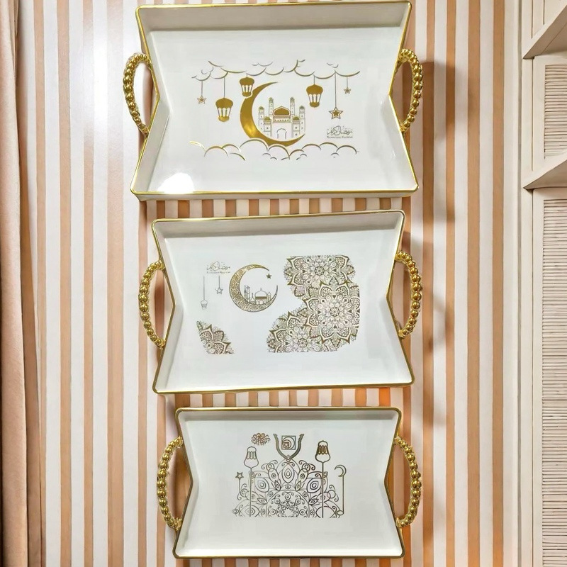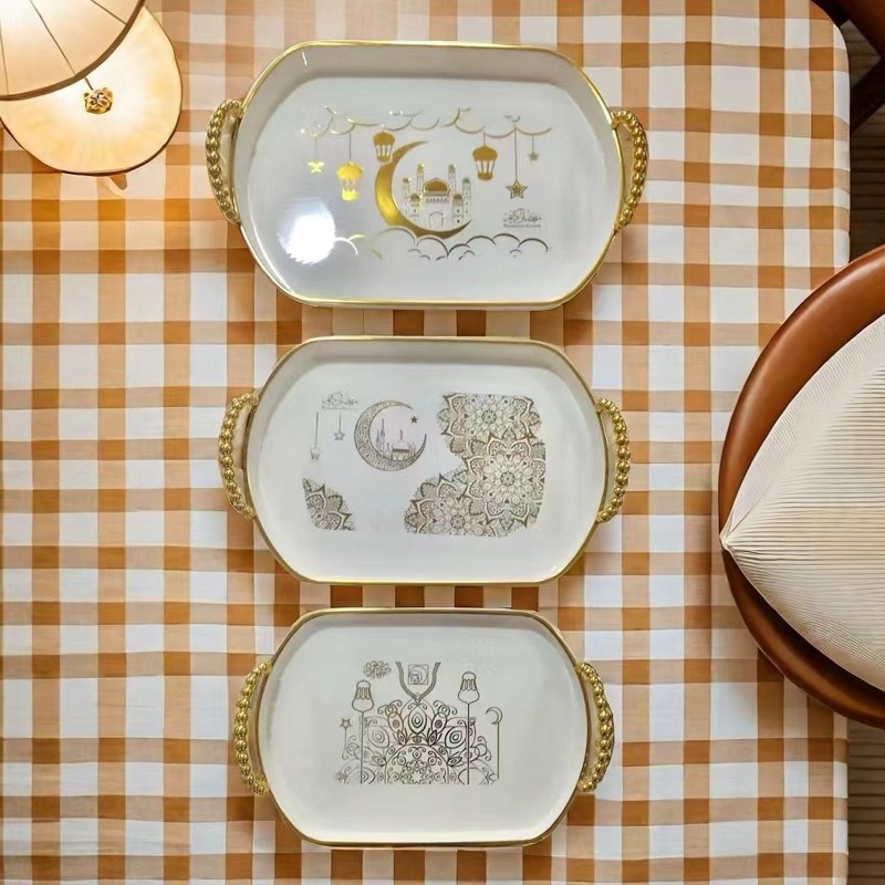 新款欧式塑料镀金家用印花长方形跨境托盘茶盘水果盘收纳盘