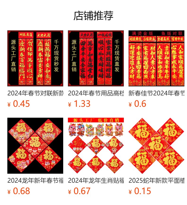 2025蛇年新款上市! 亿栗日用品厂 专业生产对联 福字门贴 生肖门贴 财神门神 立体金童玉女 平面植绒福 剪纸窗花 百样品种等年货用品 默认发中通 圆通快递 款式随机发 十个一个款式 请以10的倍数下单 同质量优惠价格 源头工厂厂家货源质量保证 买贵包退 请大家放心购买 客户的满意就是我们的追求!