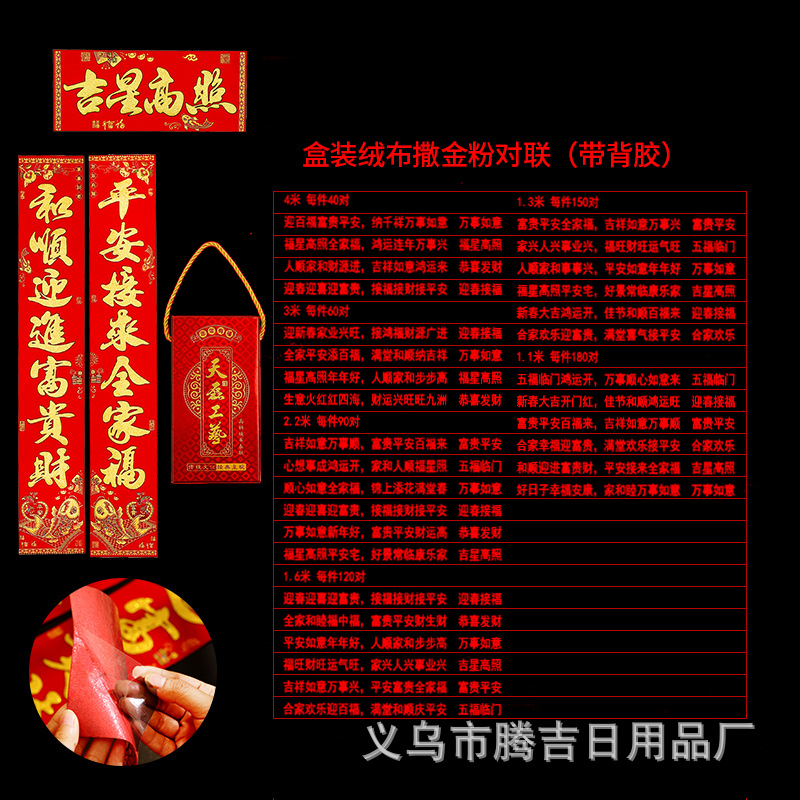 义乌市腾吉对联厂家直销,专业生产对联,一手货源,2024龙年新款春节对联,本厂家生产各种春节对联,大礼包福字,生肖,红包,门神,窗花,门贴,挂件等春节各种年货用品三公斤以下发百世汇通三公斤以上申通圆通快递 买家请注意:春联规格和实际尺寸是不一样的哦,具体尺寸联系客服了解或者看产品详情里面的注明。