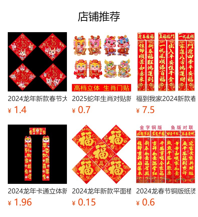 2025蛇年新款上市! 亿栗日用品厂 专业生产对联 福字门贴 生肖门贴 财神门神 立体金童玉女 平面植绒福 剪纸窗花 百样品种等年货用品 默认发中通 圆通快递 款式随机发 十个一个款式 请以10的倍数下单 同质量优惠价格 源头工厂厂家货源质量保证 买贵包退 请大家放心购买 客户的满意就是我们的追求!