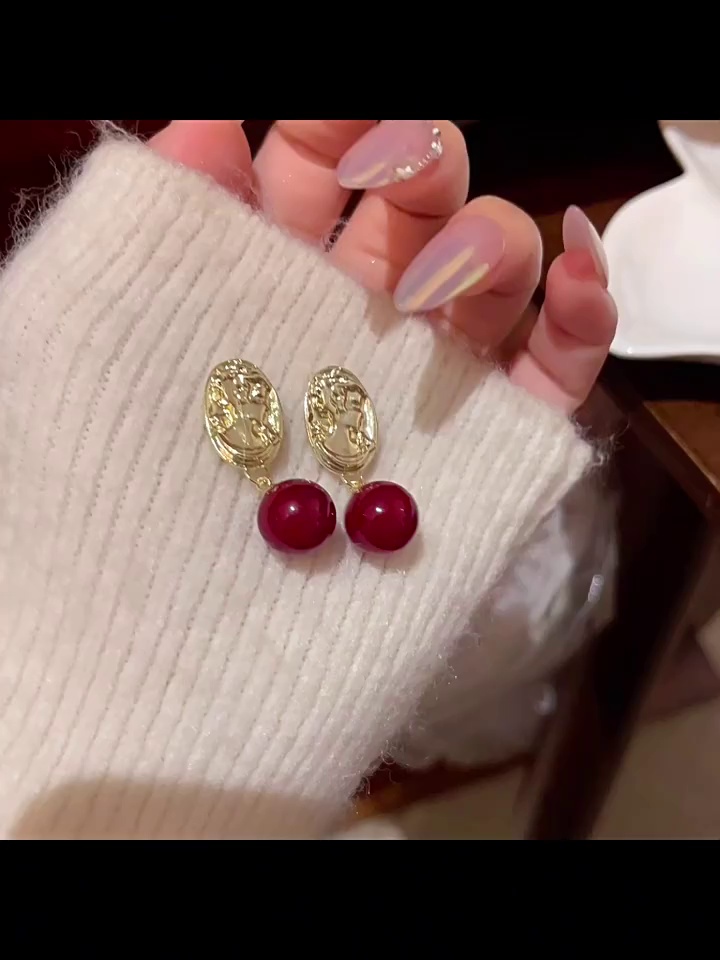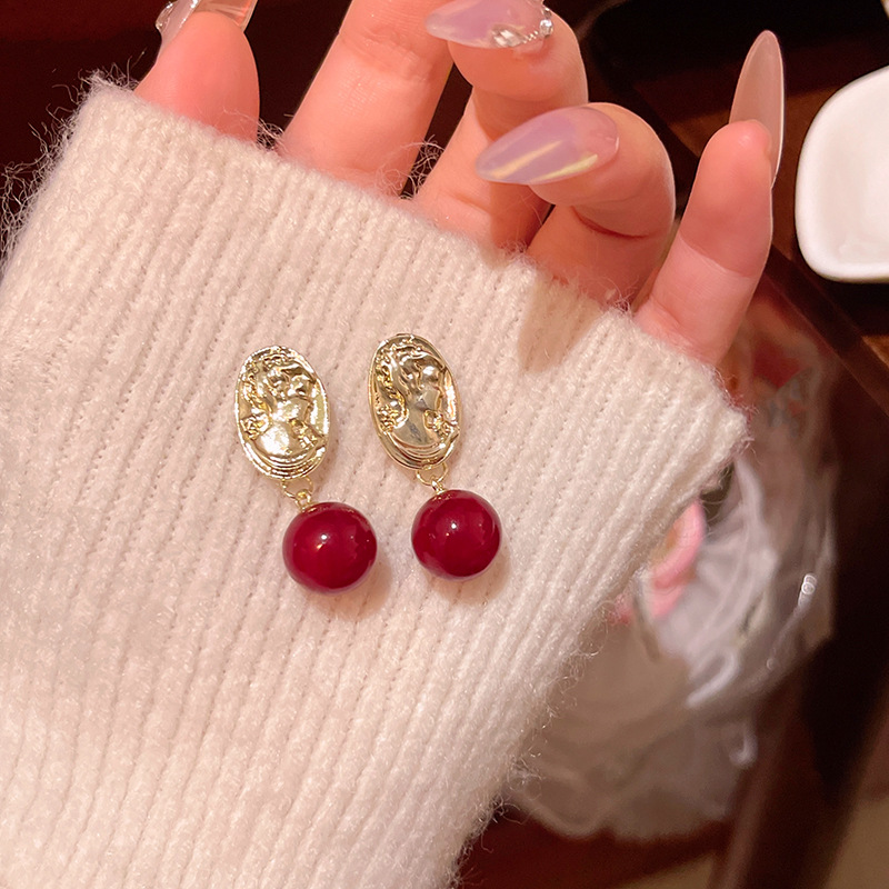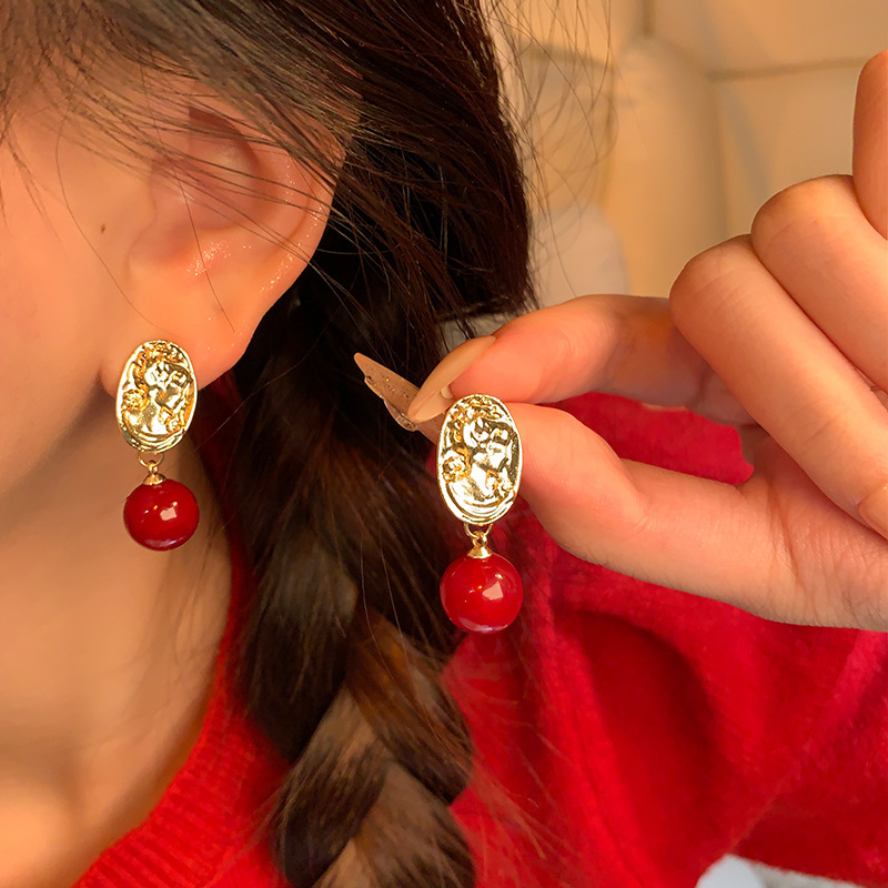 饰品小众简约复古人头像耳钉耳饰品中古风喜庆安可拉红吊坠耳环女