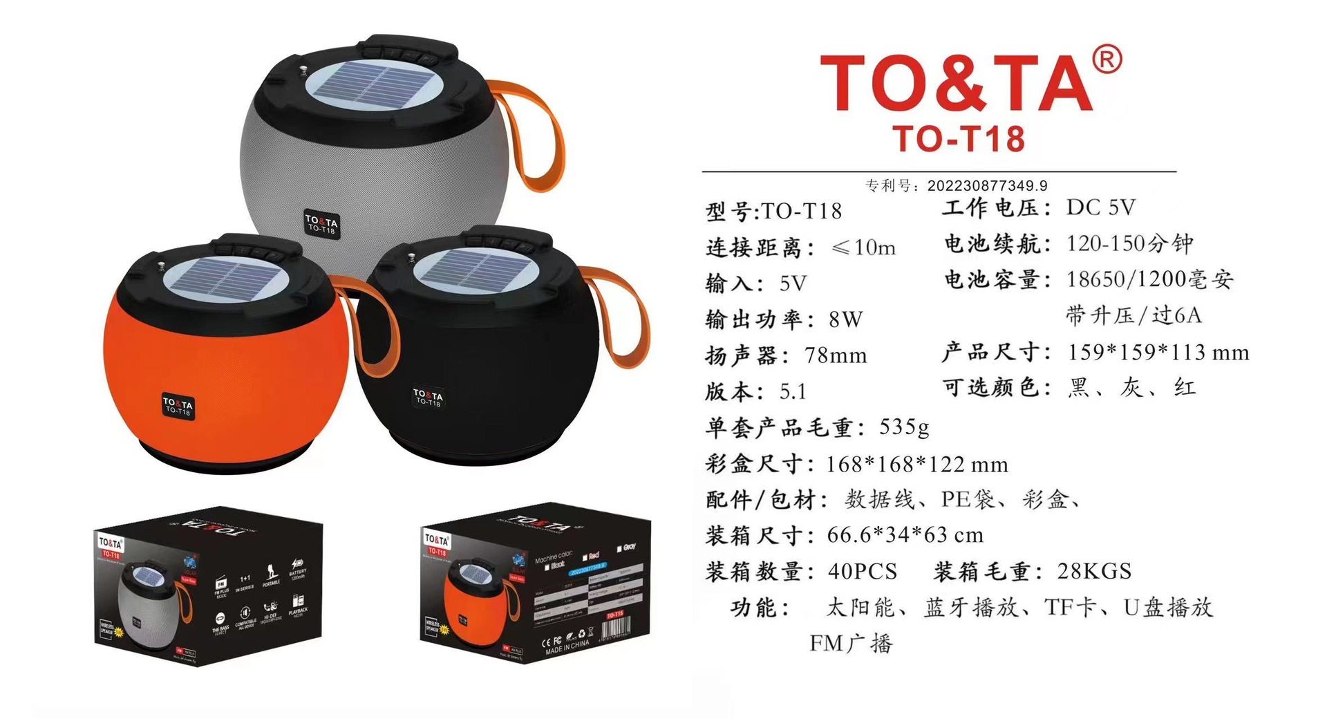 TO-T18 太阳能无线蓝牙音箱户外便携手提TWS串联创意礼品低音炮