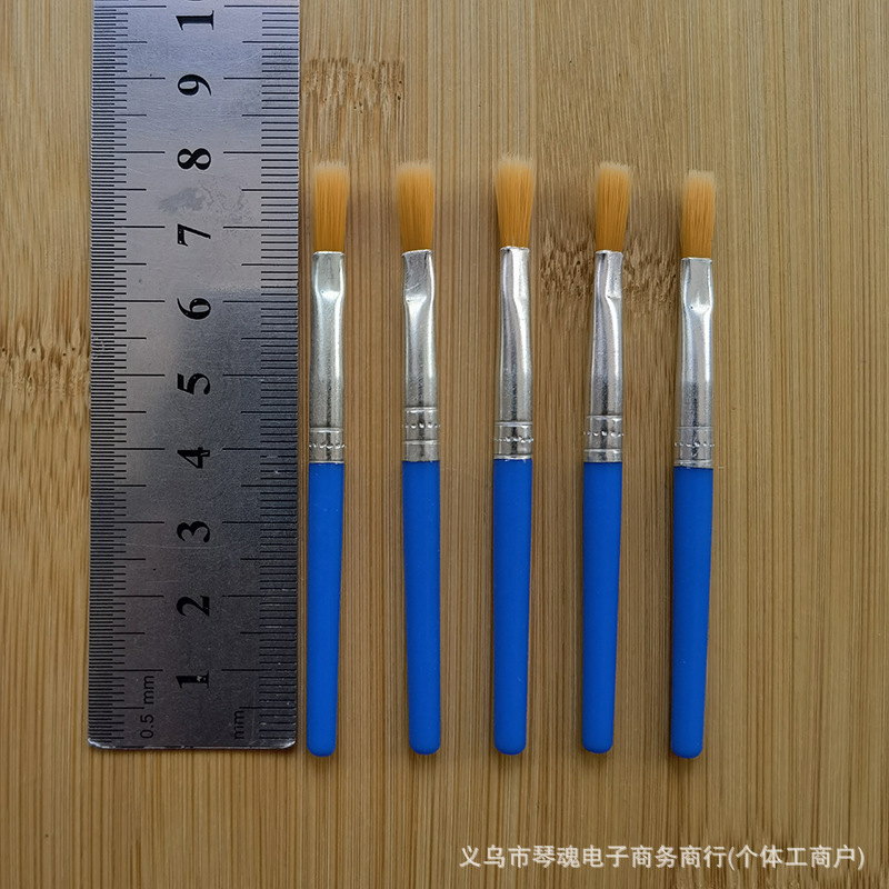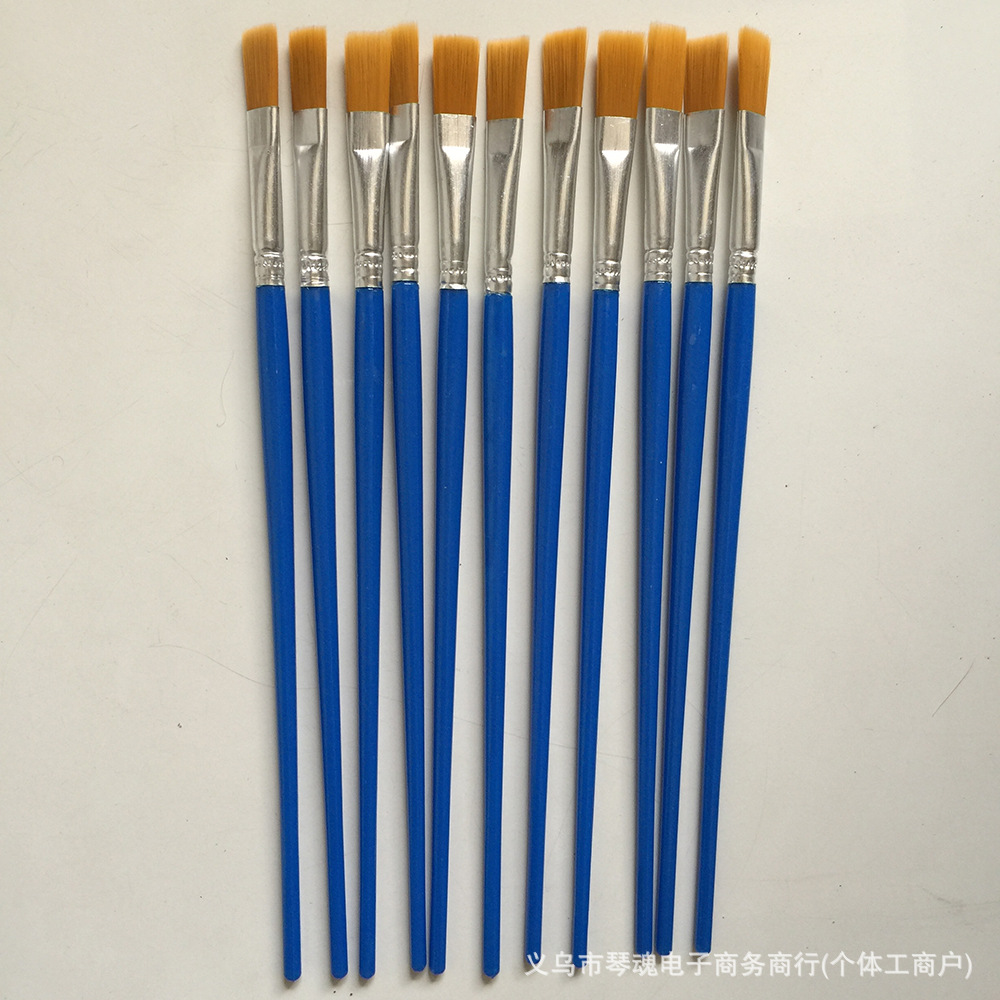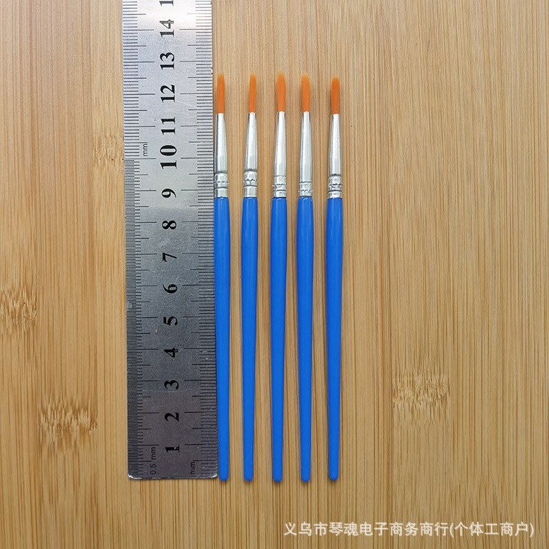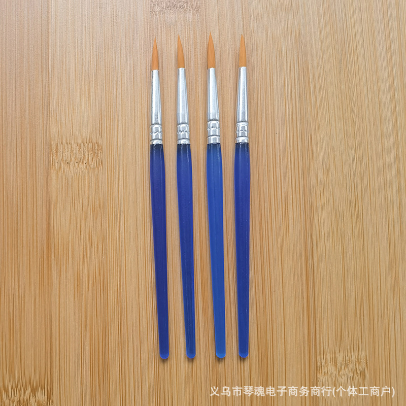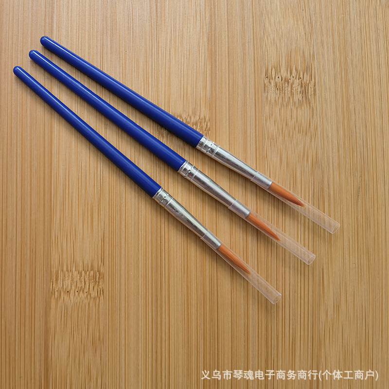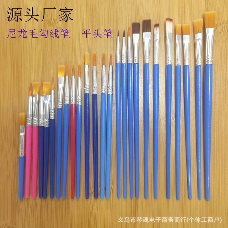 笔头采用优质尼龙毛手工制作,笔杆是PS透苯塑料杆,也有木杆的。这些款笔为DIY涂色画笔,可用作搪胶娃娃及石膏陶瓷、面具白呸及油画描线条及数字油画彩绘上色使用。笔头形状有尖头、平头和斜头;塑料杆的颜色一般蓝色的,也可定做其它颜色。做木杆的话,笔杆的颜色可做原木色,也可按客户要求做成珠光蓝、黑色、白色或红色等。