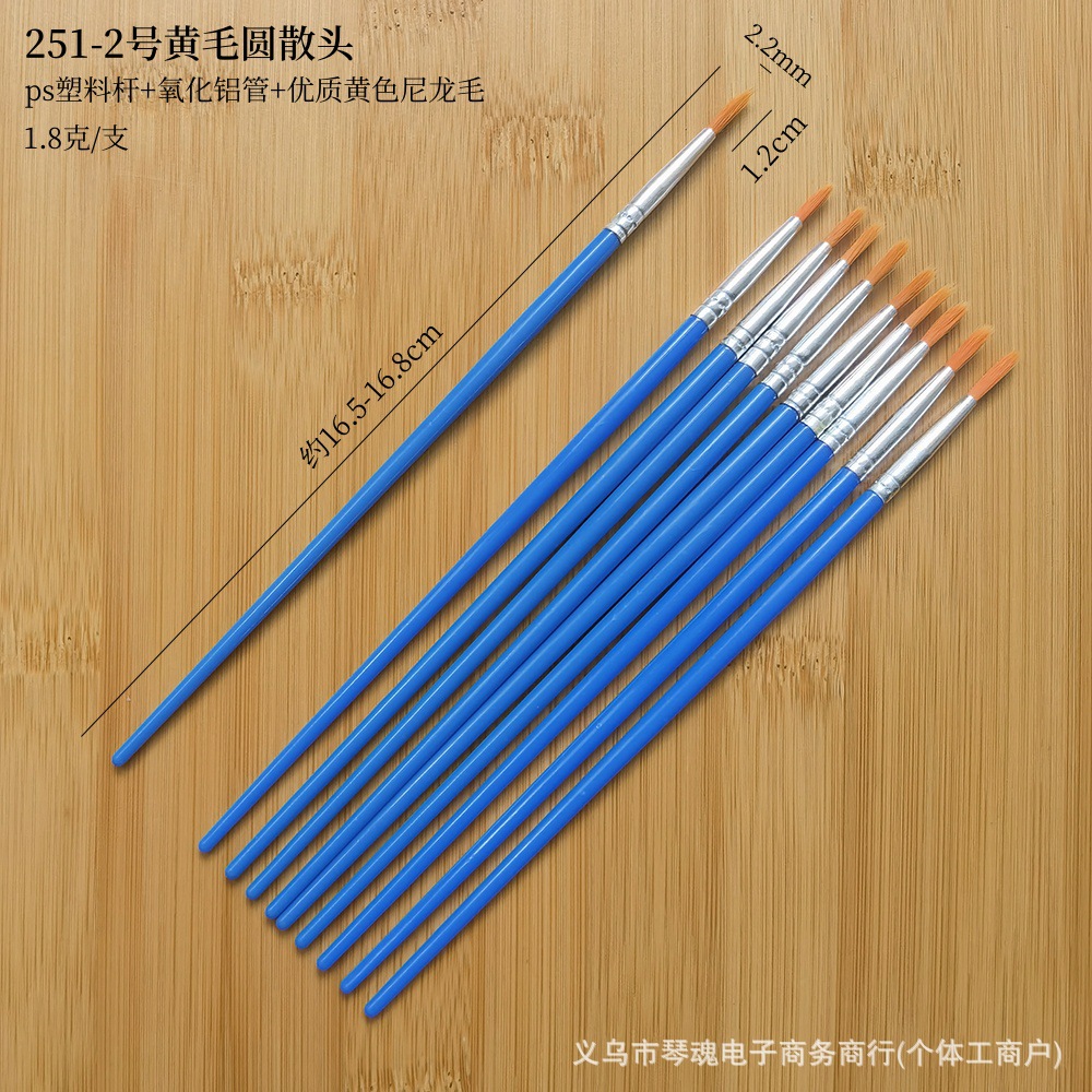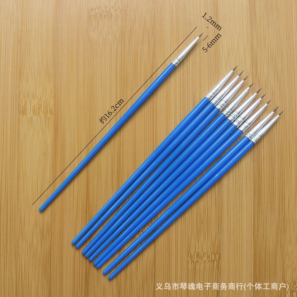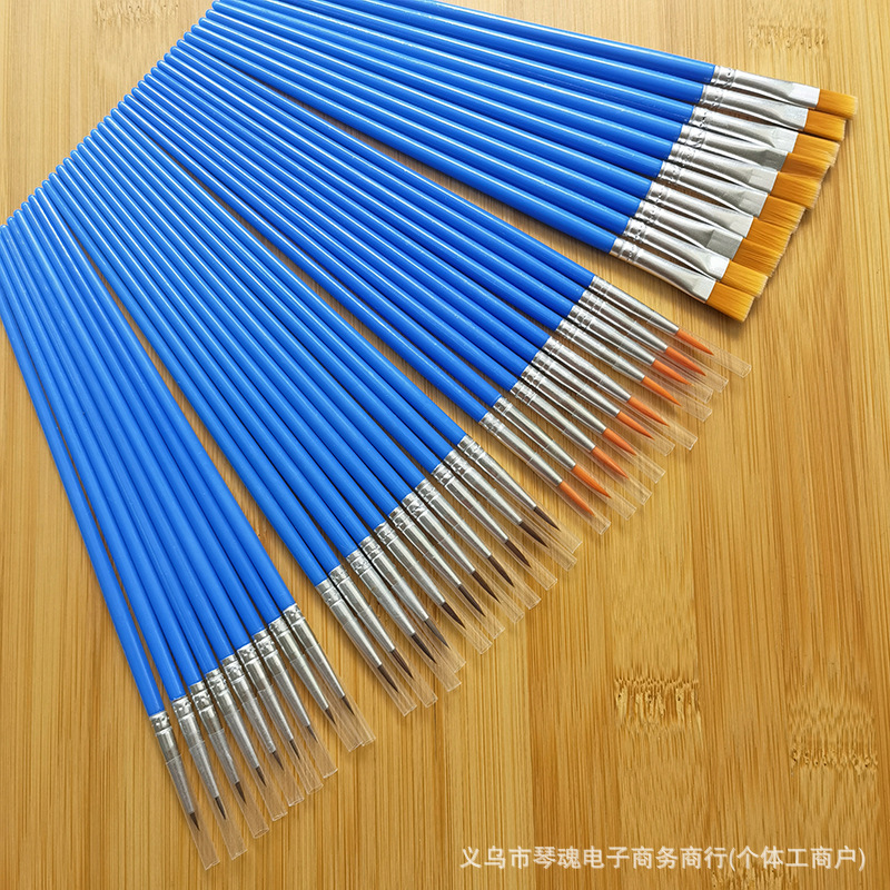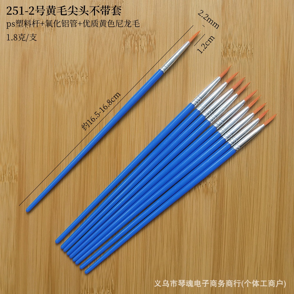 笔头采用优质尼龙毛手工制作,笔杆是PS透苯塑料杆,也有木杆的。这些款笔为DIY涂色画笔,可用作搪胶娃娃及石膏陶瓷、面具白呸及油画描线条及数字油画彩绘上色使用。笔头形状有尖头、平头和斜头;塑料杆的颜色一般蓝色的,也可定做其它颜色。做木杆的话,笔杆的颜色可做原木色,也可按客户要求做成珠光蓝、黑色、白色或红色等。
