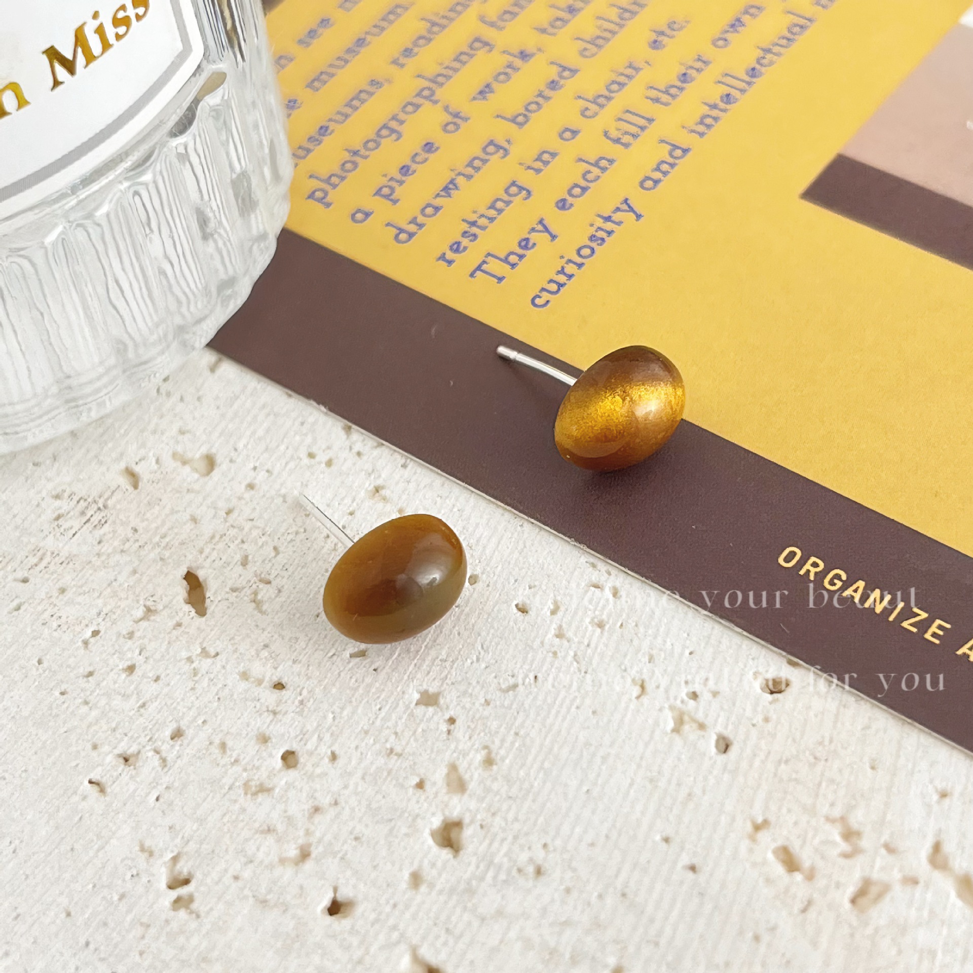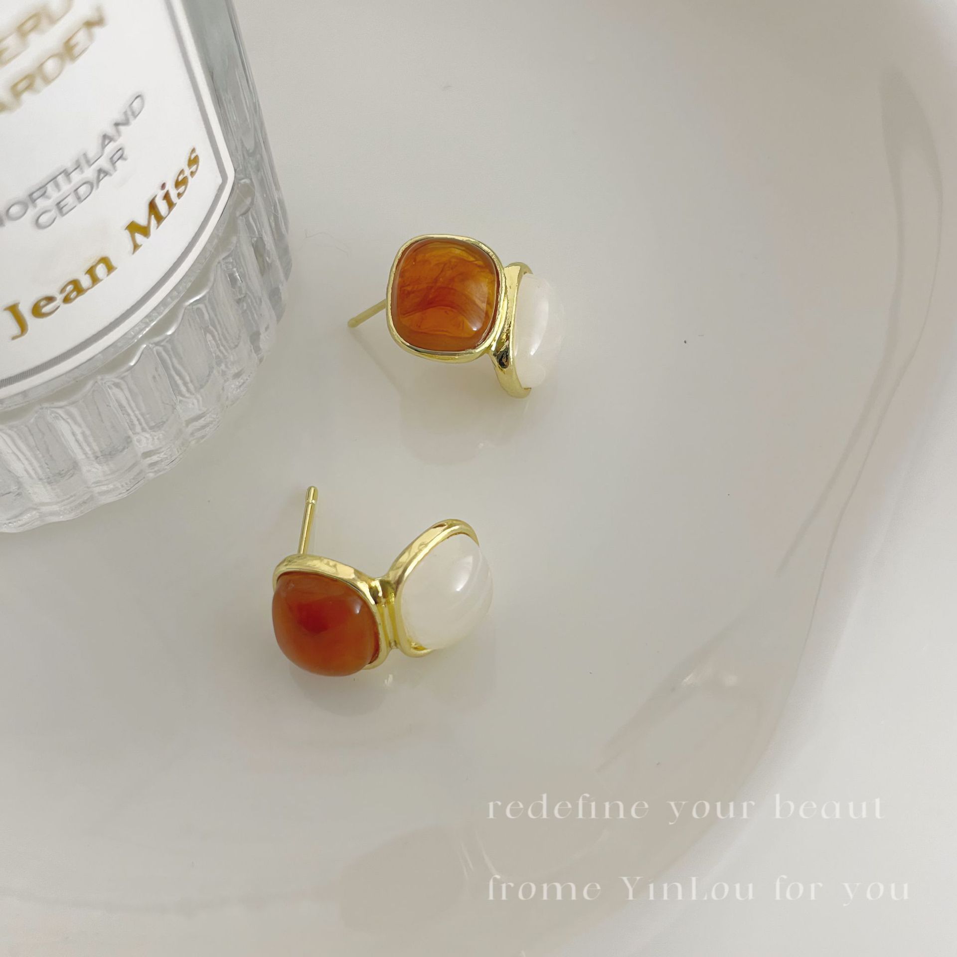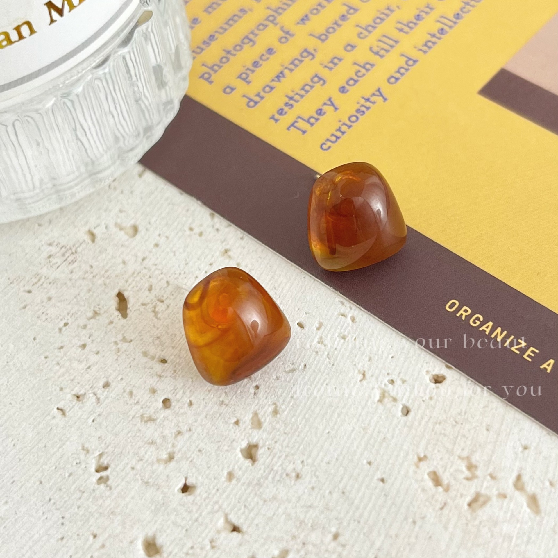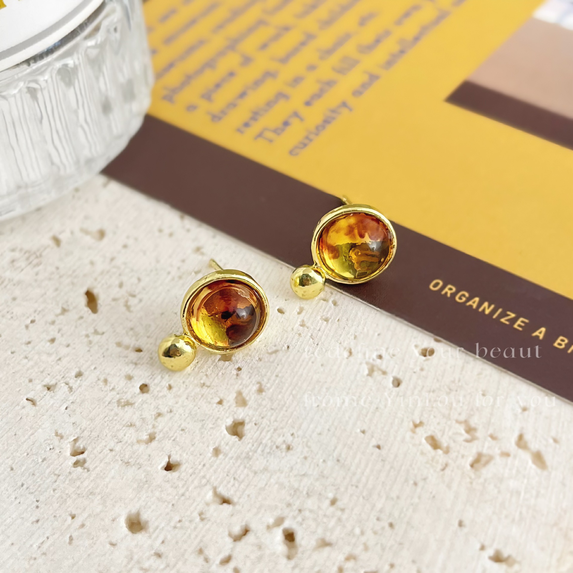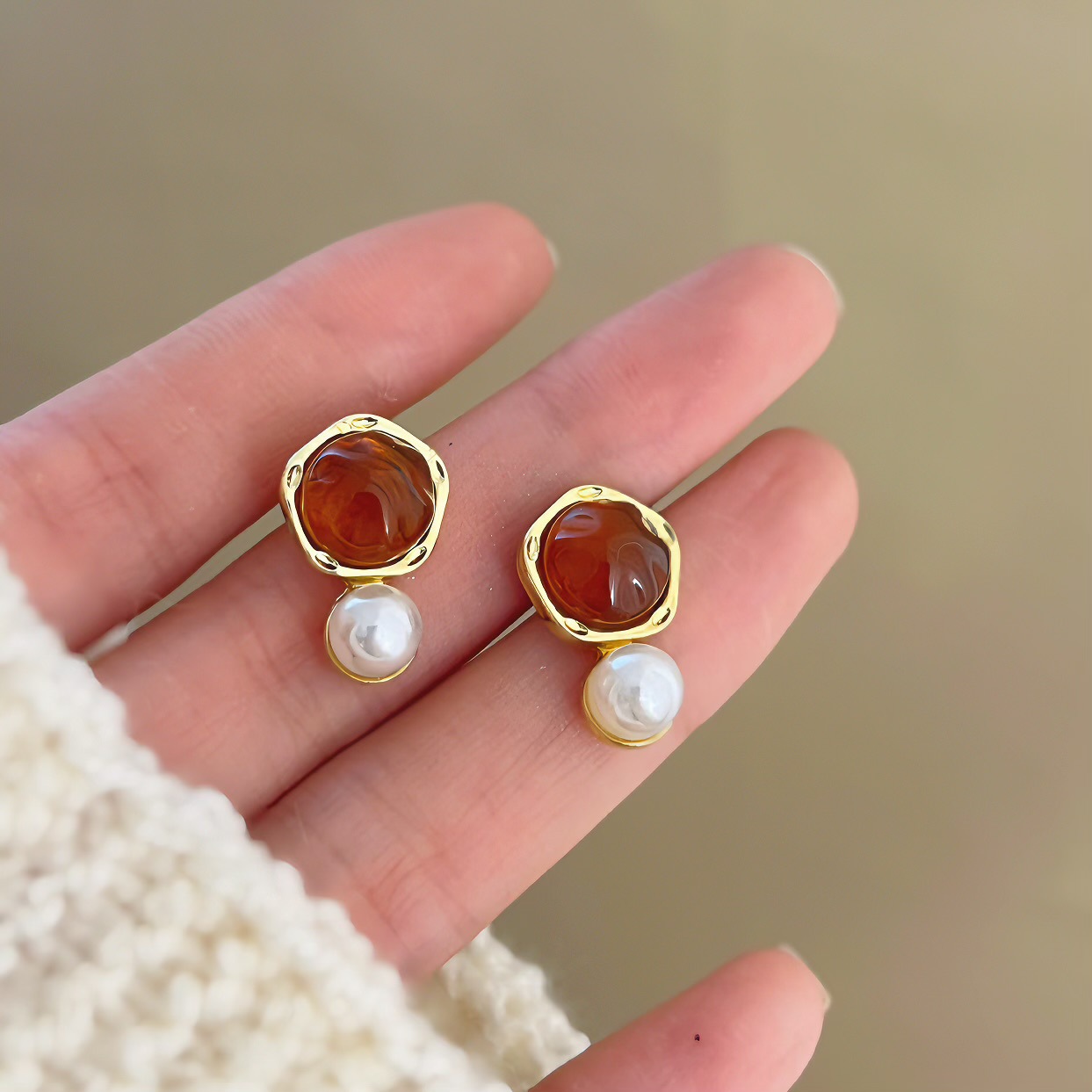 美拉德风925针耳钉女秋冬气质复古琥珀色珍珠小众高级感耳环耳饰