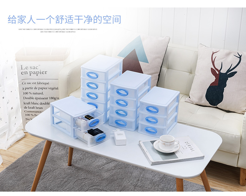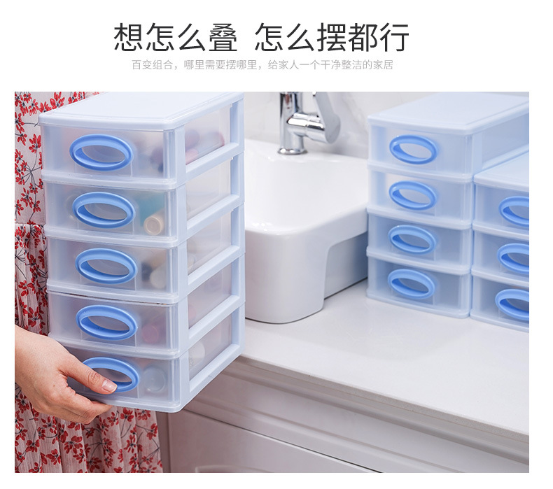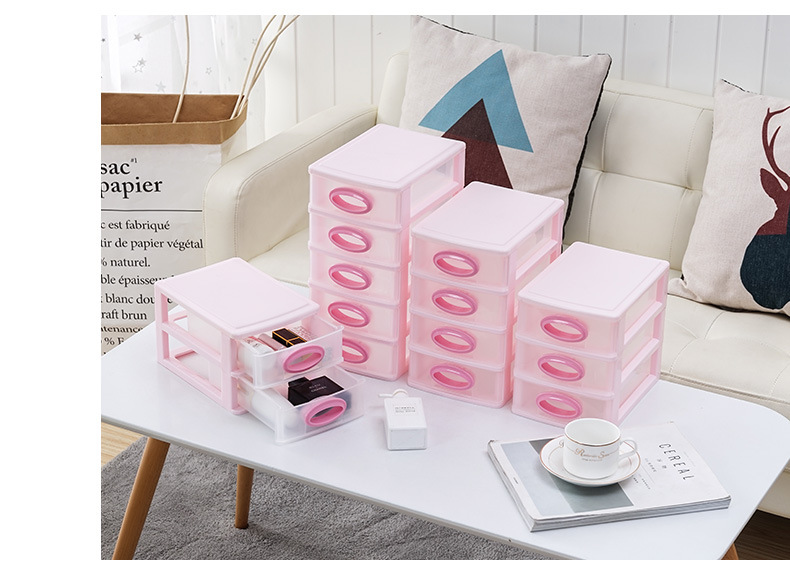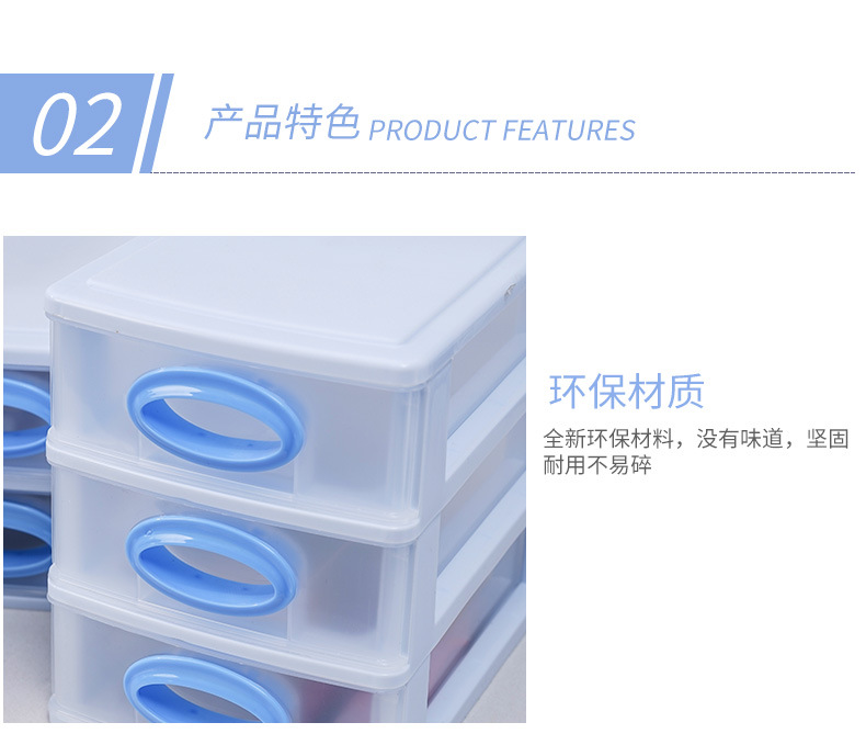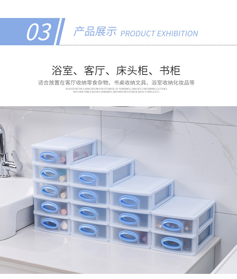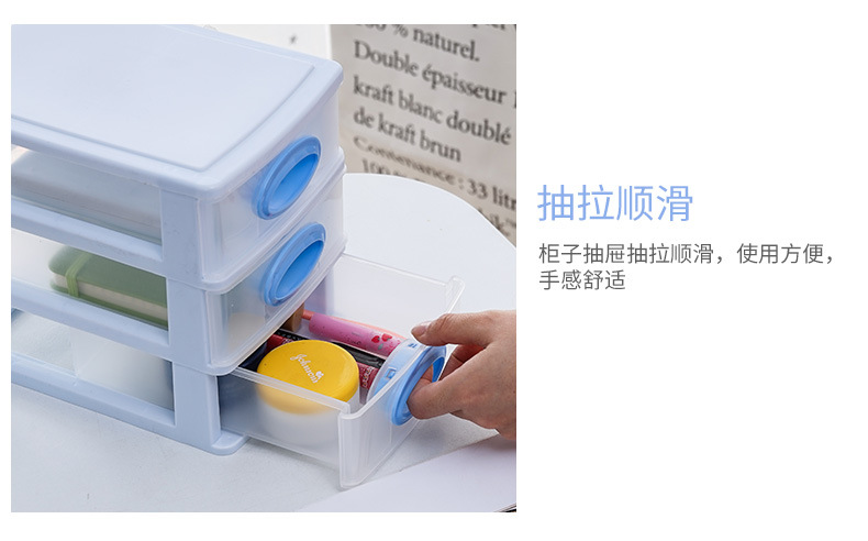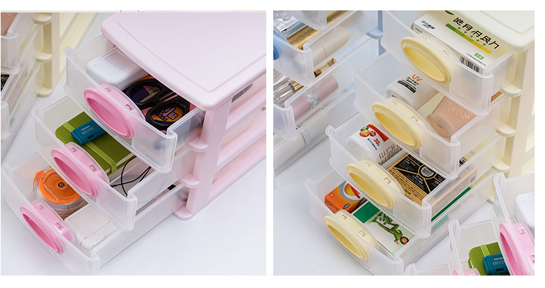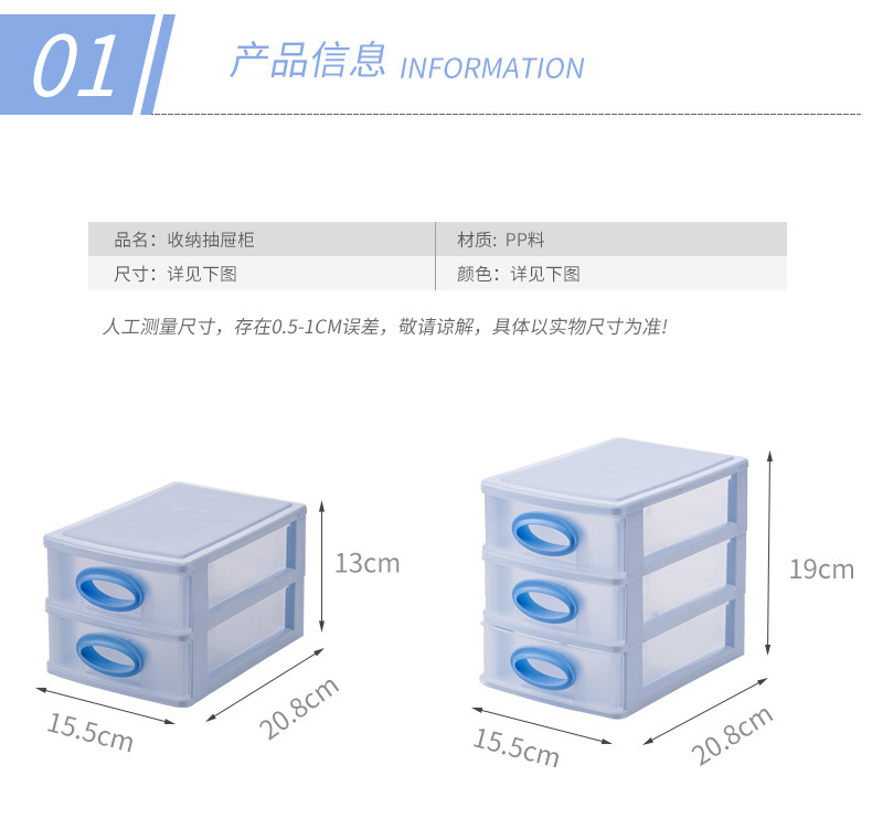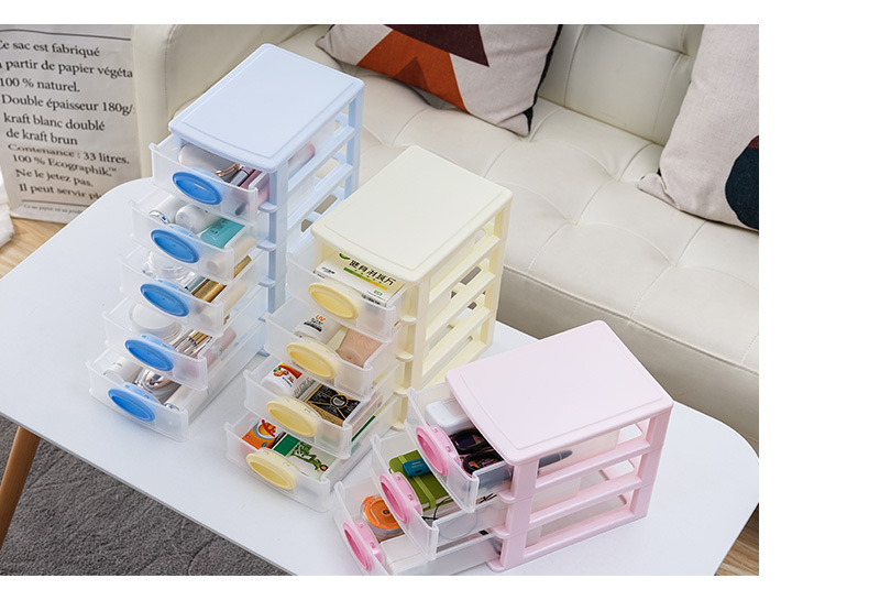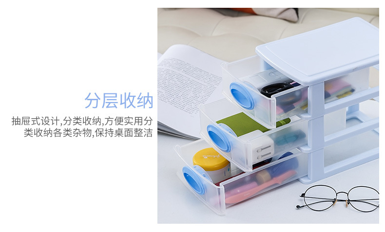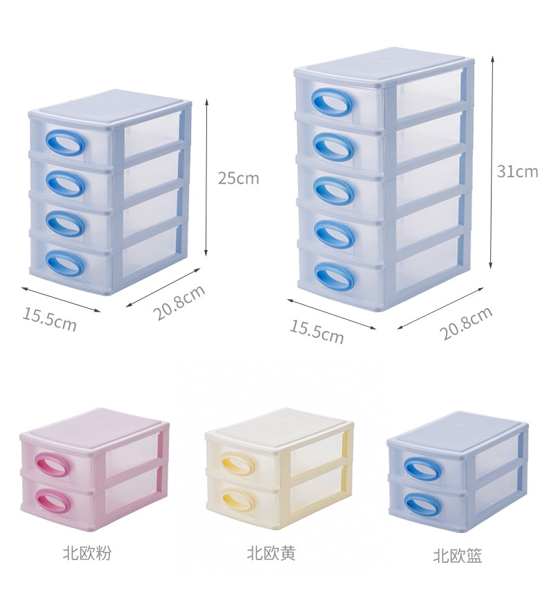 桌面三层收纳柜:产品寸 21.5*15.5*19cm 产品可贴牌,可挑色 单个opp袋装 装箱数89*49*59cm/36pcs 说明:产品使用全新pp颗粒,无气味。做工精细,产品无油渍,无飞边,抽屉不变形,抽拉流畅。产品可放置女士化妆品,办公桌上的一些小物件。