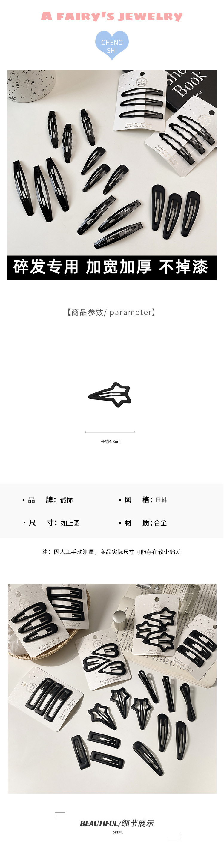黑色简约bb夹侧边碎发刘海夹子一字夹碎发整理神器发夹女发卡头饰