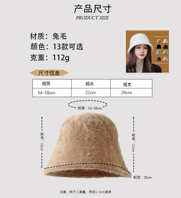 韩国网红兔毛冬季时尚水桶暖帽保暖显脸小秋冬女帽子高颜值渔夫帽