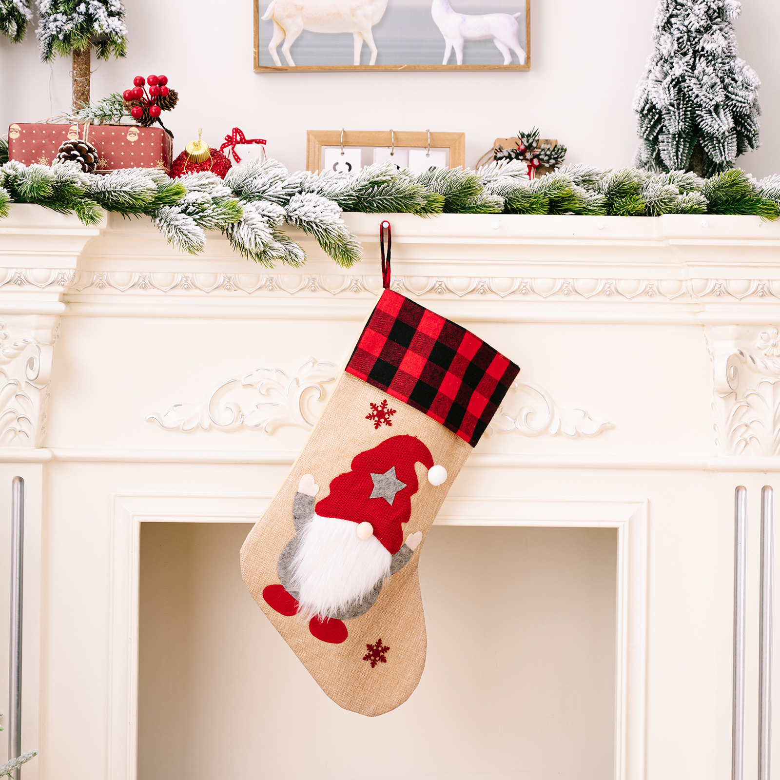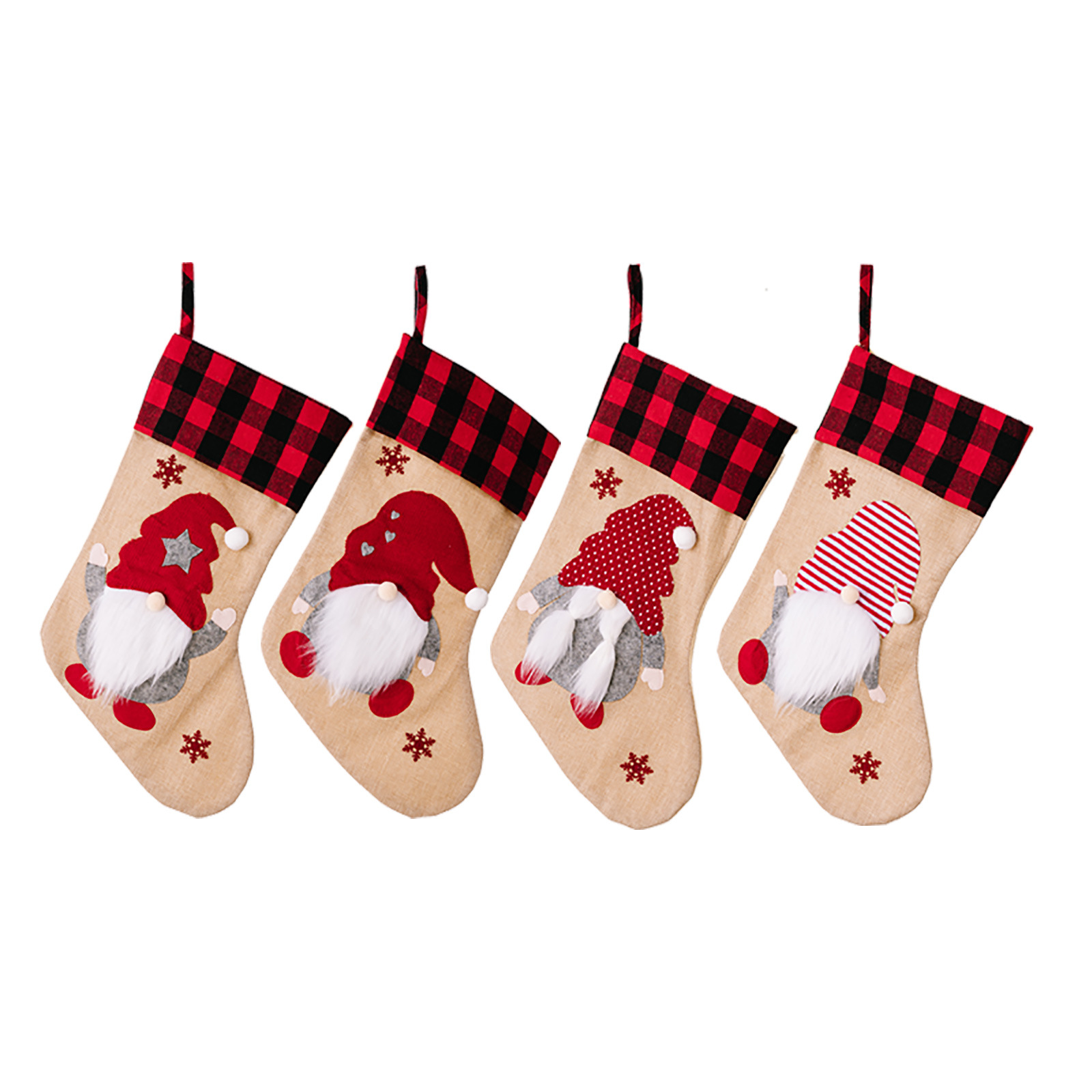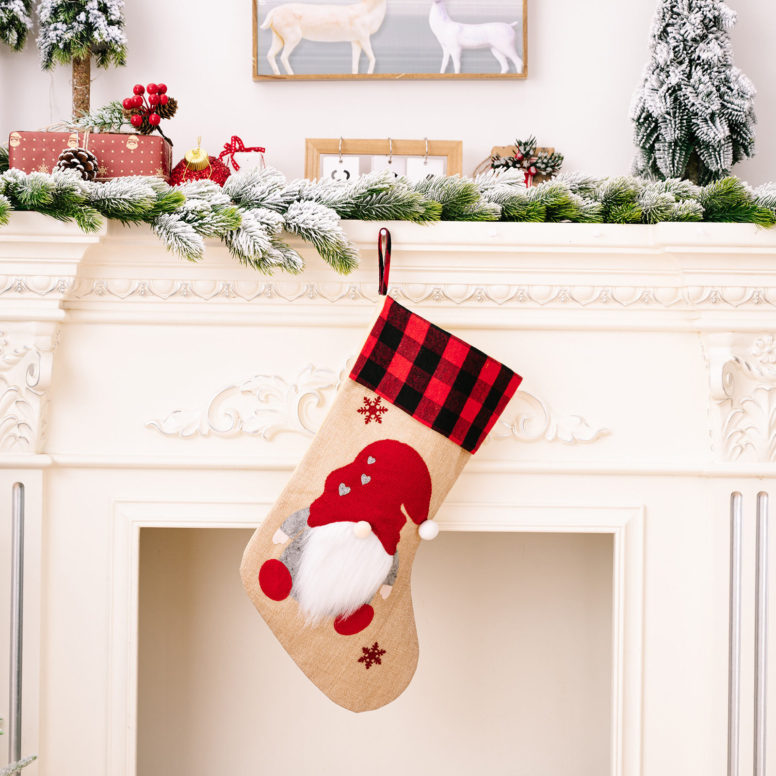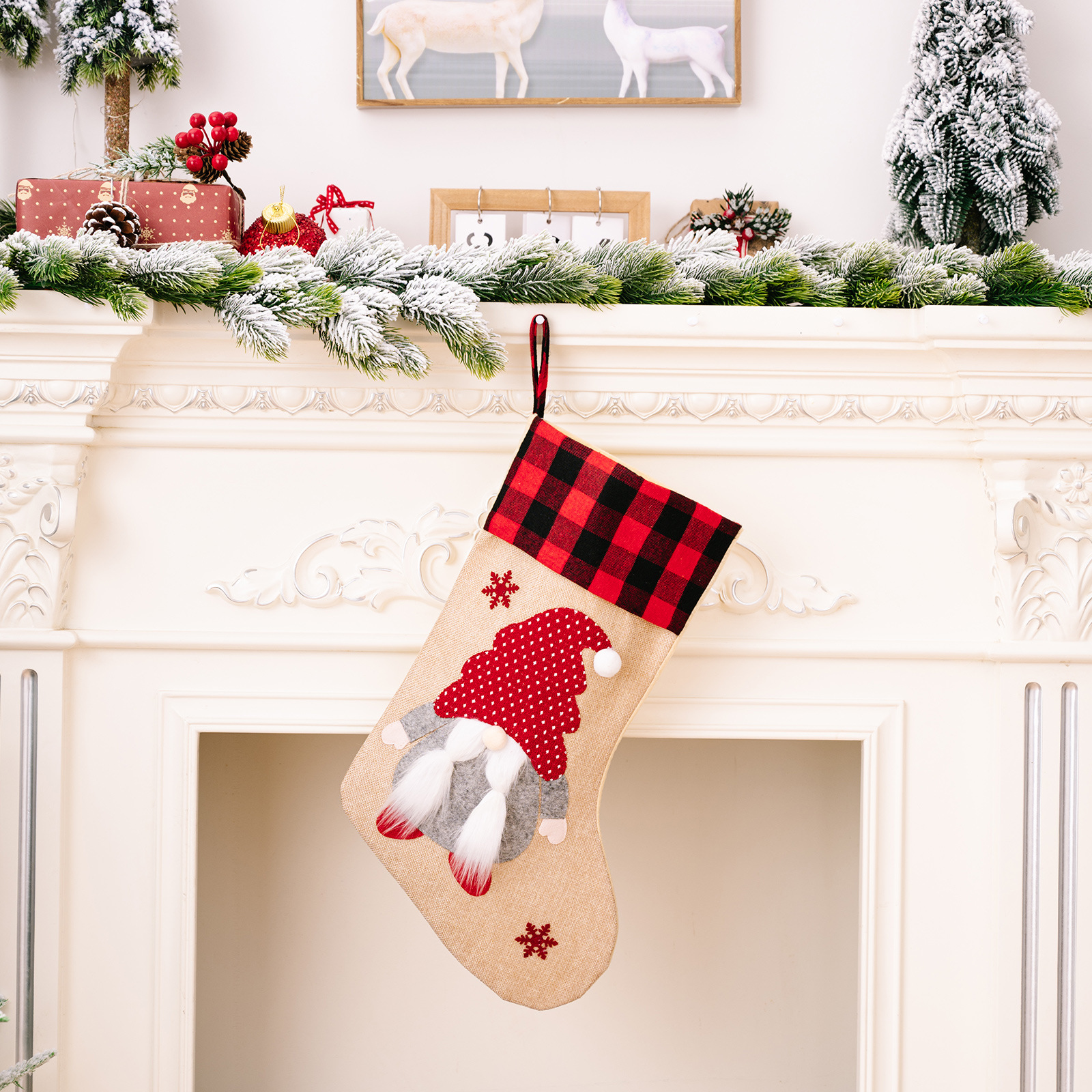 跨境新款圣诞节装饰品红黑格子边森林老人圣诞袜麻布贴布绣礼物袋