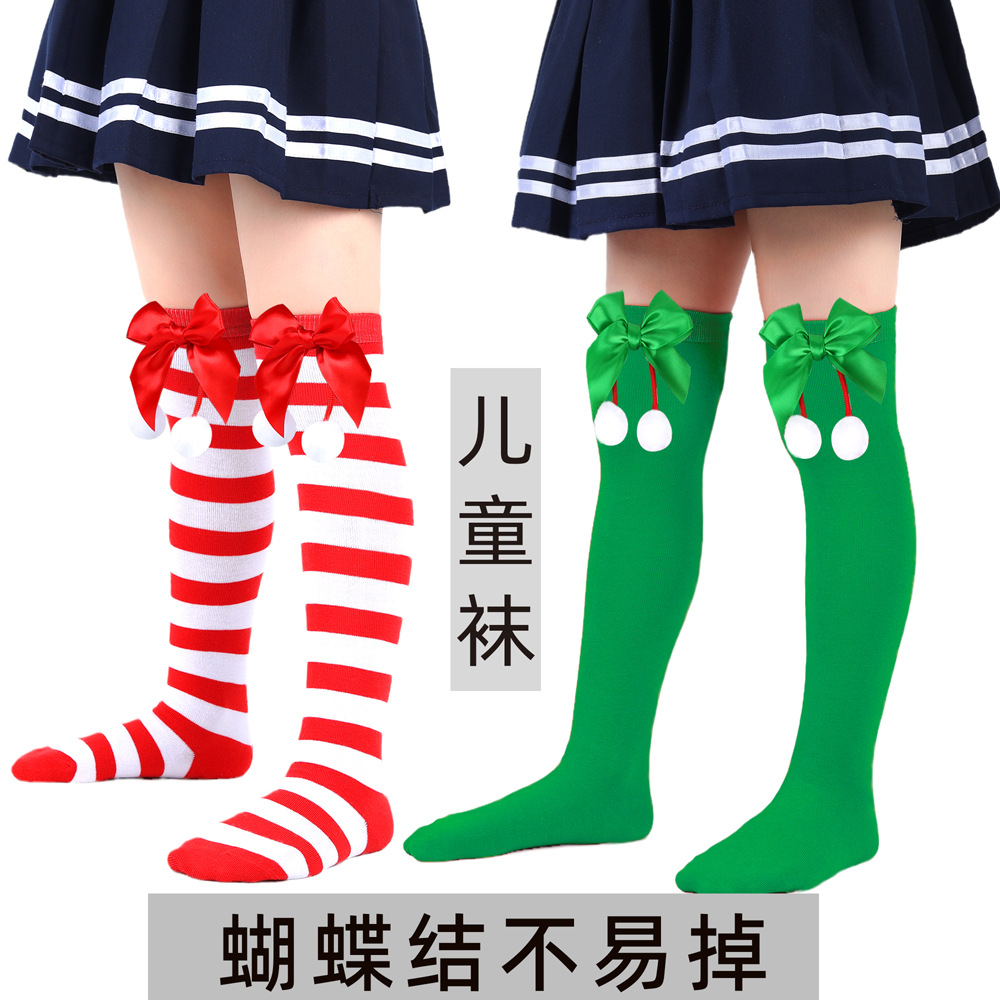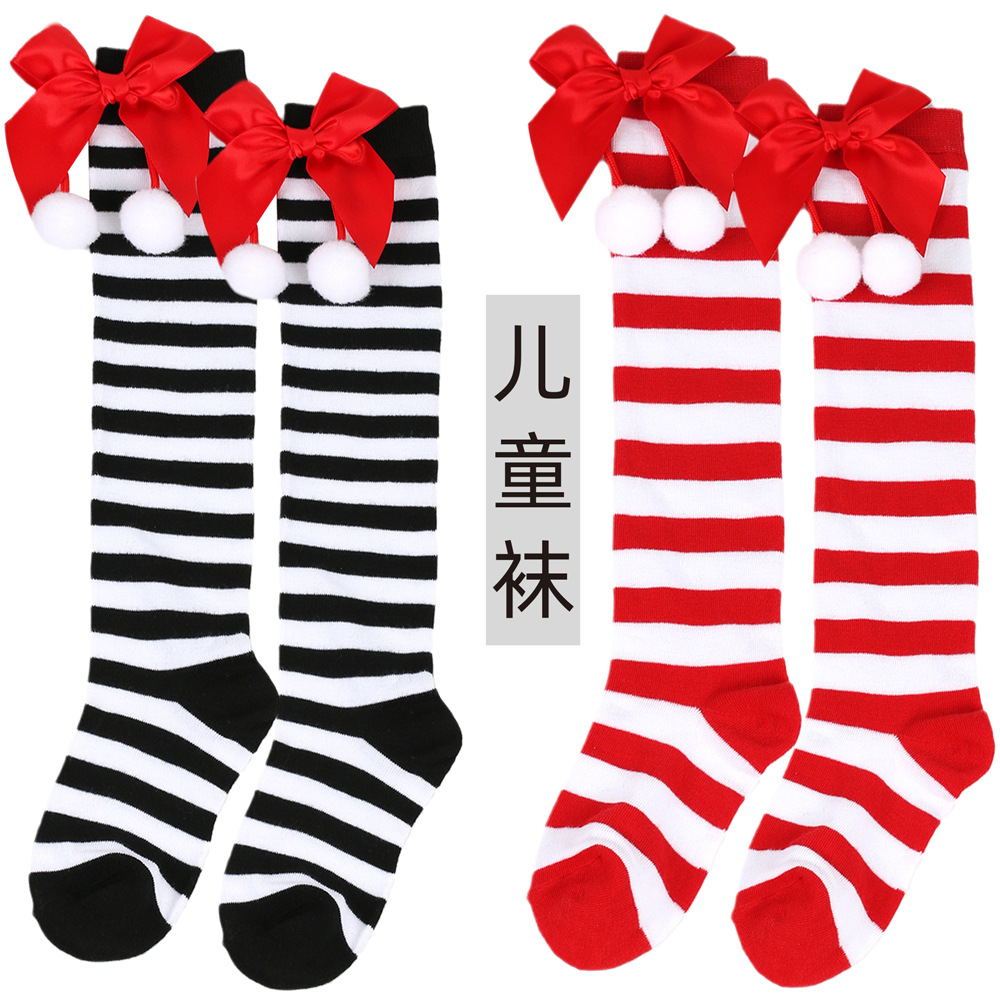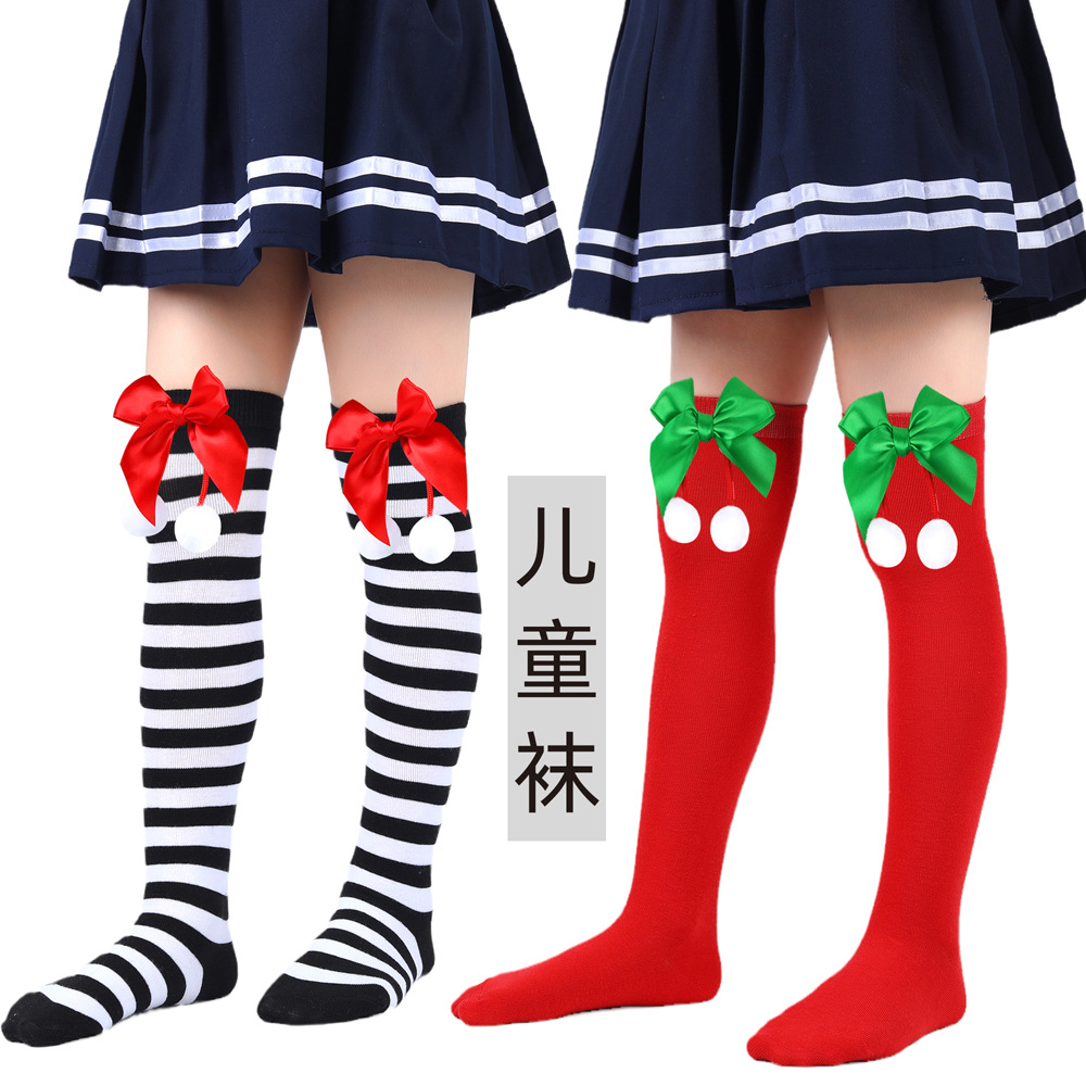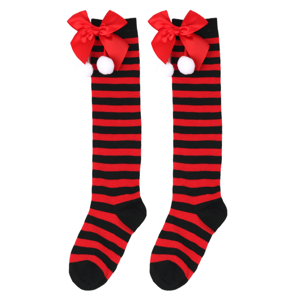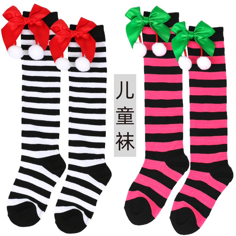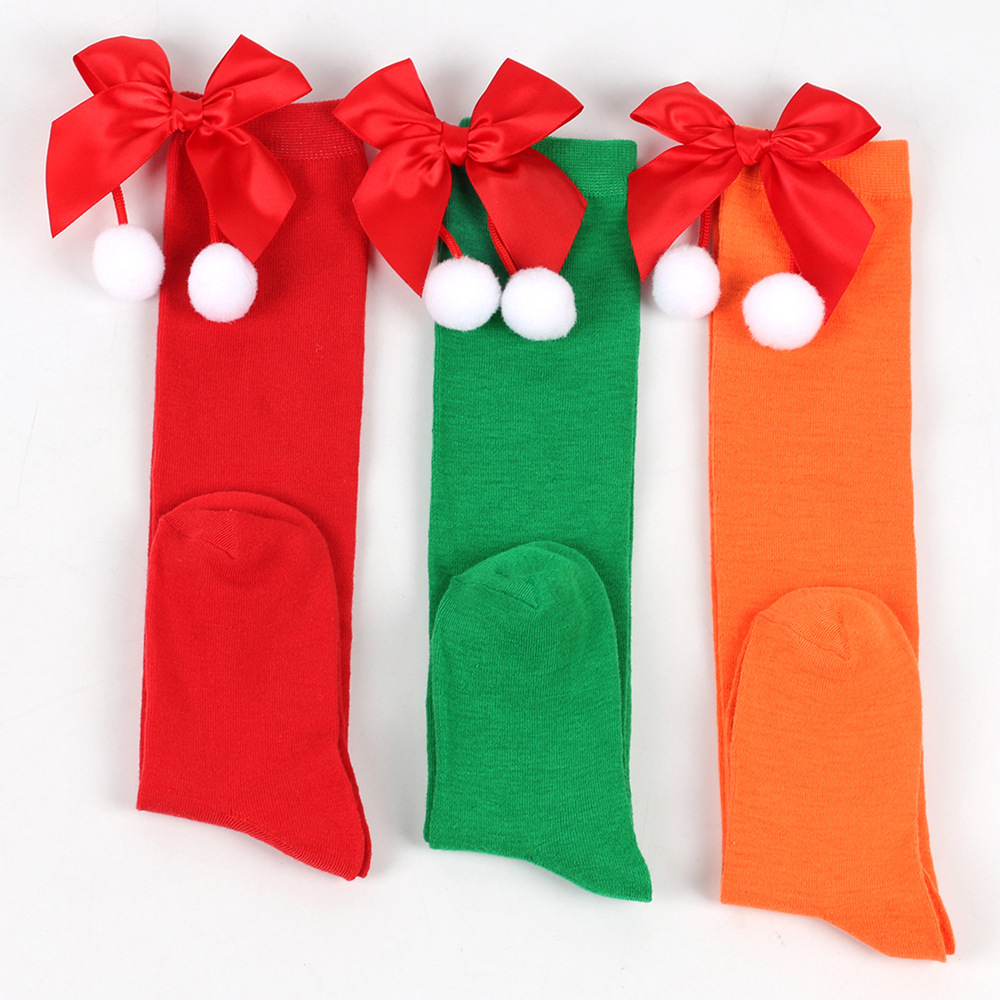跨境儿童圣诞袜秋冬新款女童长筒袜欧美可爱蝴蝶结毛球圣诞节袜子