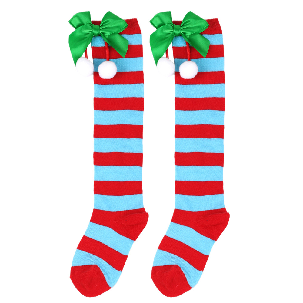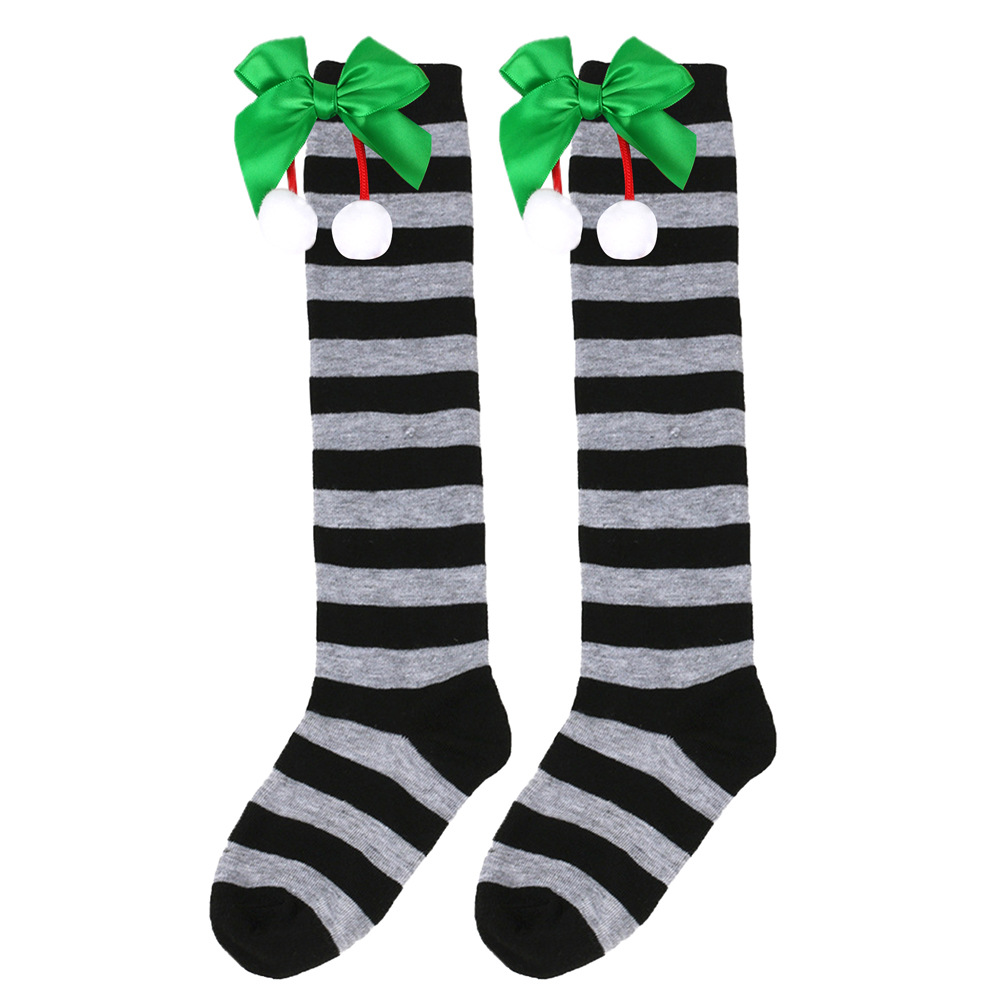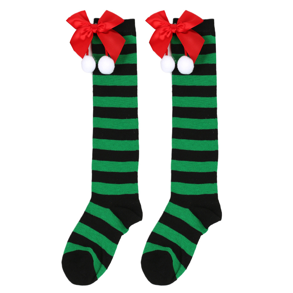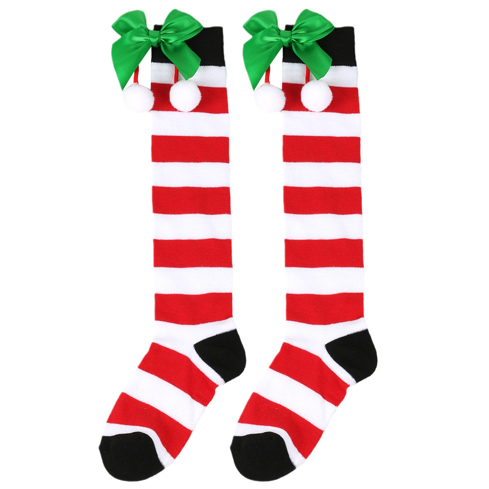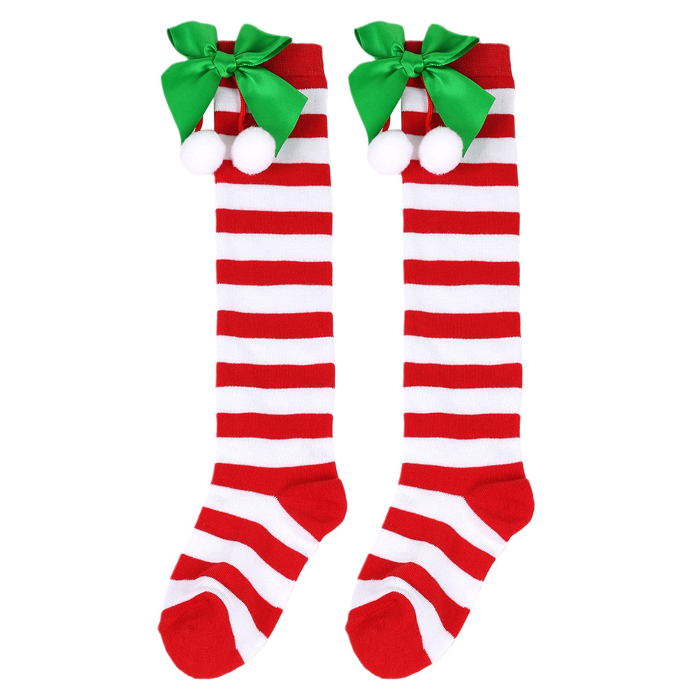 跨境儿童圣诞袜秋冬新款女童长筒袜欧美可爱蝴蝶结毛球圣诞节袜子