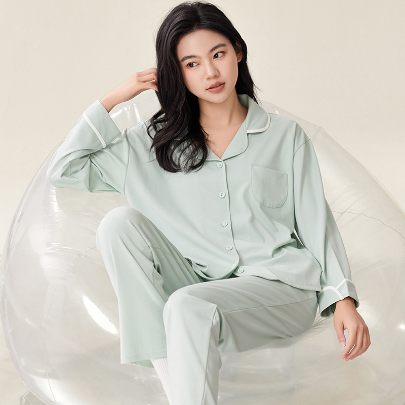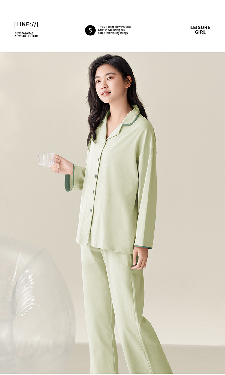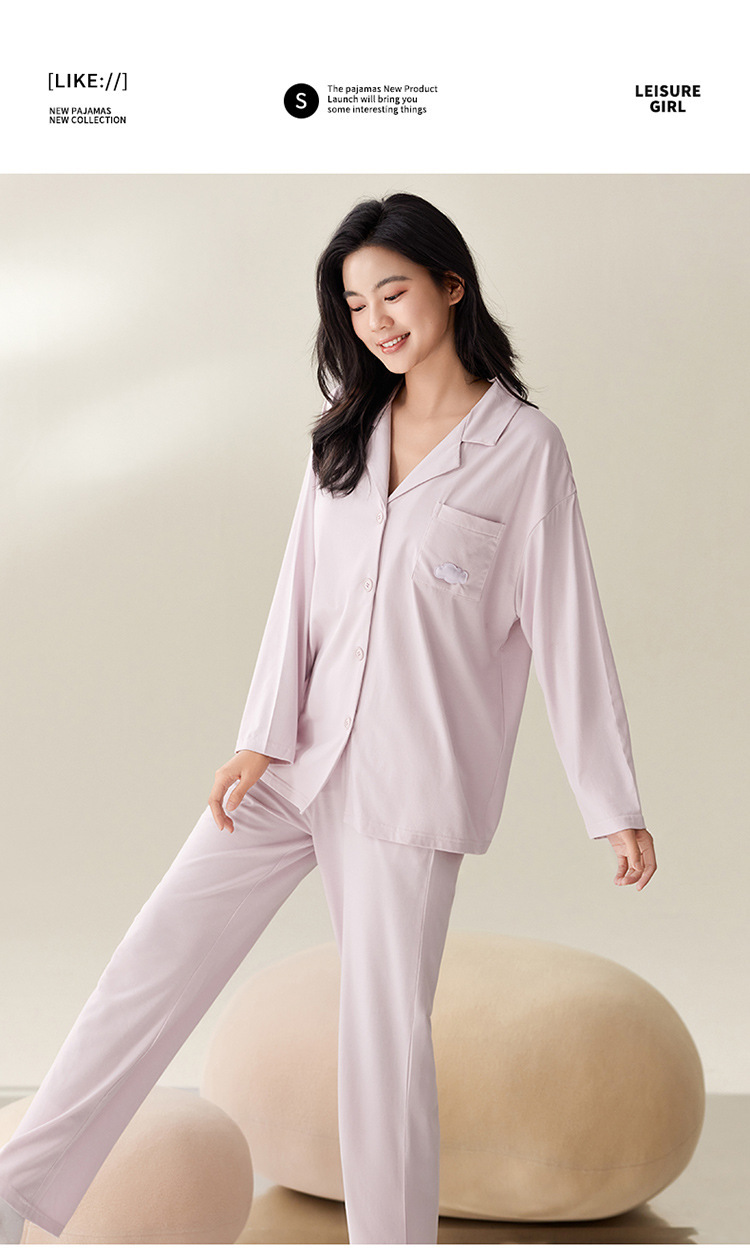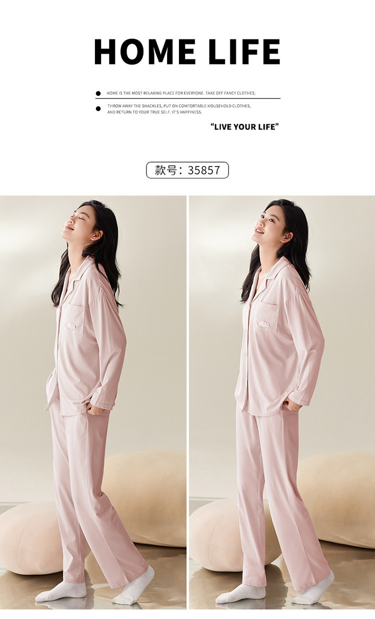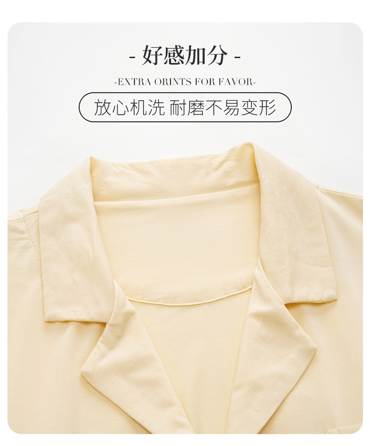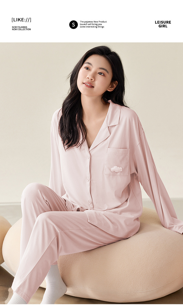 春秋季莫代尔睡衣女秋长袖开衫翻领宽松薄款女士家居服套装无印春