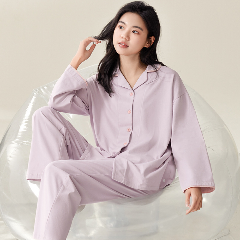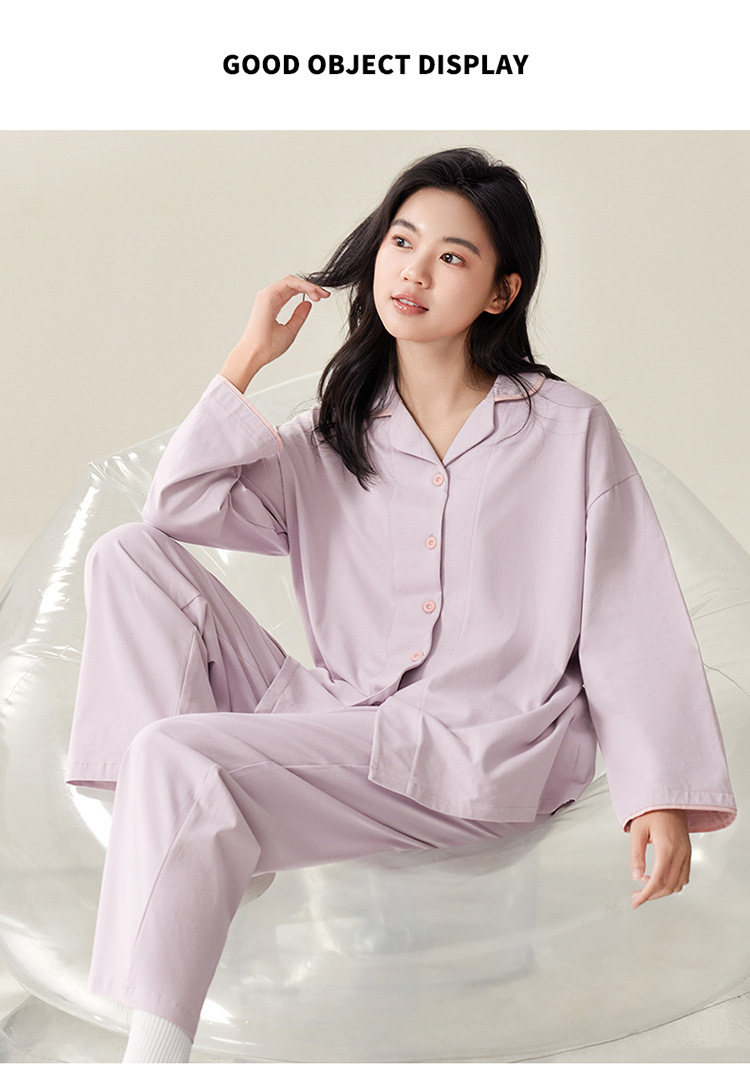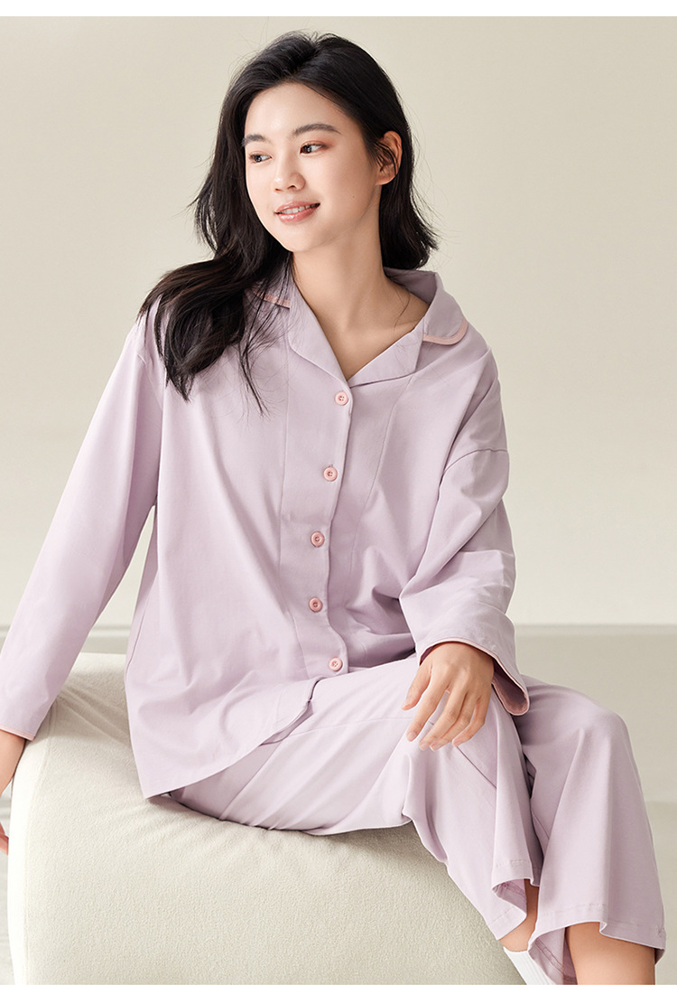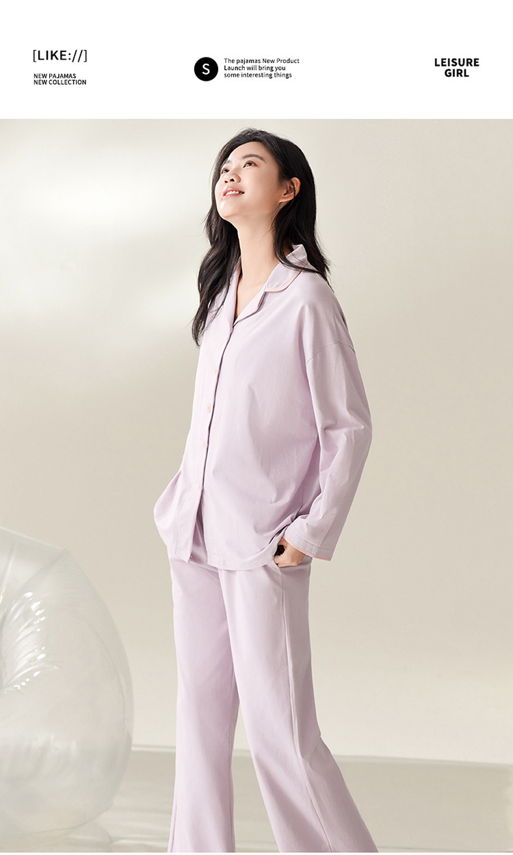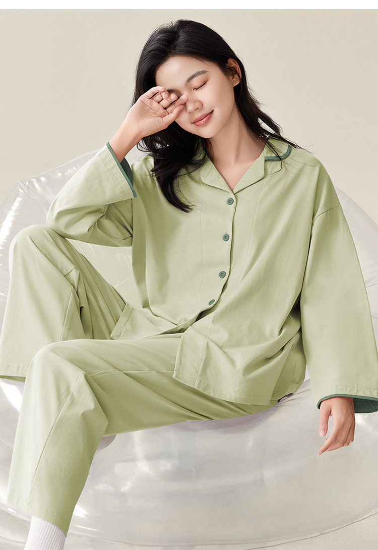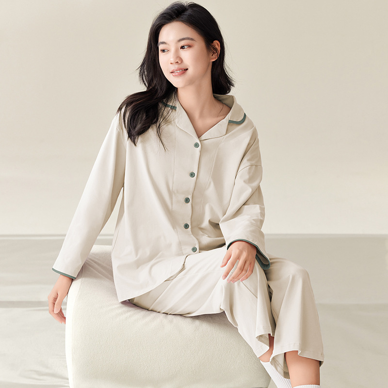 春秋季莫代尔睡衣女秋长袖开衫翻领宽松薄款女士家居服套装无印春