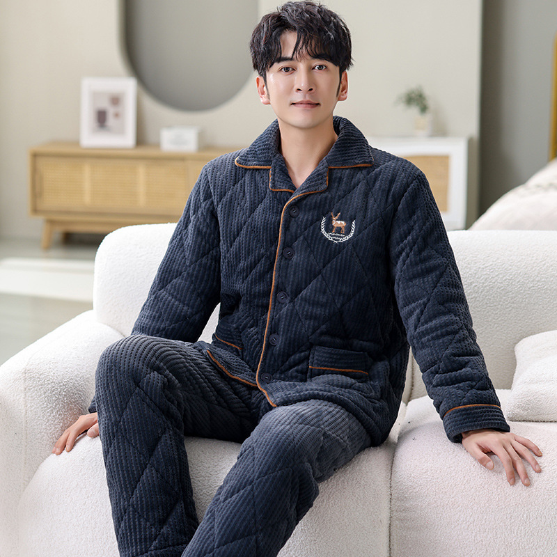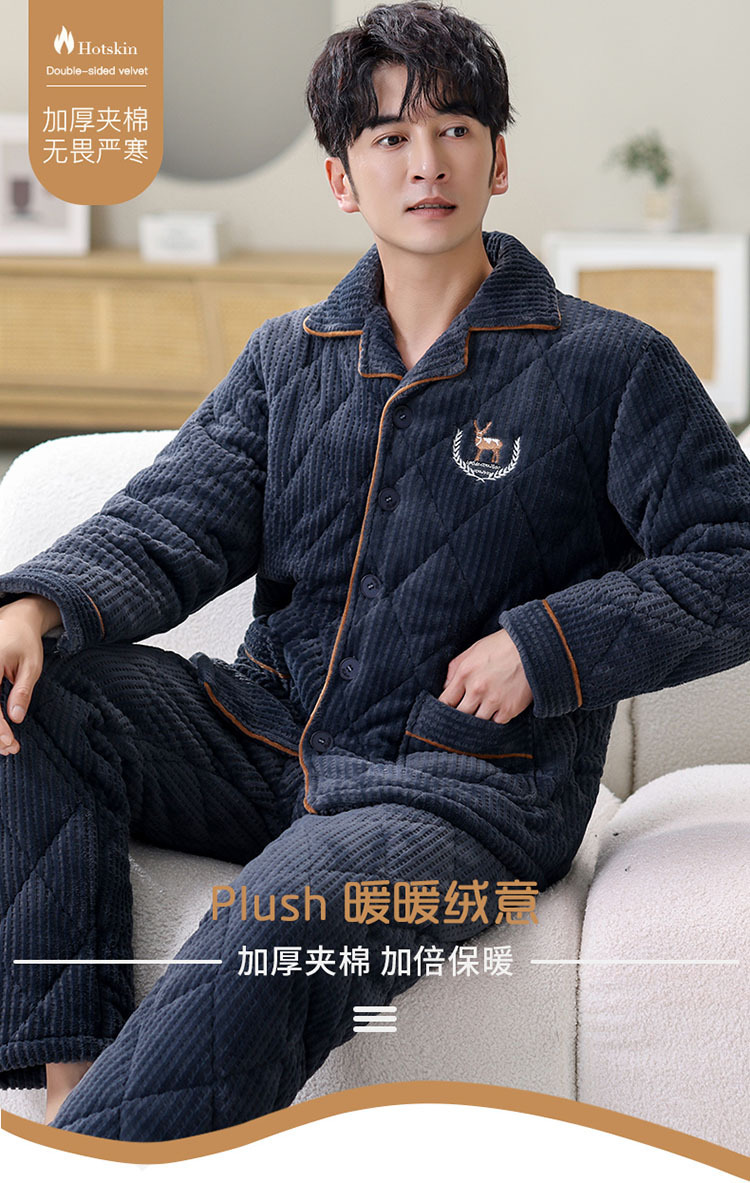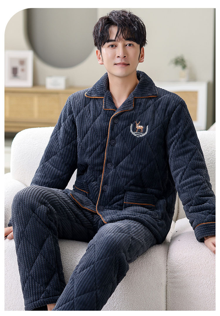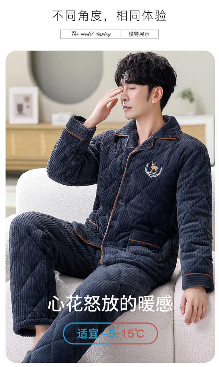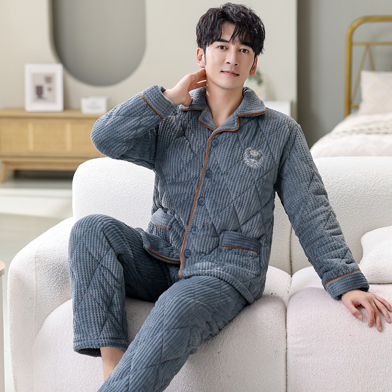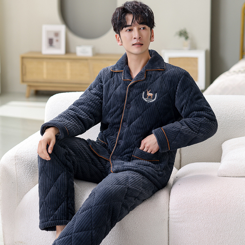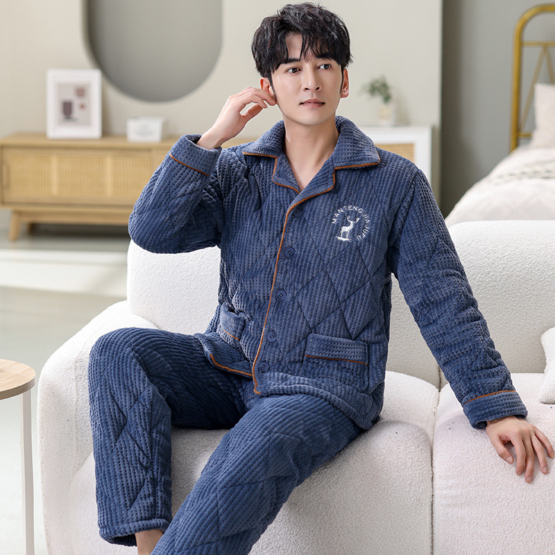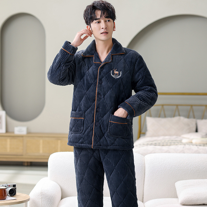 冬季珊瑚绒男士三层夹棉睡衣加厚加绒棉袄保暖牛奶绒男套装家居服